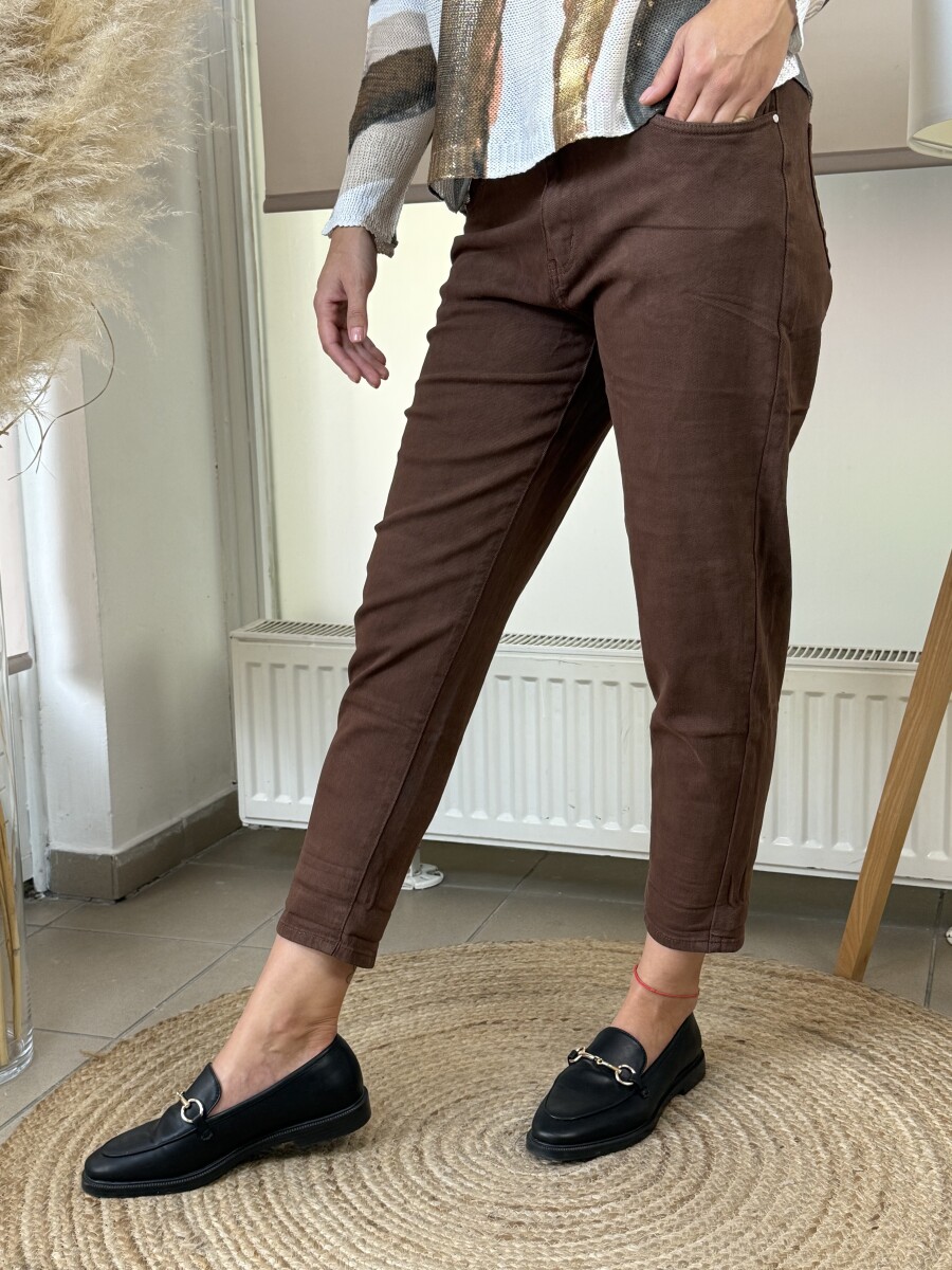Nem koptatott, normál szárhosszúságú, 5 zsebes , rugalmas anyagú, magasabb derekú, szűkülő szárú mom fit csokibarna farmer .