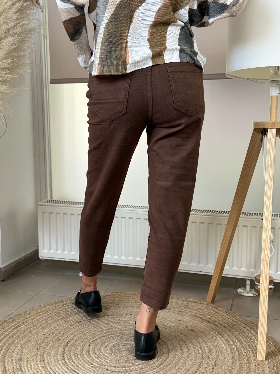 Nem koptatott, normál szárhosszúságú, 5 zsebes , rugalmas anyagú, magasabb derekú, szűkülő szárú mom fit csokibarna farmer .