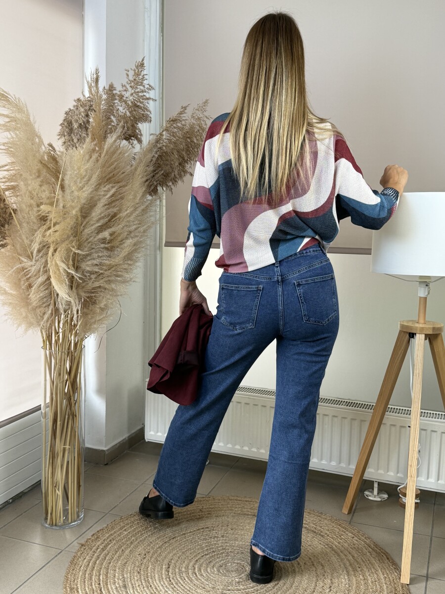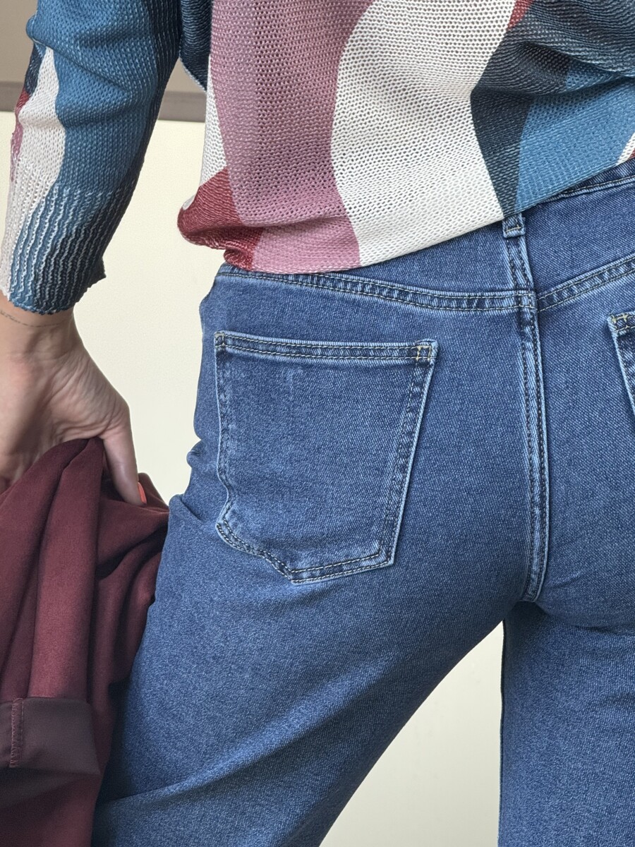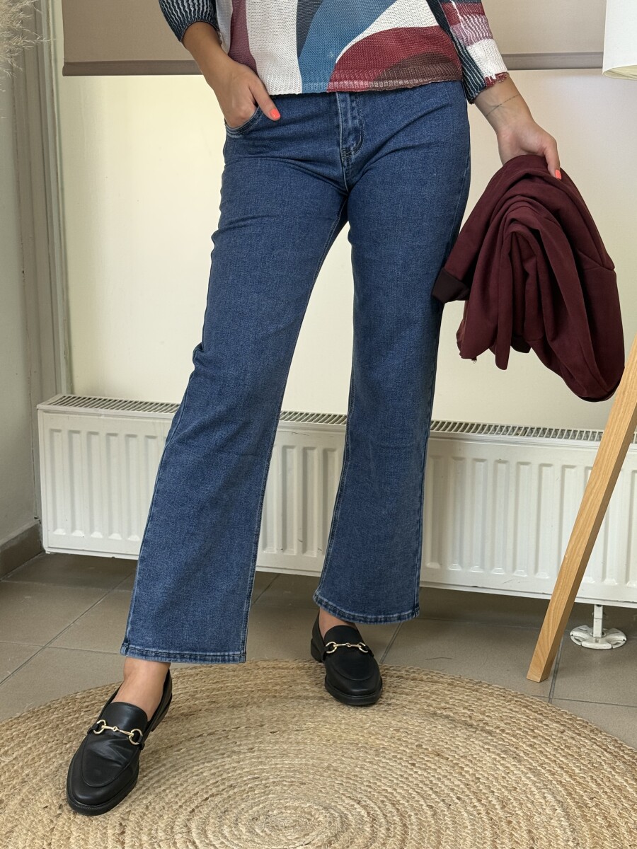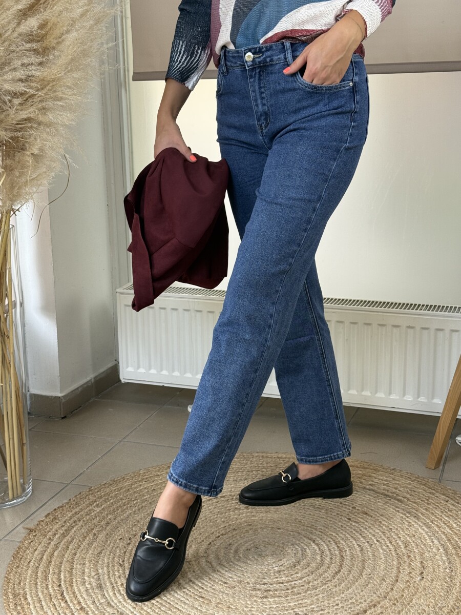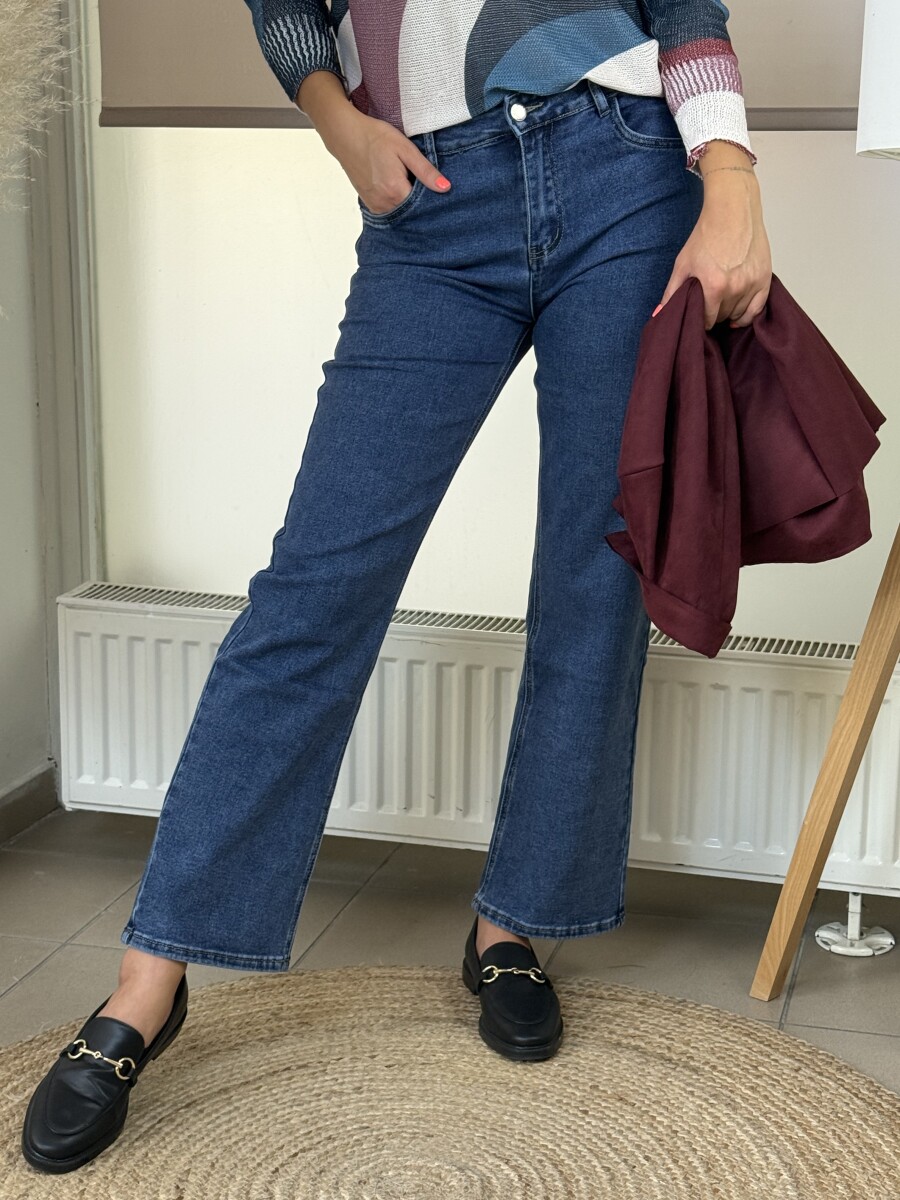 Mérsékelten koptatott, normál szárhosszúságú, 5 zsebes, rugalmas anyagú farmernadrág, magasabb derékkal, bő egyenes szárral .