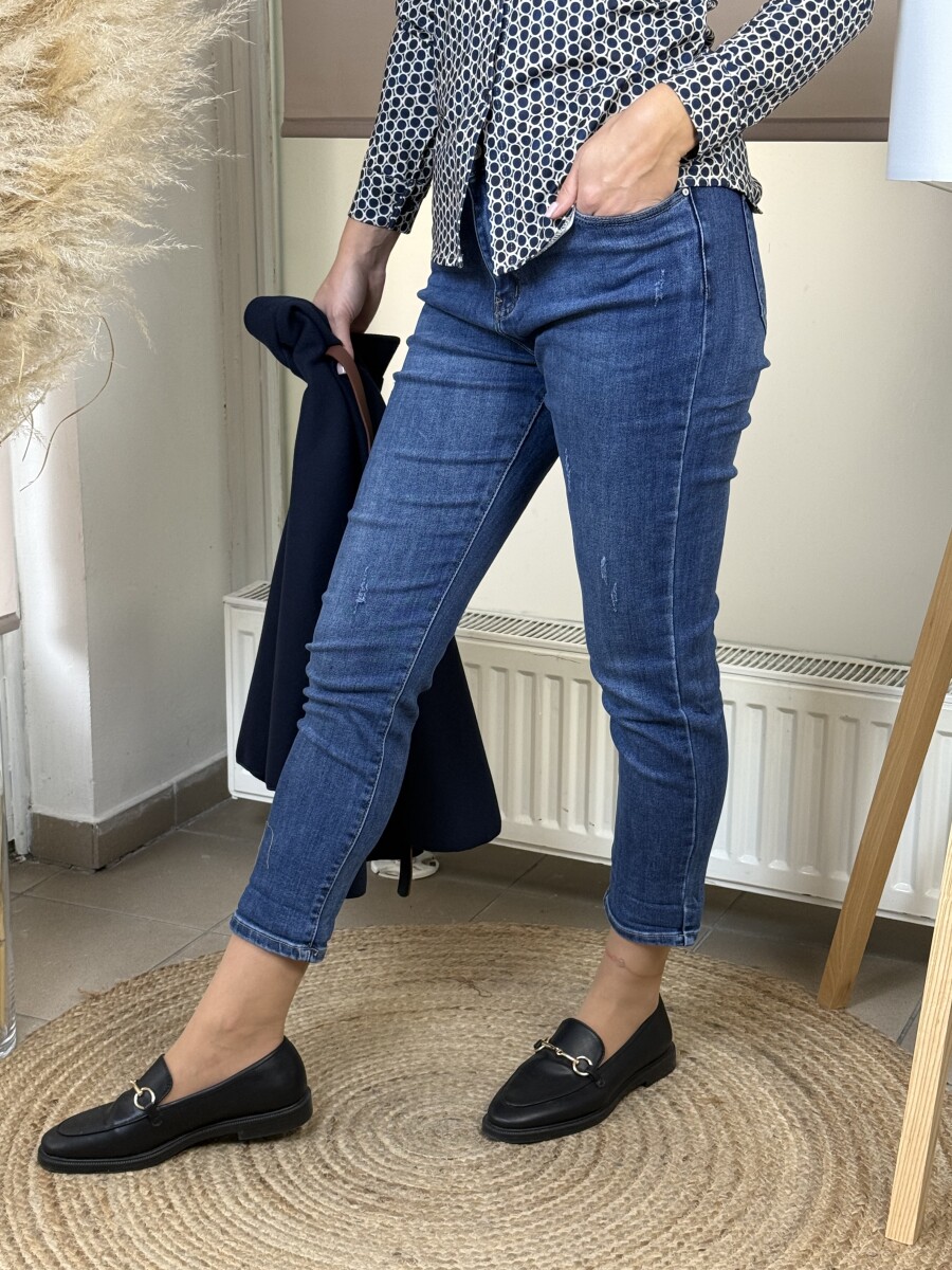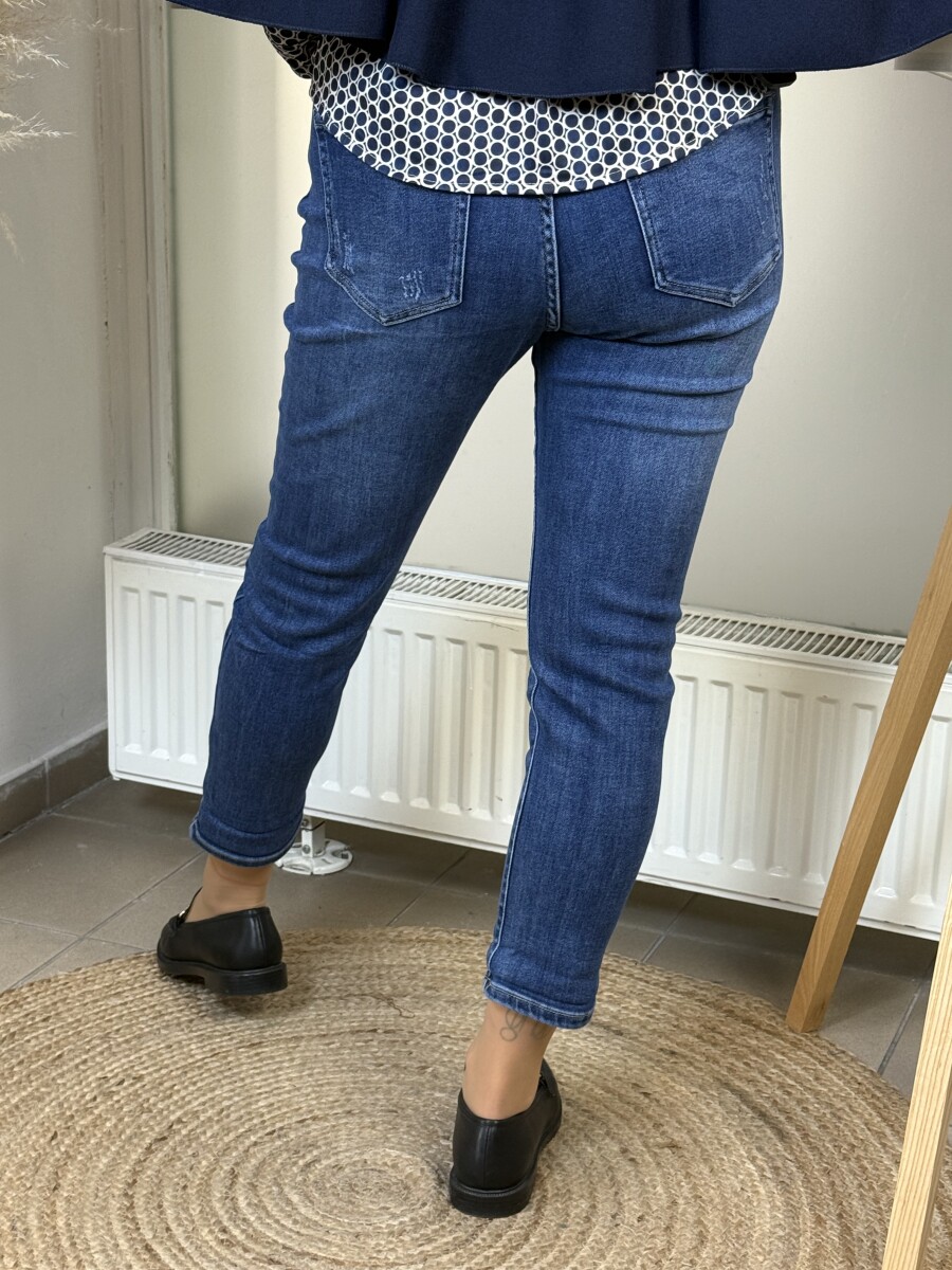 Mérsékelten koptatott, normál szárhosszúságú, 5 zsebes , rugalmas anyagú, magasabb derekú, szűkülő szárú mom fit farmer .