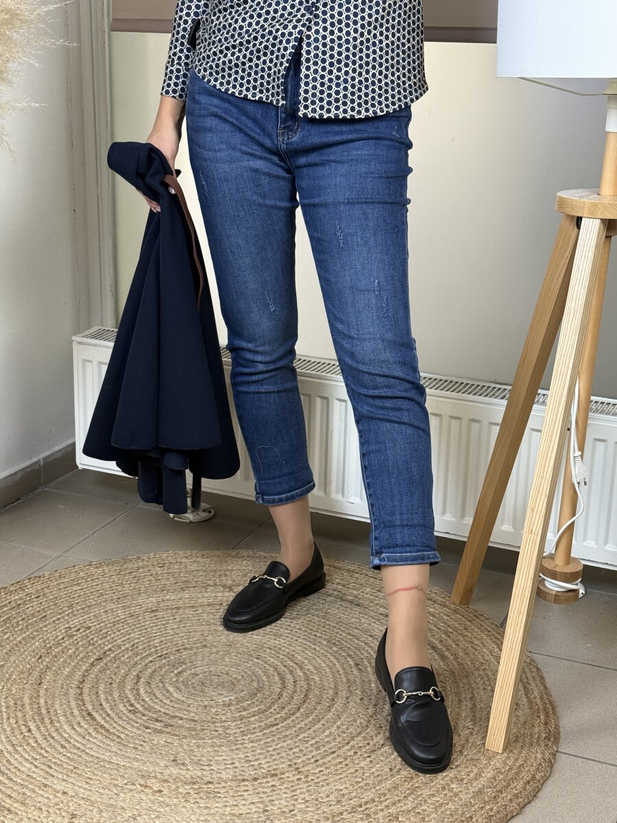 Mérsékelten koptatott, normál szárhosszúságú, 5 zsebes , rugalmas anyagú, magasabb derekú, szűkülő szárú mom fit farmer .