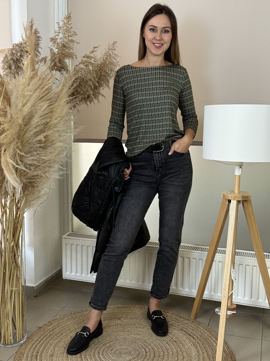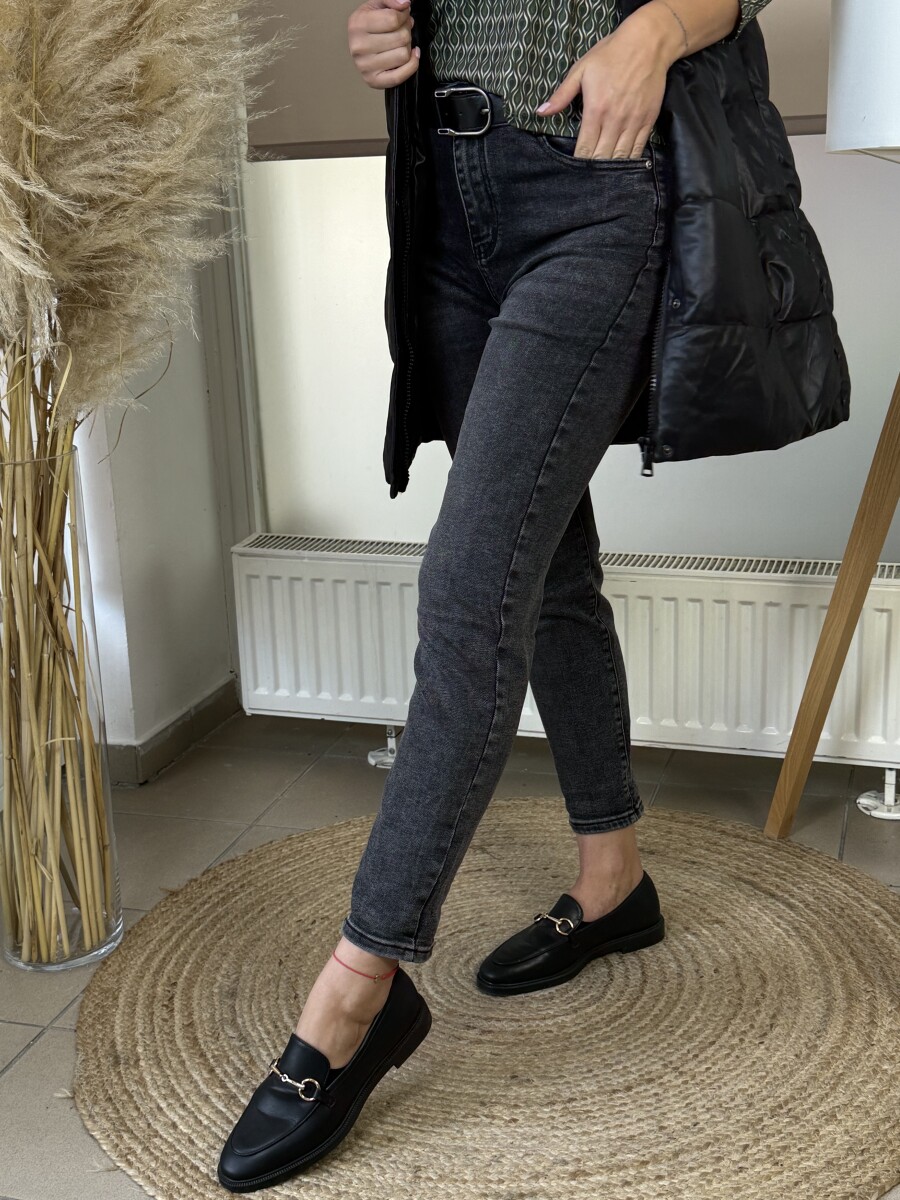Mérsékelten koptatott, normál szárhosszúságú, 5 zsebes , rugalmas anyagú, magasabb derekú, szűkülő szárú mom fit farmer övvel .