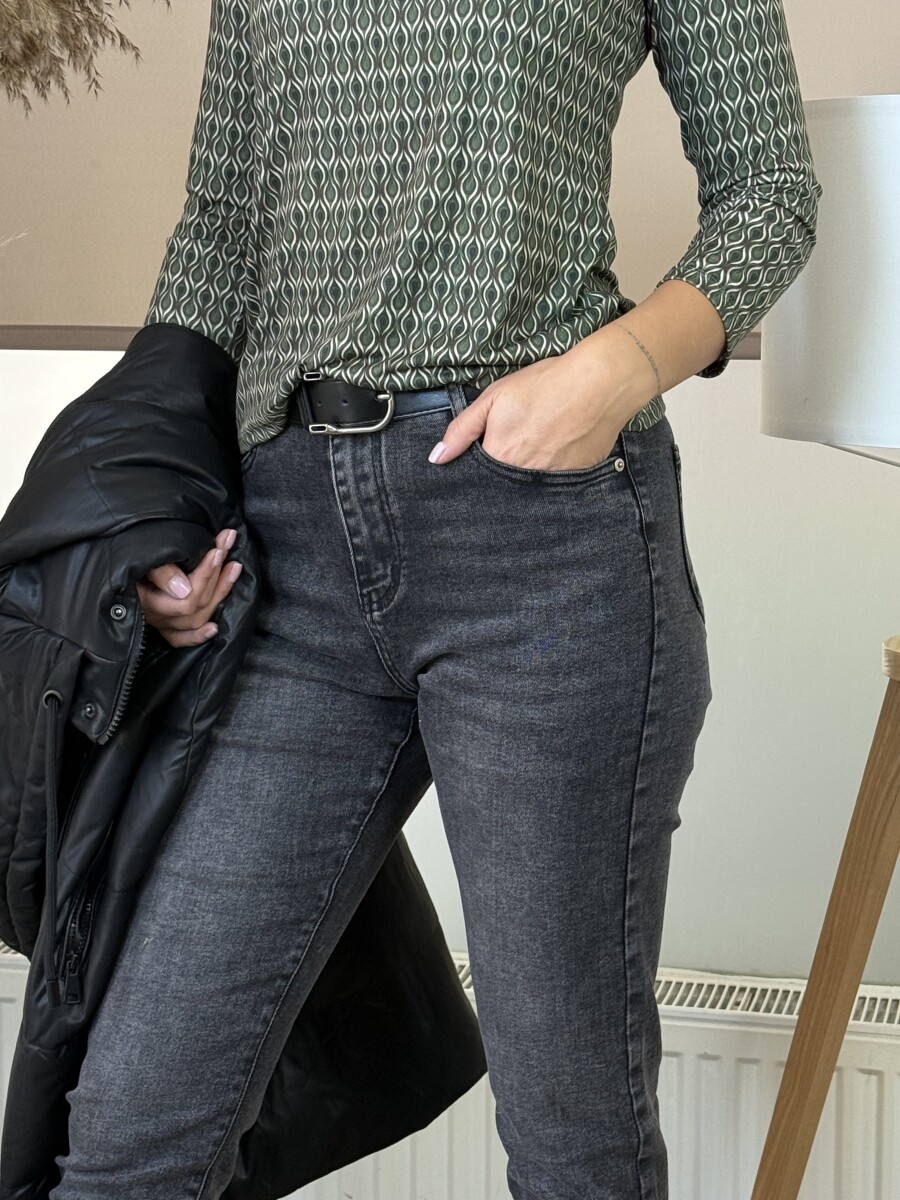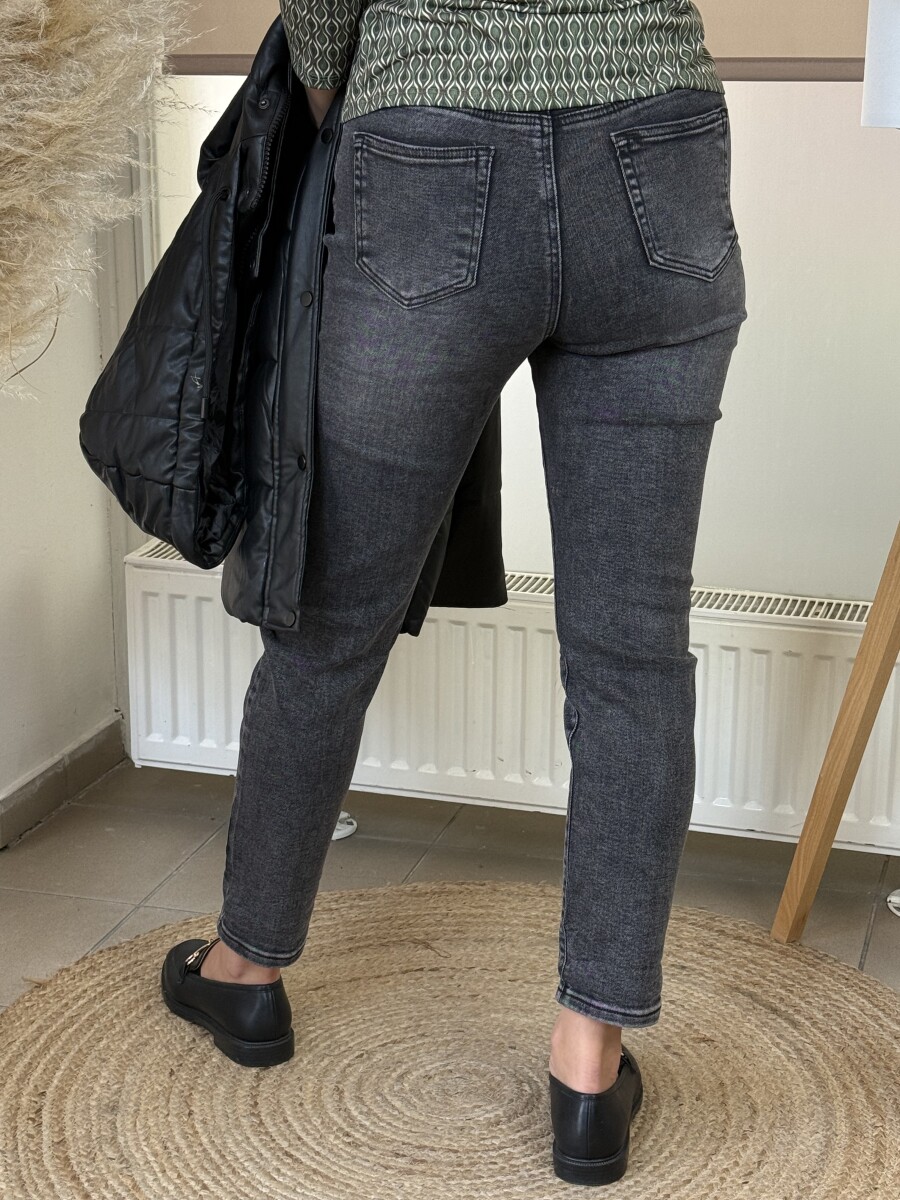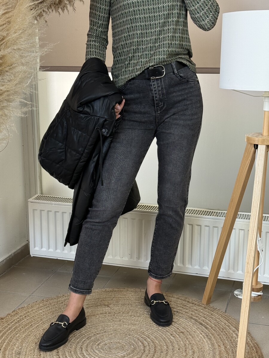 Mérsékelten koptatott, normál szárhosszúságú, 5 zsebes , rugalmas anyagú, magasabb derekú, szűkülő szárú mom fit farmer övvel .