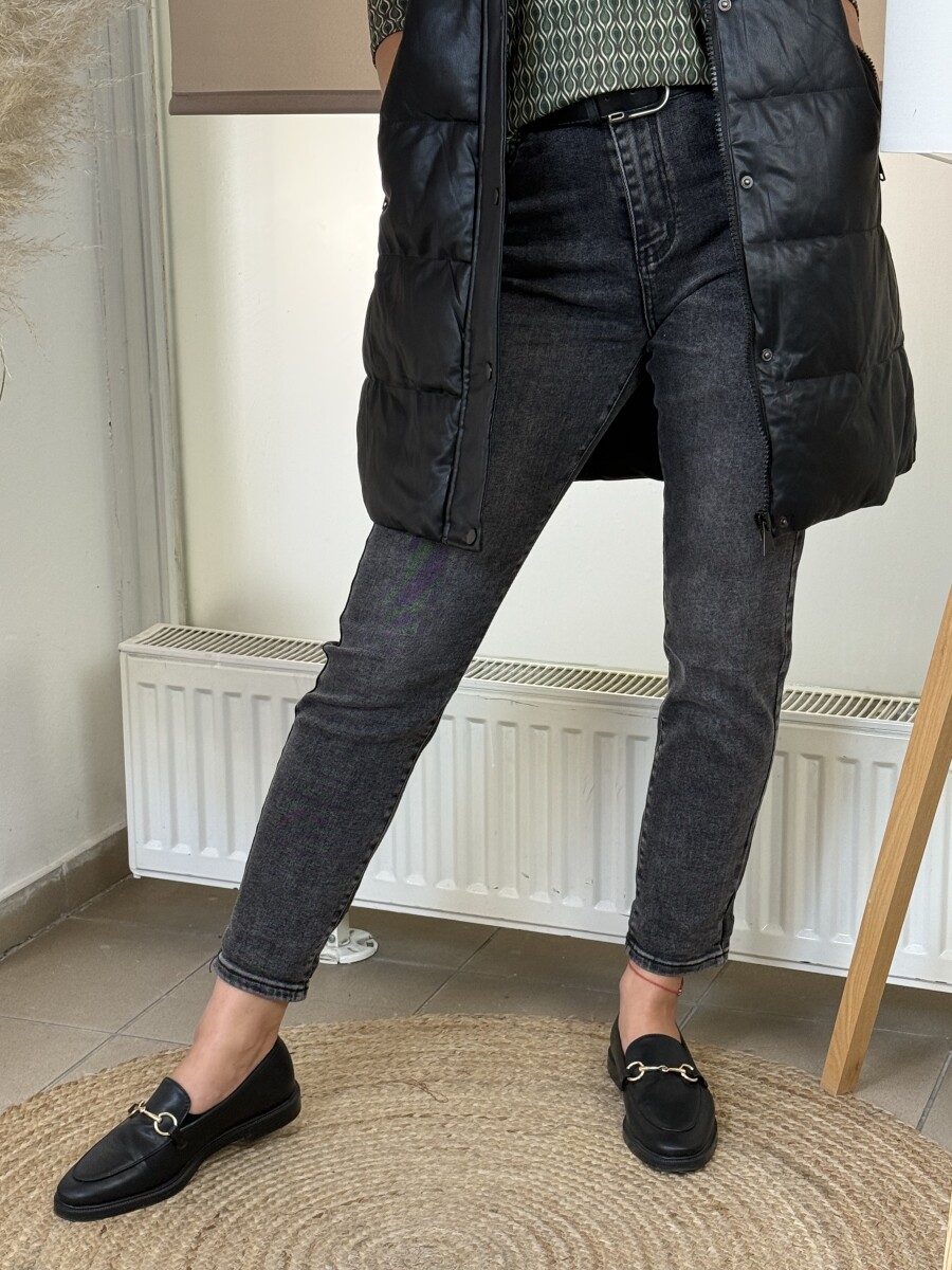 Mérsékelten koptatott, normál szárhosszúságú, 5 zsebes , rugalmas anyagú, magasabb derekú, szűkülő szárú mom fit farmer övvel .