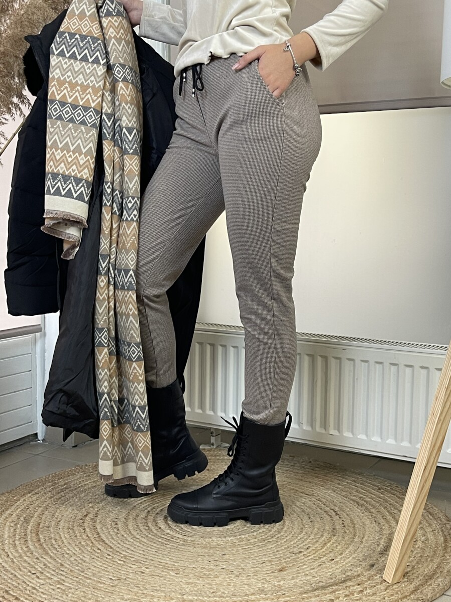 Vastag anyagú, szűkülő szárú, gumis derekú, megkötős derekú, apró mintás, mérsékelten rugalmas anyagú két vágott svédzsebes hosszú szövetnadrág.