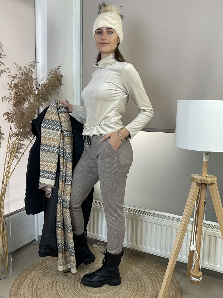 Vastag anyagú, szűkülő szárú, gumis derekú, megkötős derekú, apró mintás, mérsékelten rugalmas anyagú két vágott svédzsebes hosszú szövetnadrág.