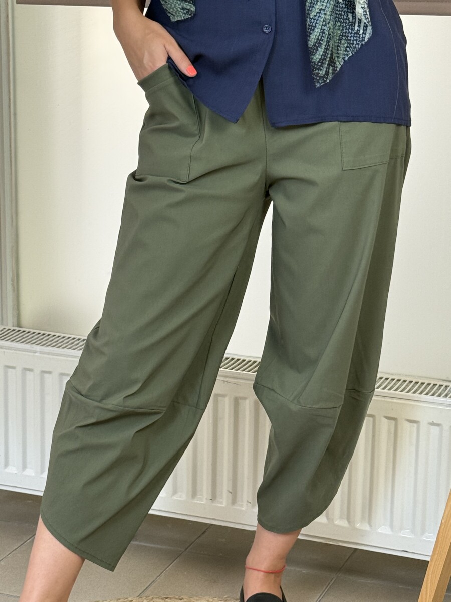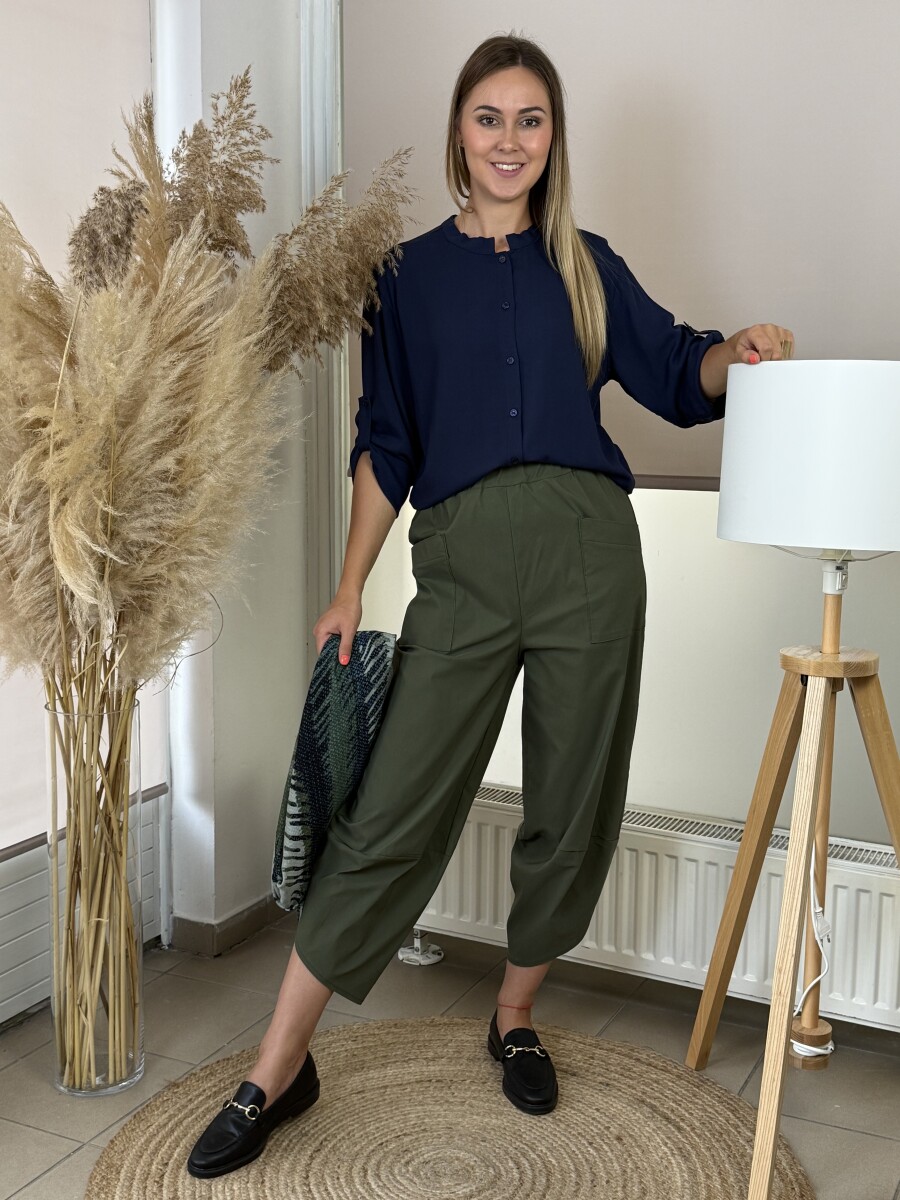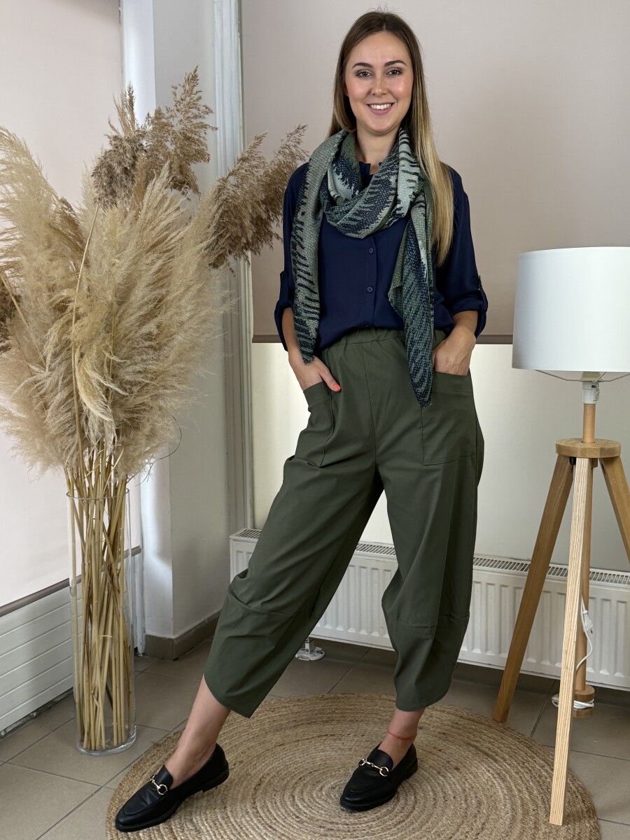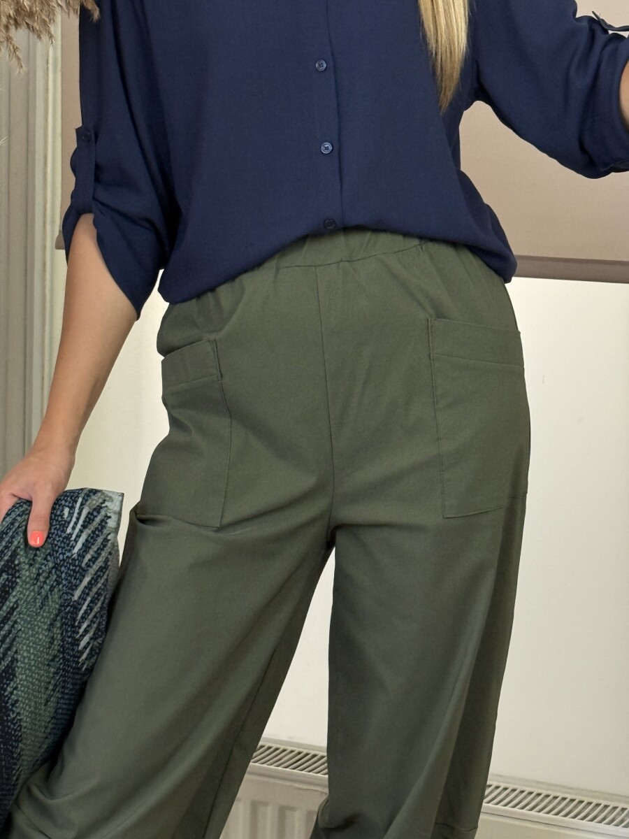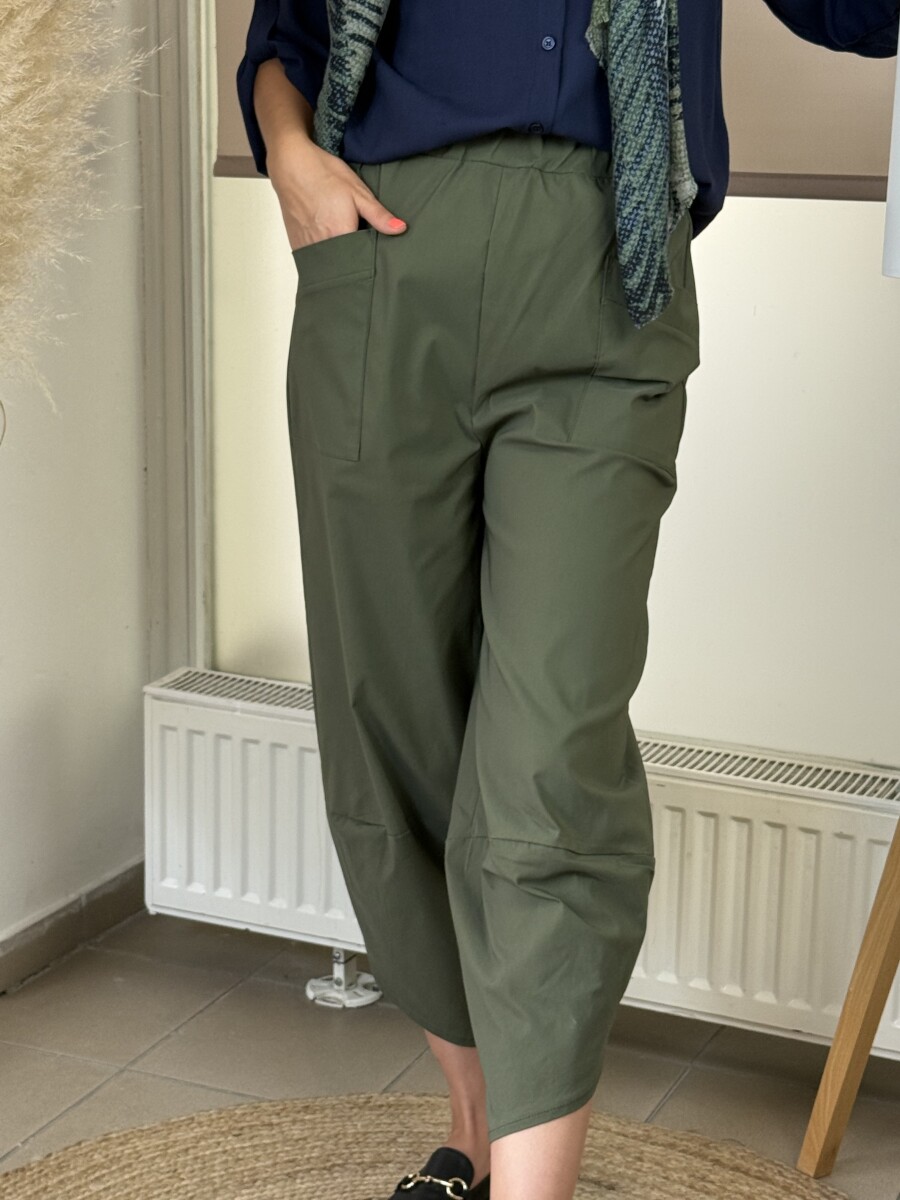 Bővebb szárú, szára alul buggyos, rugalmas anyagú, gumis derekú, elöl két nagy zsebes, kényelmes laza viseletű nadrág .