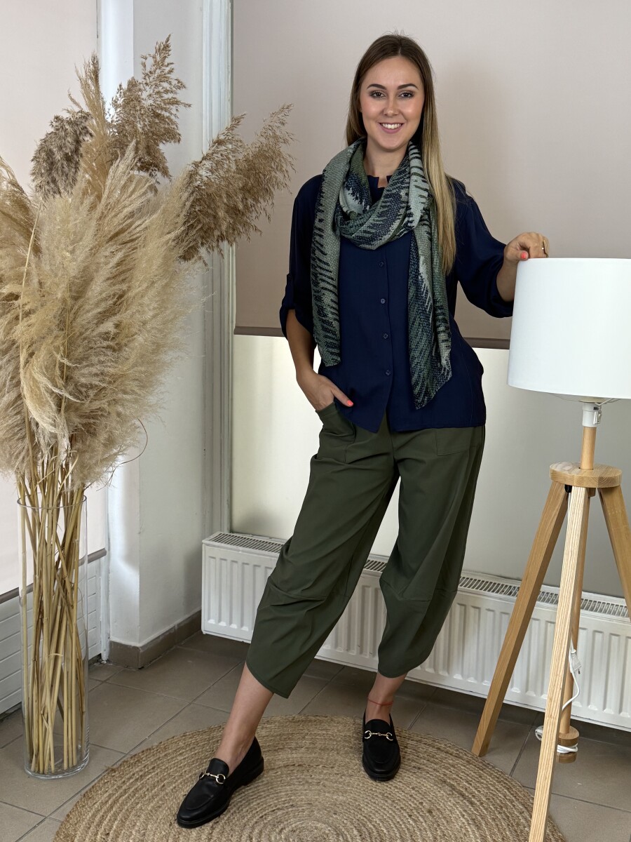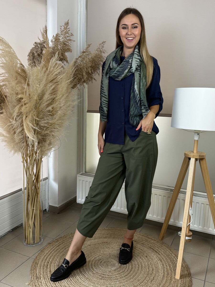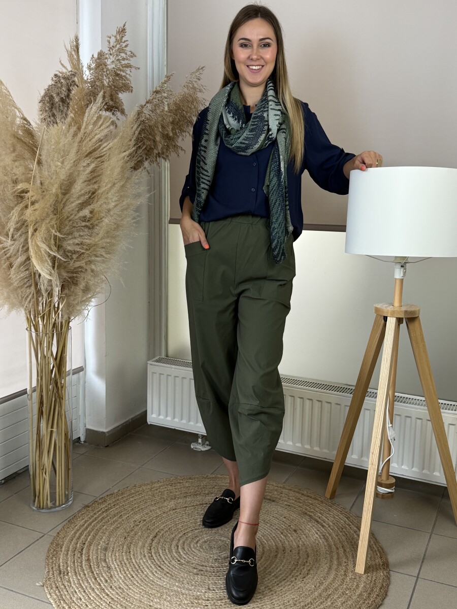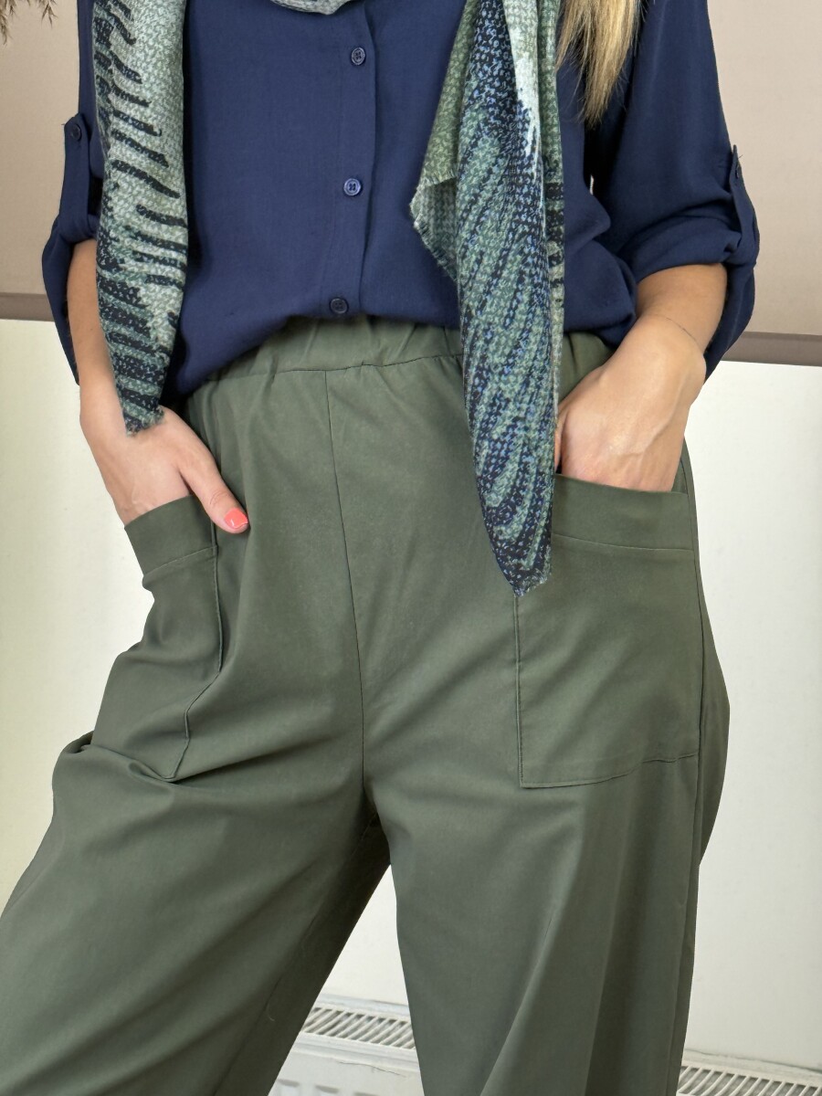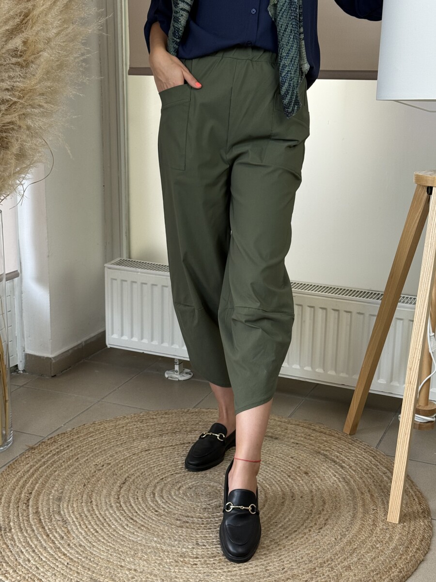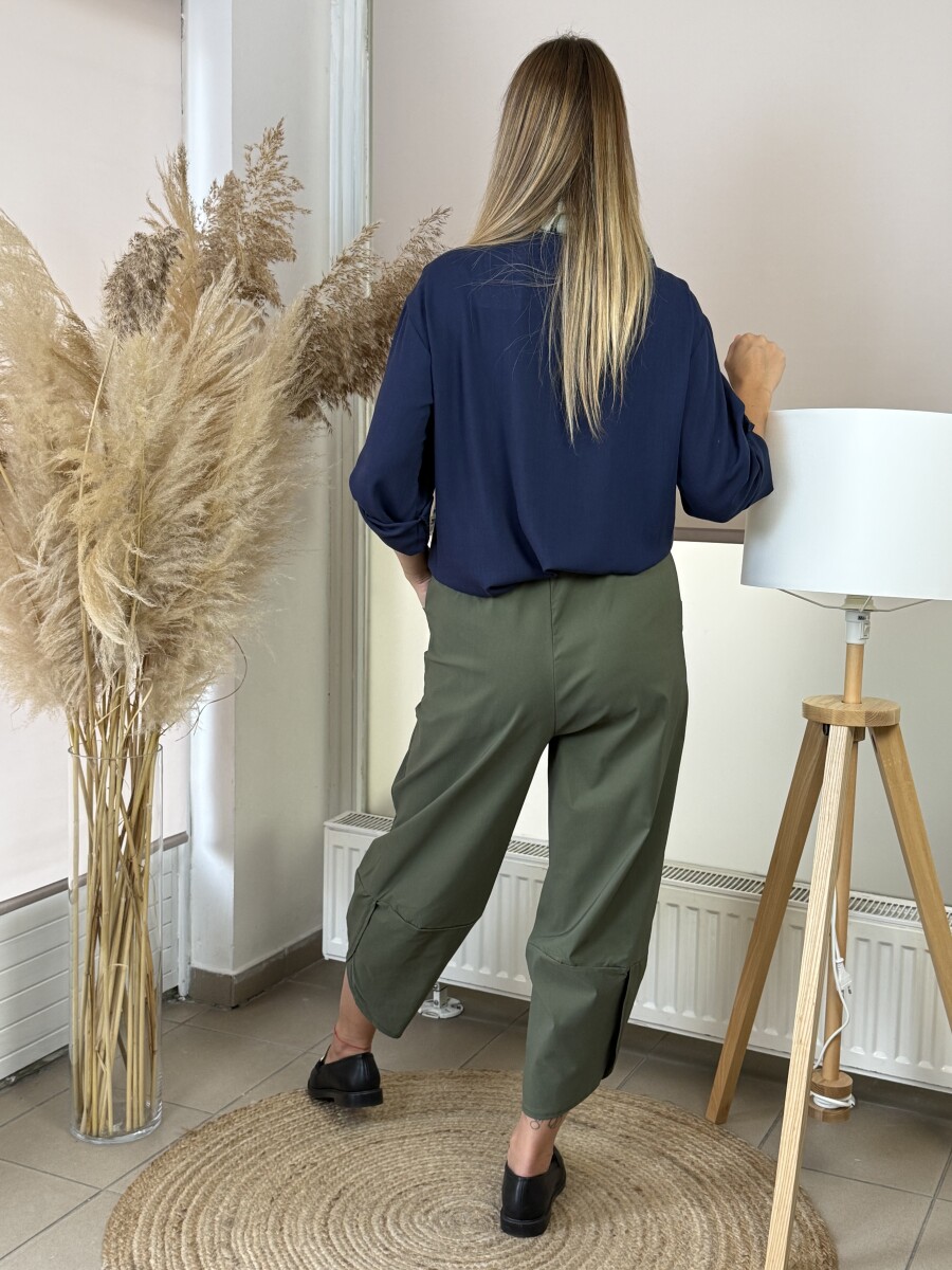 Bővebb szárú, szára alul buggyos, rugalmas anyagú, gumis derekú, elöl két nagy zsebes, kényelmes laza viseletű nadrág .