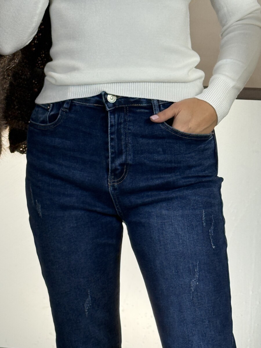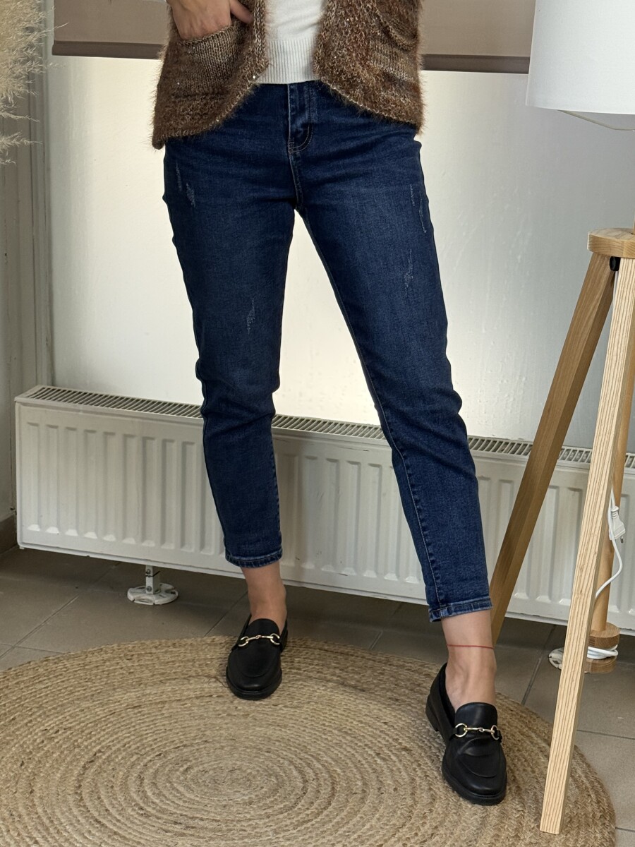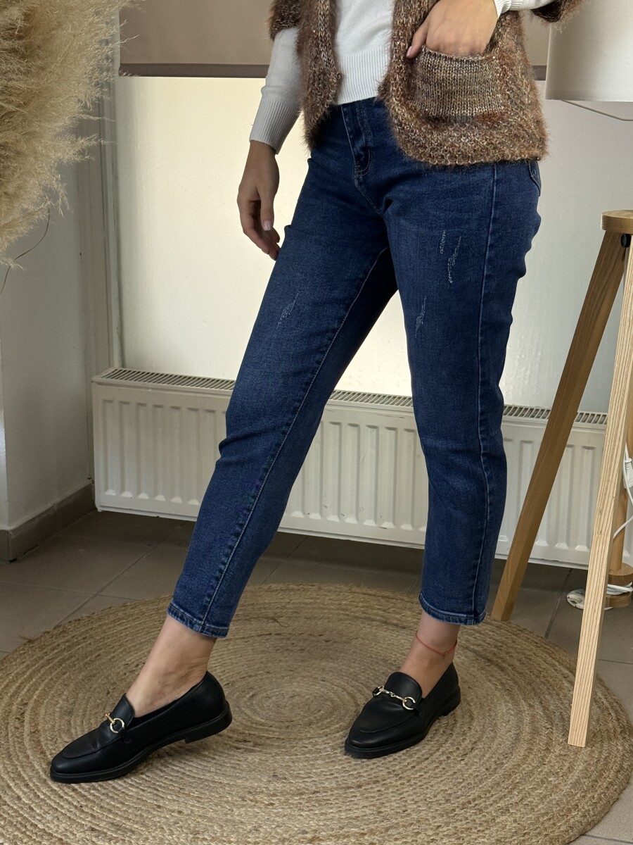 Mérsékelten koptatott, normál szárhosszúságú, 5 zsebes , rugalmas anyagú, magasabb derekú, szűkülő szárú karmolt mom fit farmer .