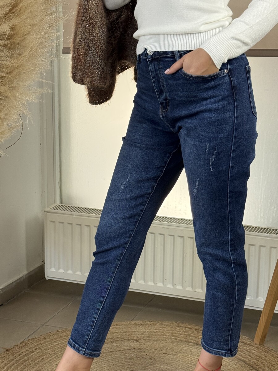 Mérsékelten koptatott, normál szárhosszúságú, 5 zsebes , rugalmas anyagú, magasabb derekú, szűkülő szárú karmolt mom fit farmer .
