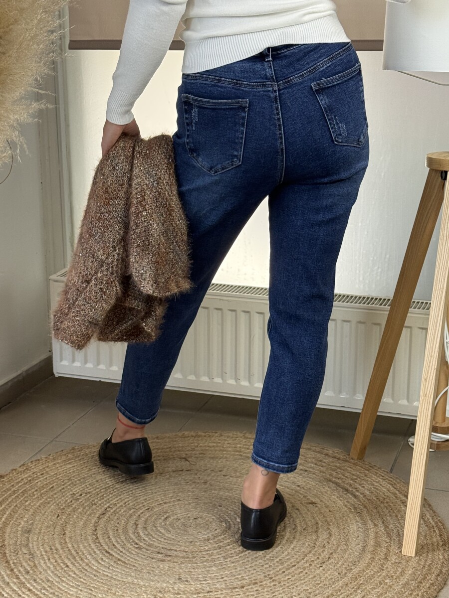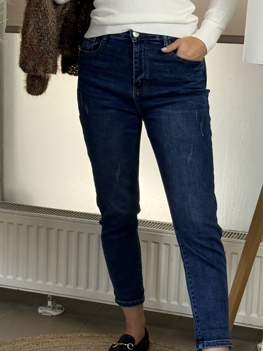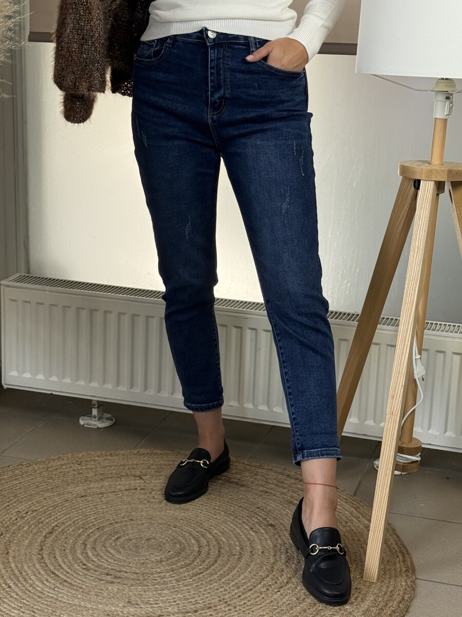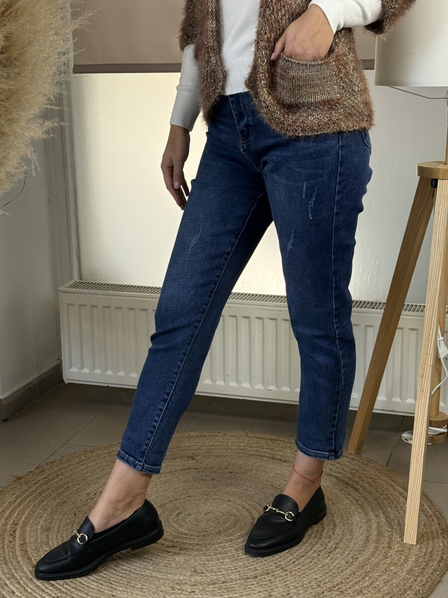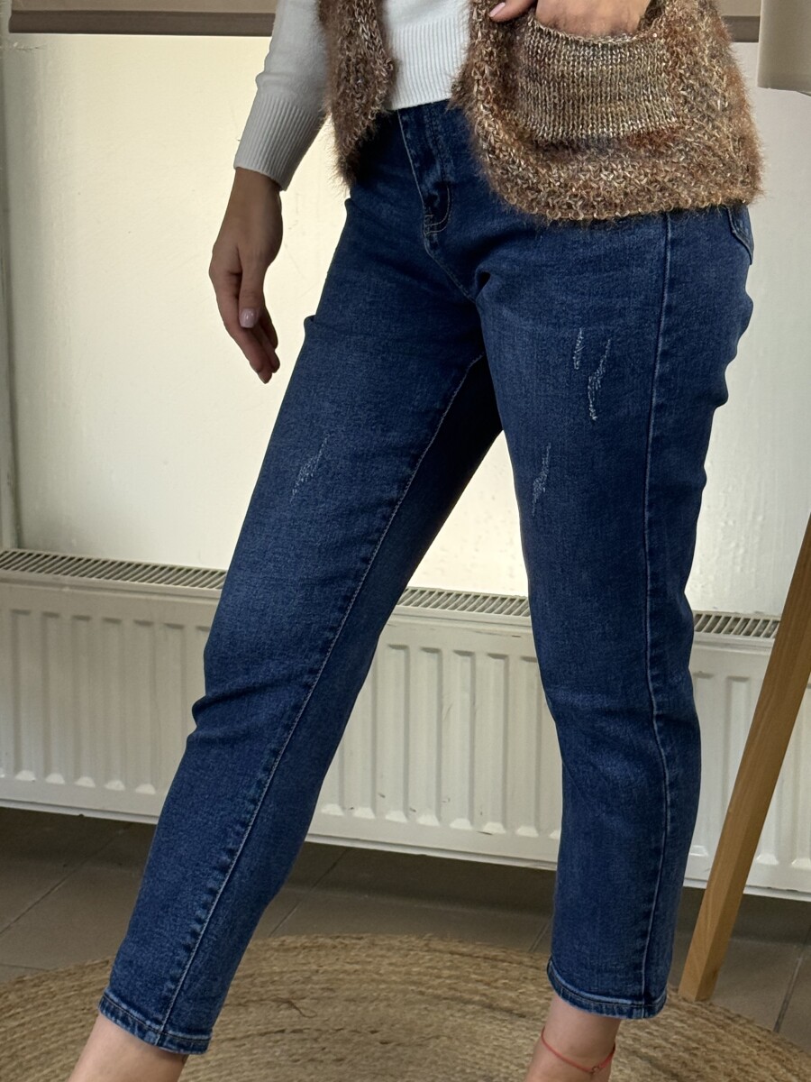 Mérsékelten koptatott, normál szárhosszúságú, 5 zsebes , rugalmas anyagú, magasabb derekú, szűkülő szárú karmolt mom fit farmer .