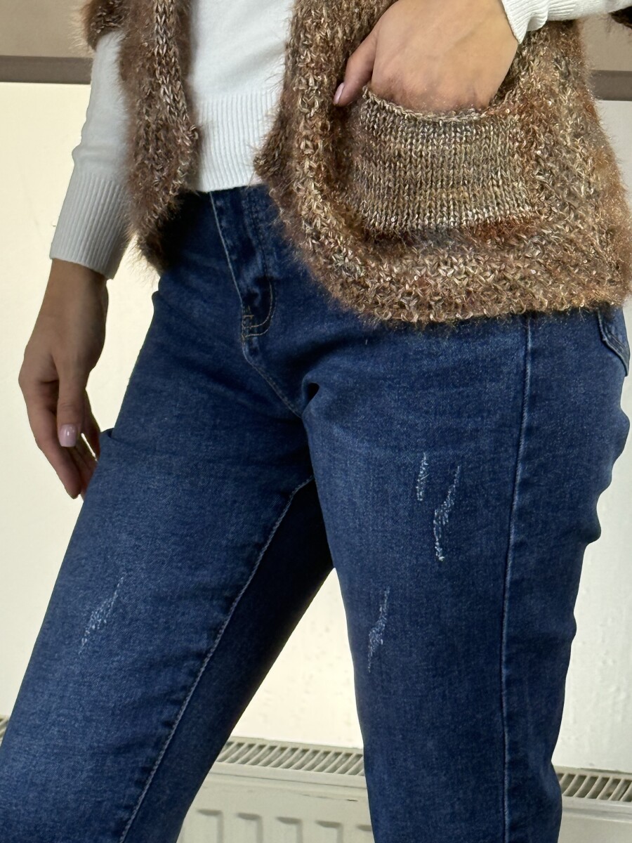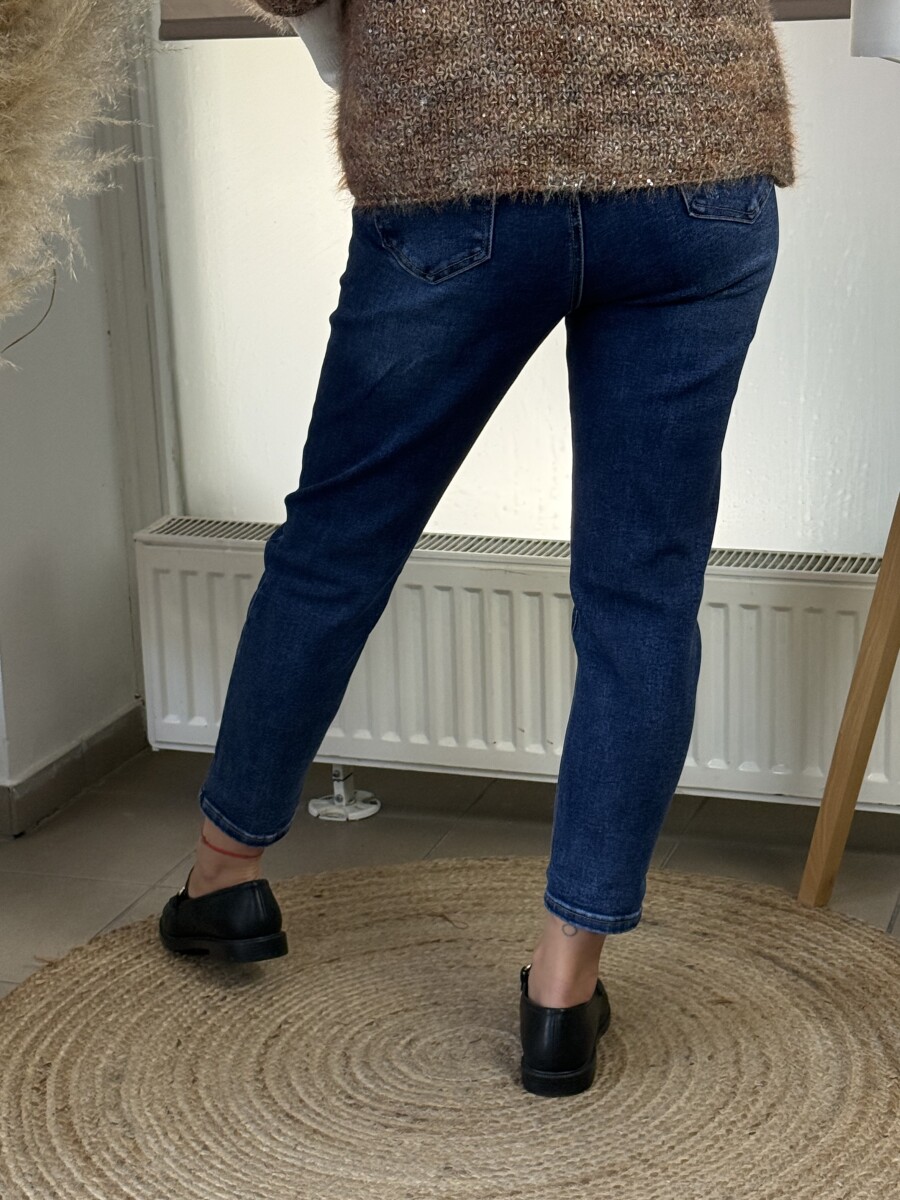 Mérsékelten koptatott, normál szárhosszúságú, 5 zsebes , rugalmas anyagú, magasabb derekú, szűkülő szárú karmolt mom fit farmer .