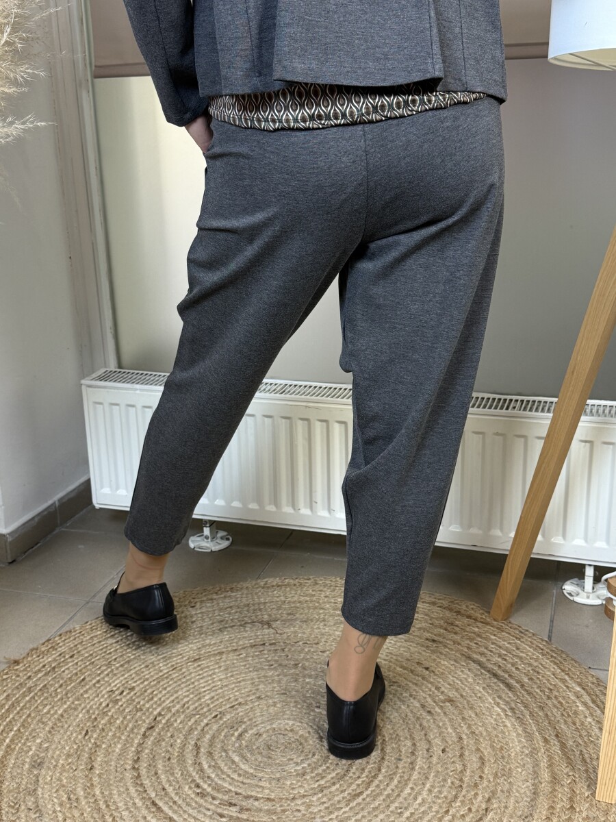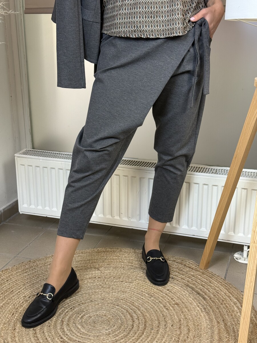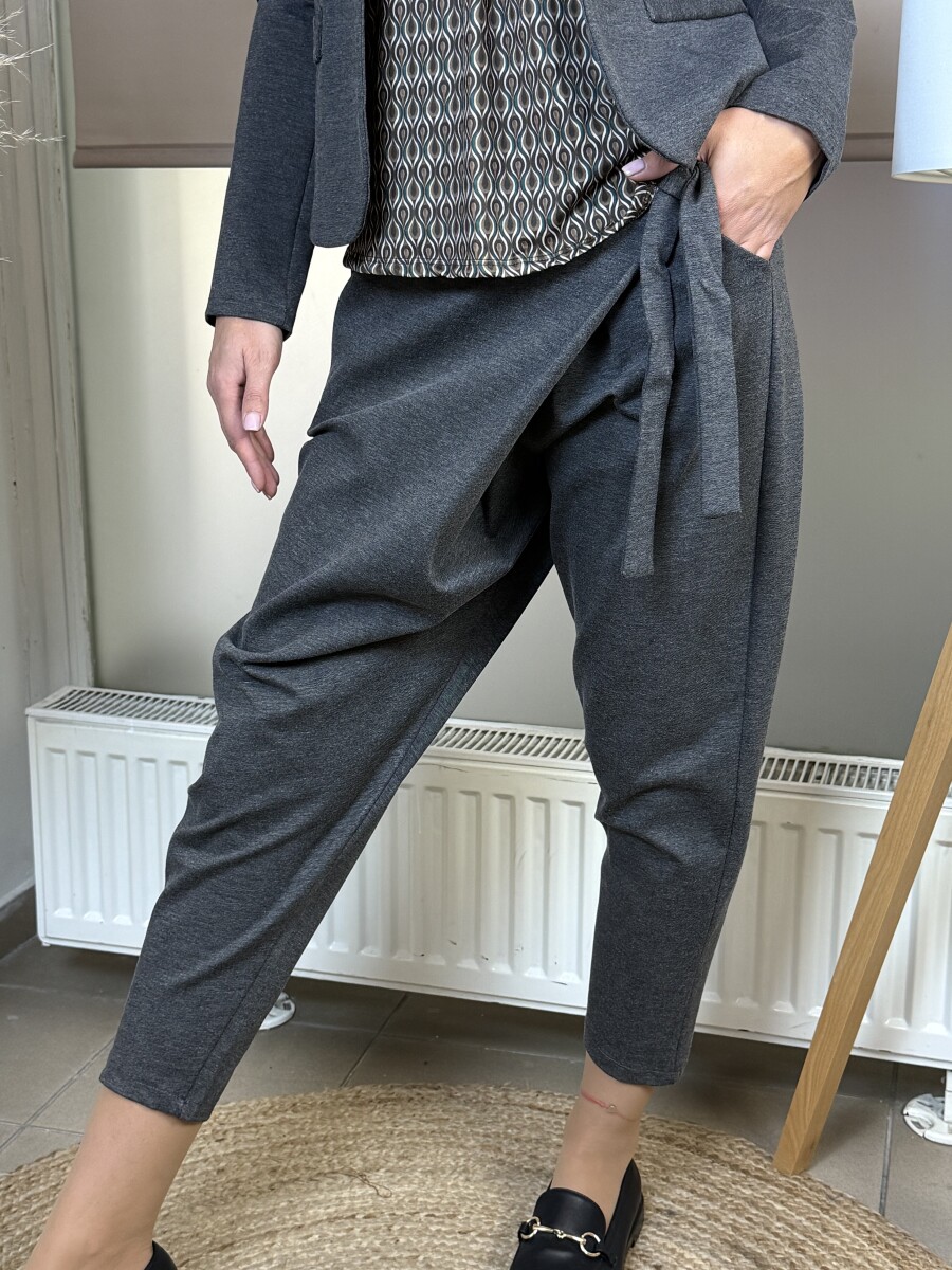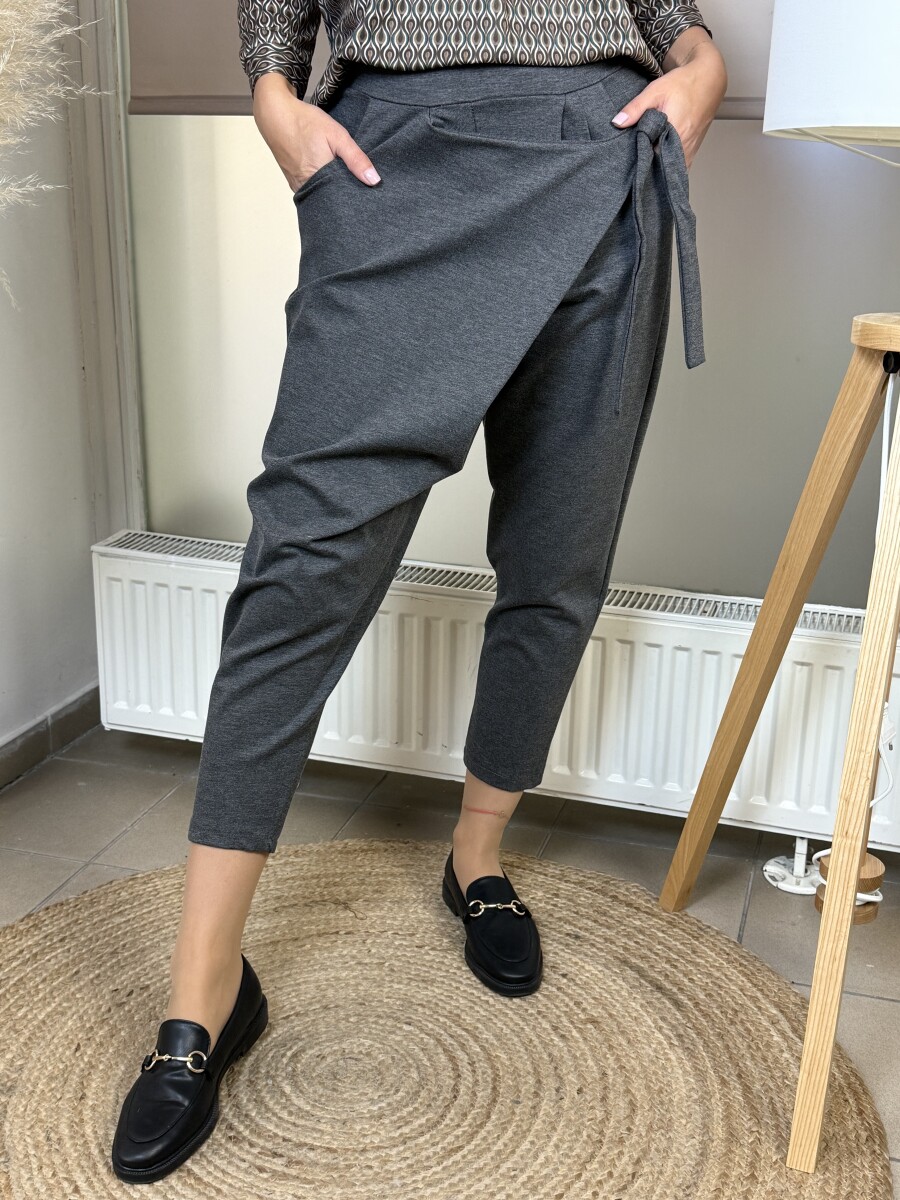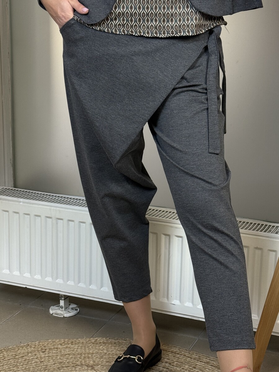 Magas gumis derekú, elől csípett, szűkülő szárú, oldalán zsebes, elől átlapolt, kötővel záródó, bővebb fazonú nadrág.