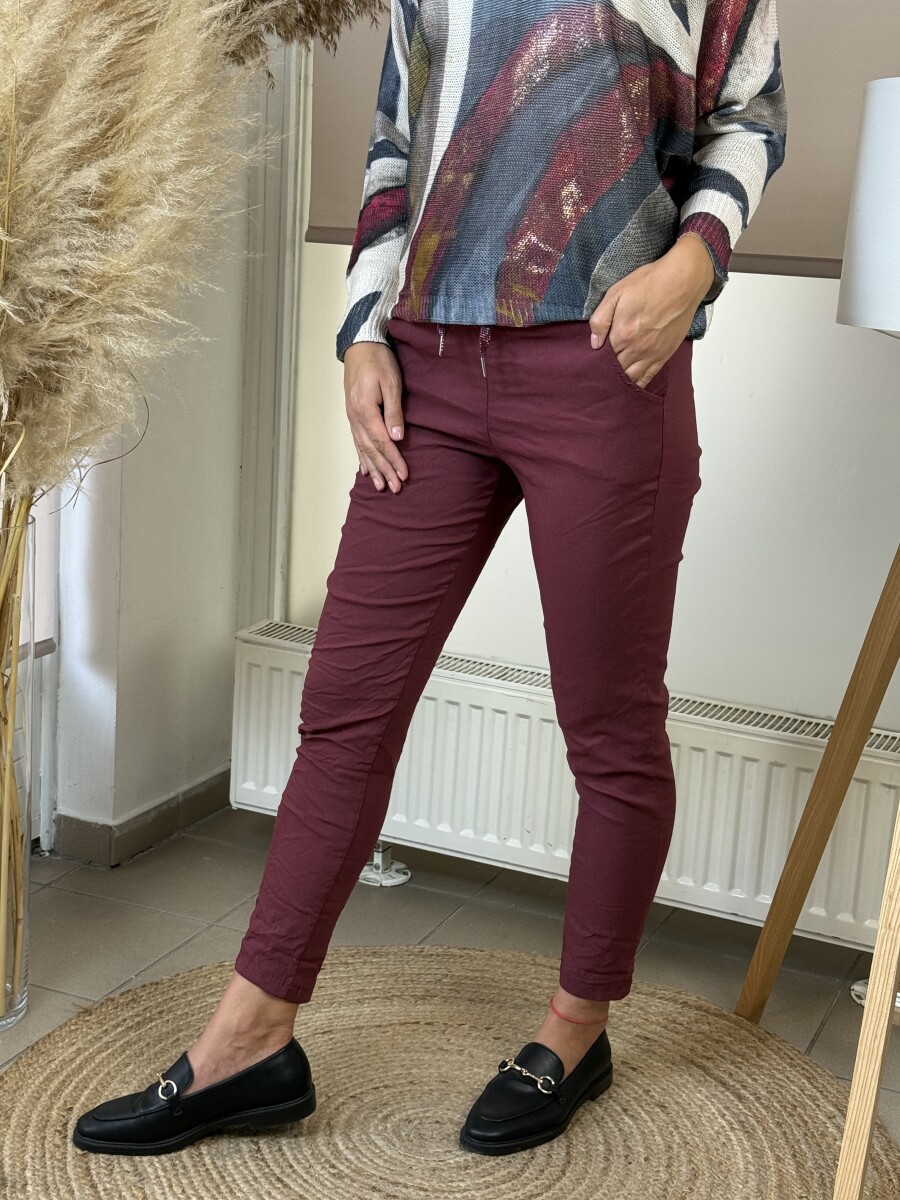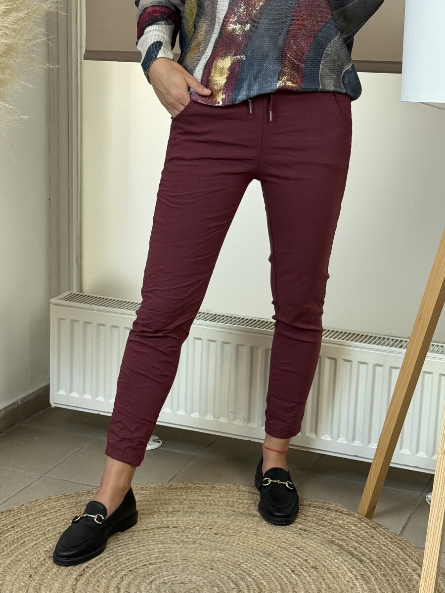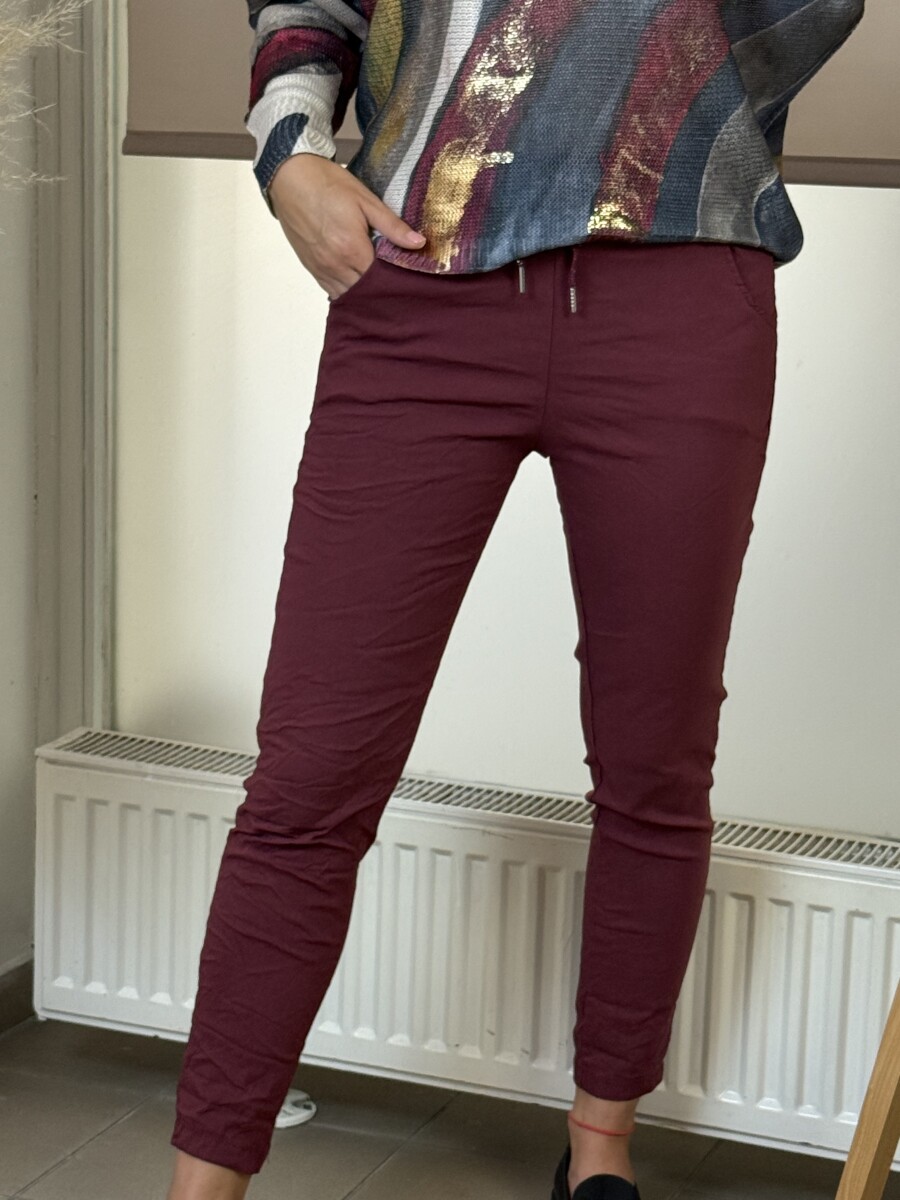 Gyűrt hatású, rugalmas anyagú, gumis és megkötős derekú, elején 2 svéd zsebes, laza, kényelmes viseletű nadrág .