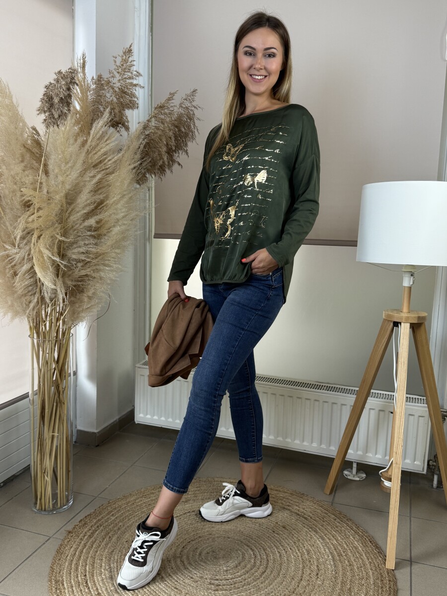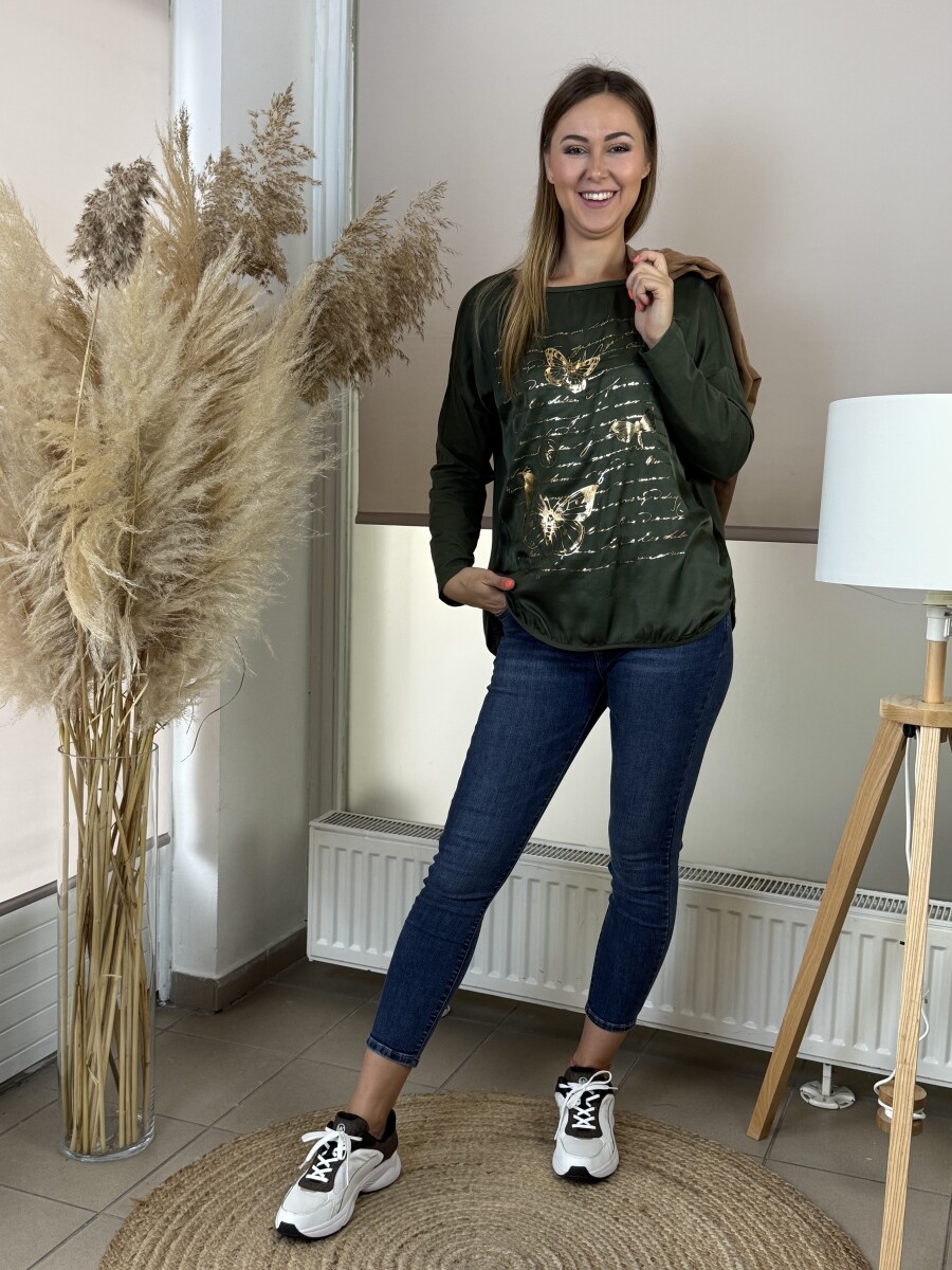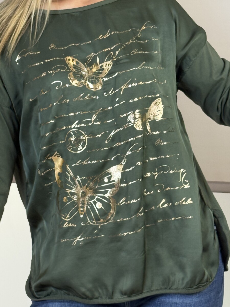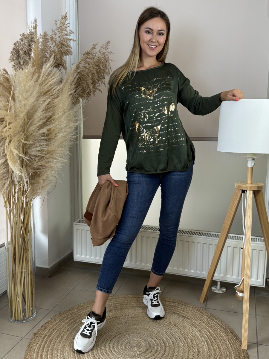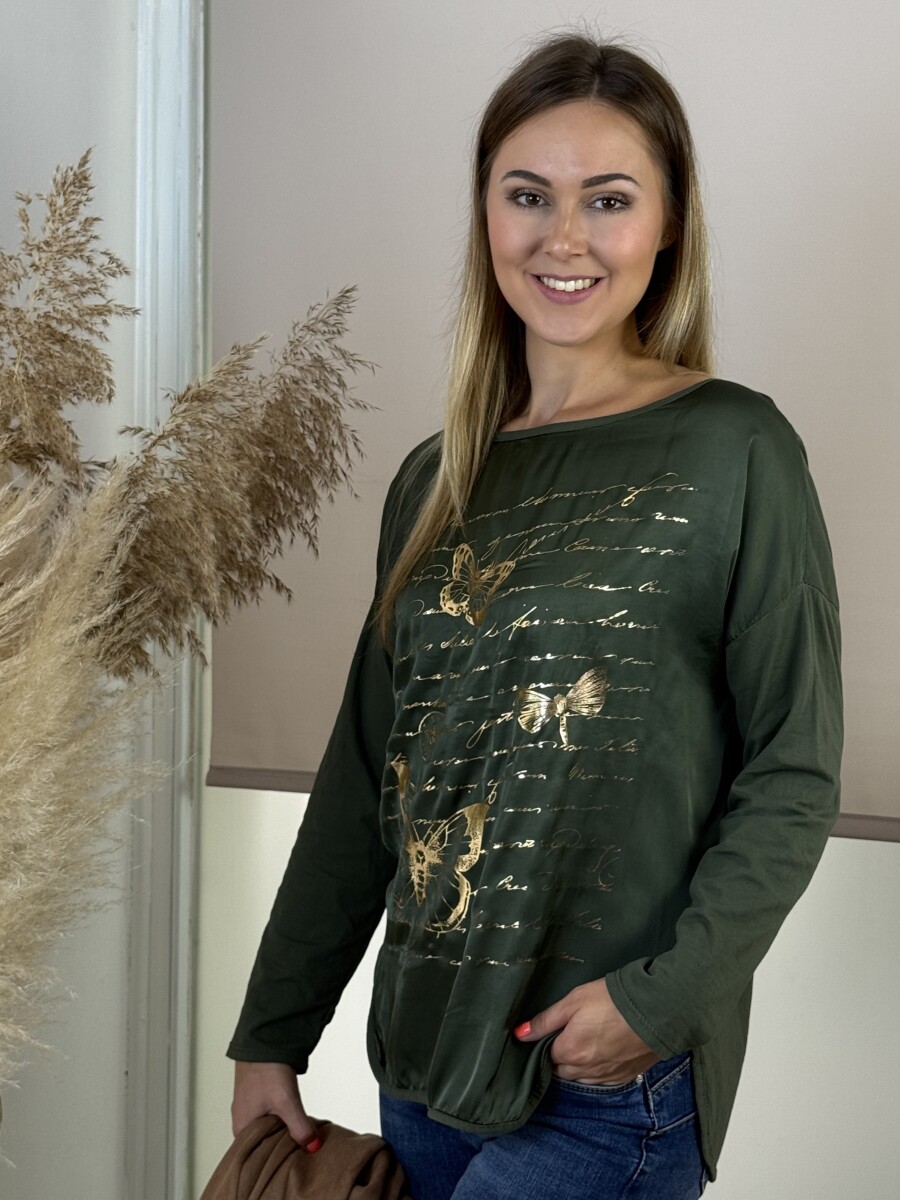 Pamut, lezser fazonú, T ujjas, csónak nyakkivágású, elején rövidebb, hátul hosszabb, 20oldalt sliccelt, arany mintás hosszú ujjú póló .