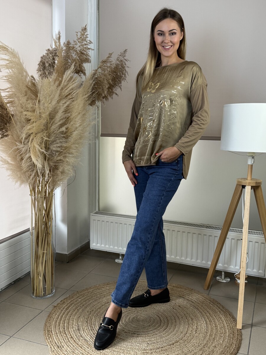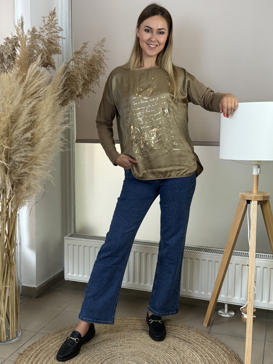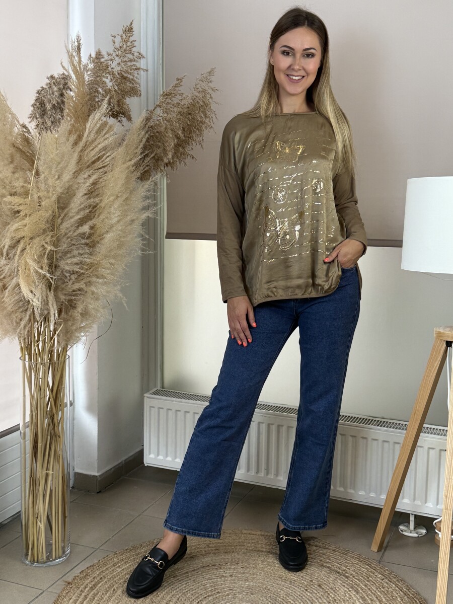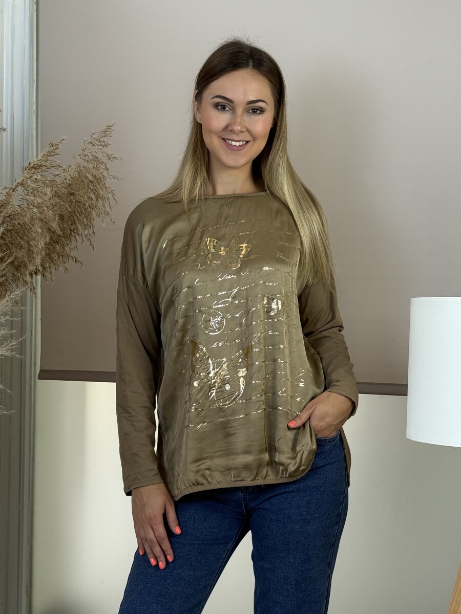 Pamut, lezser fazonú, T ujjas, csónak nyakkivágású, elején rövidebb, hátul hosszabb, 20oldalt sliccelt, arany mintás hosszú ujjú póló .