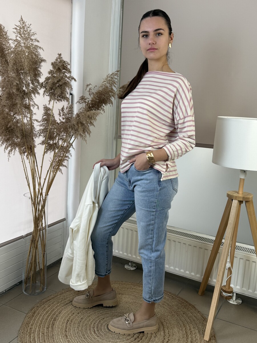 T ujjas, csónak nyakú, egyenes fazonú, oldalt sliccelt, elöl-hátul hosszabb, hosszú ujjú, csíkos pamut póló.