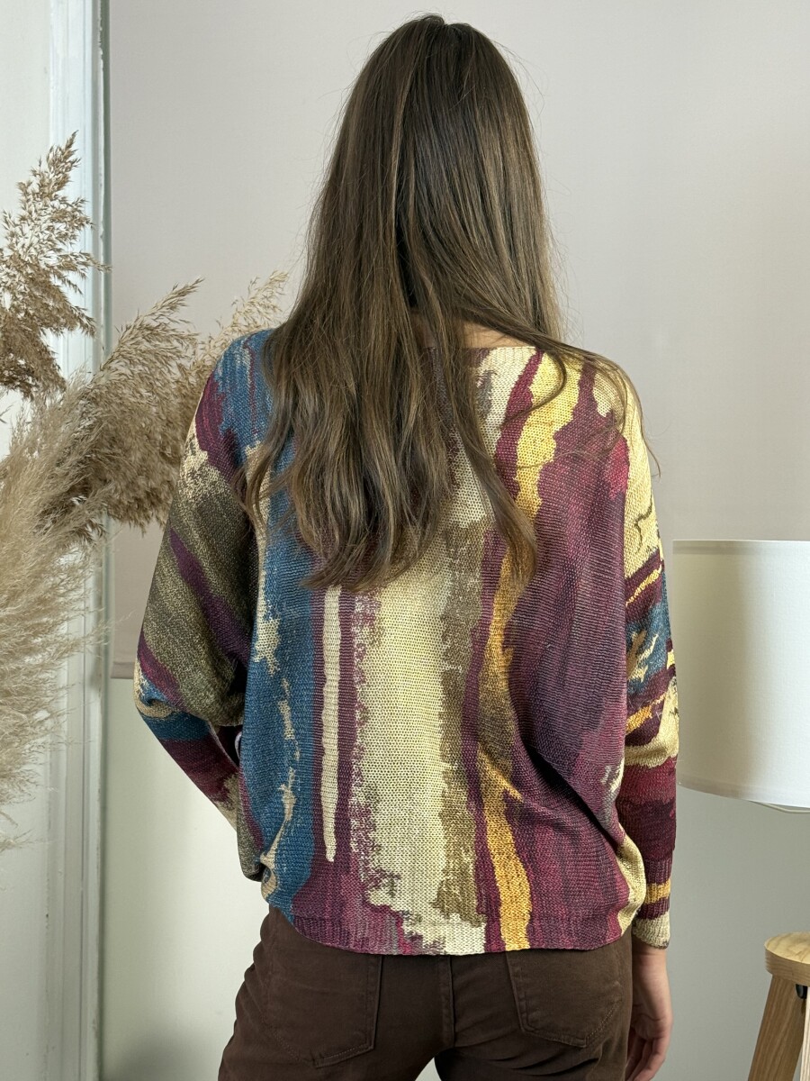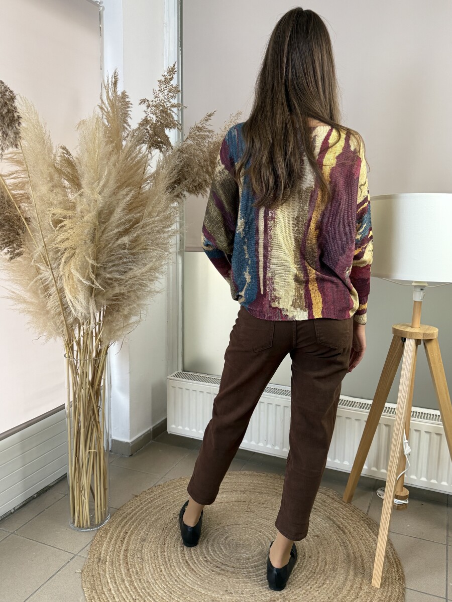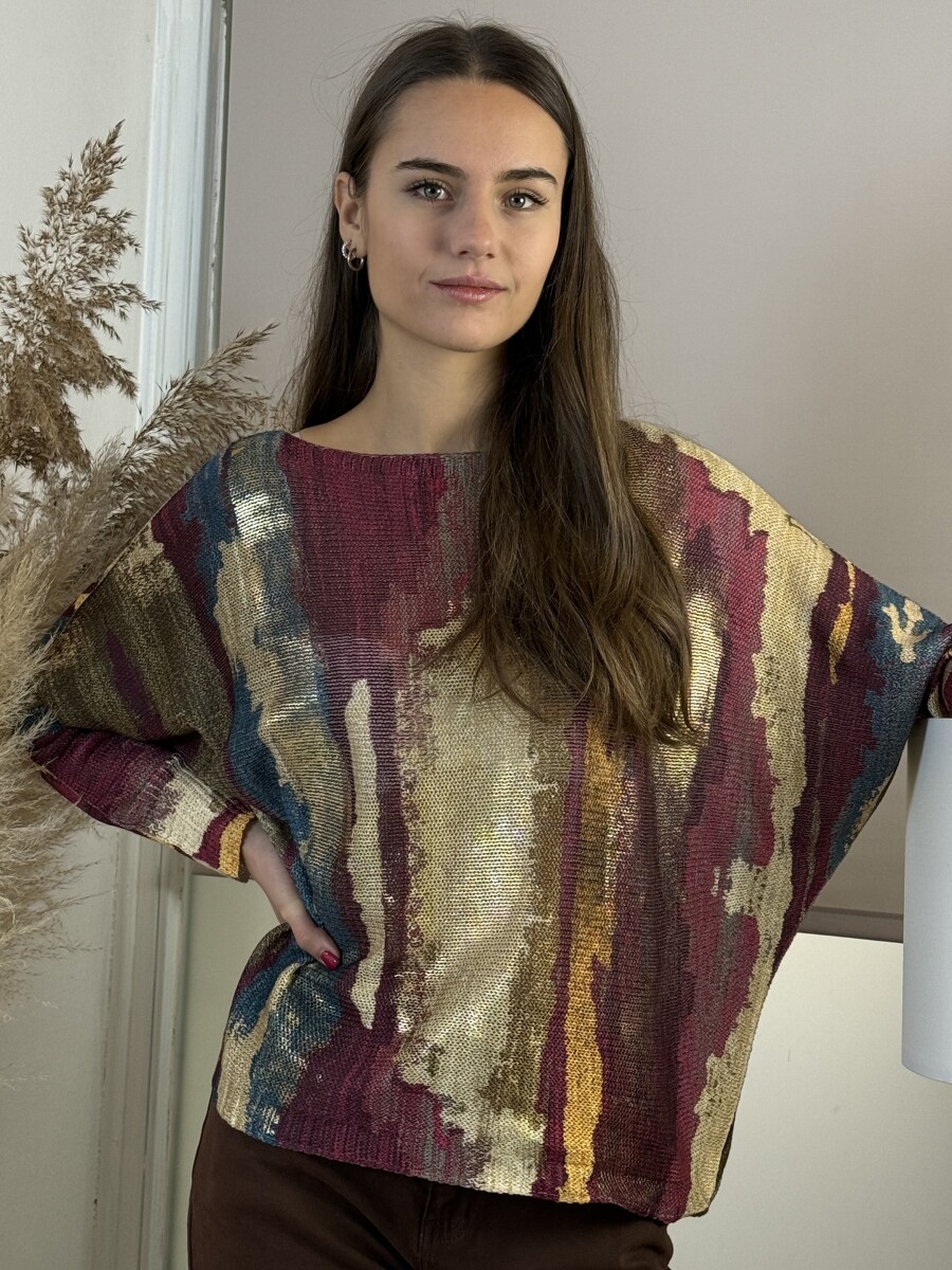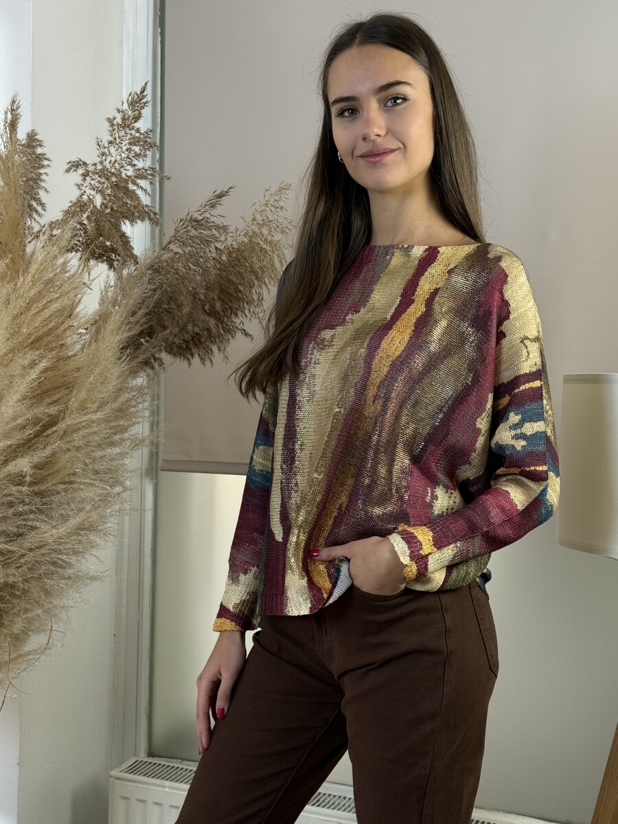 Csónak nyakkivágású, passzés aljú, denevér ujjú, vékony horgolt, könnyed, kényelmes, laza fazonú felső .