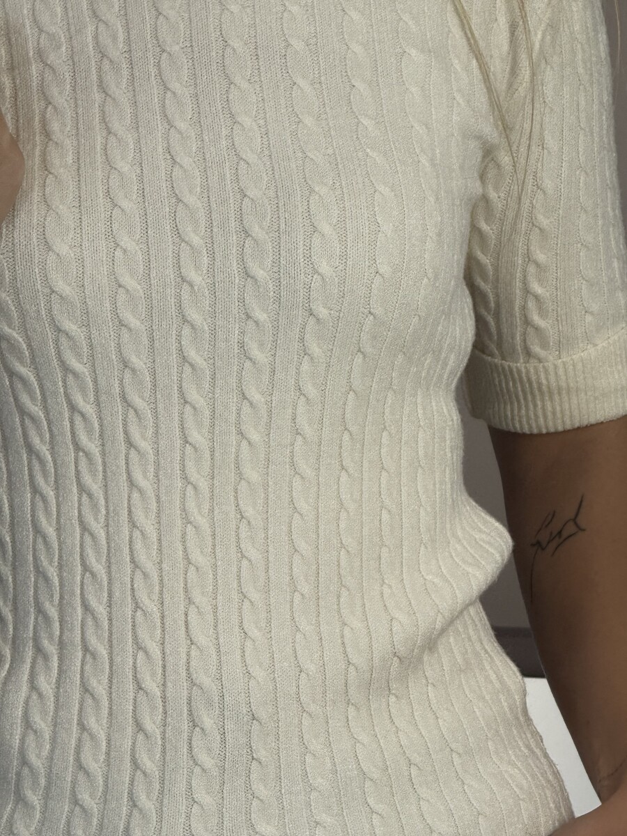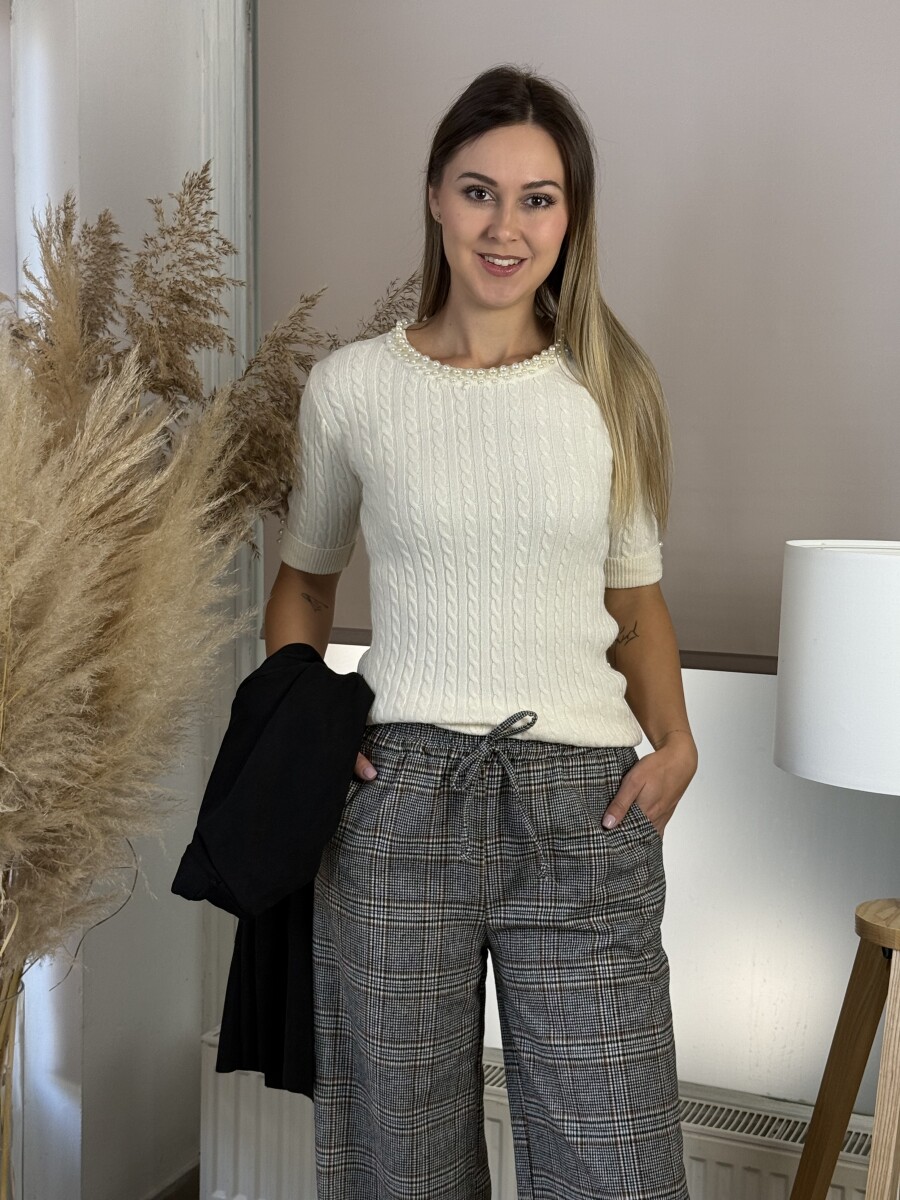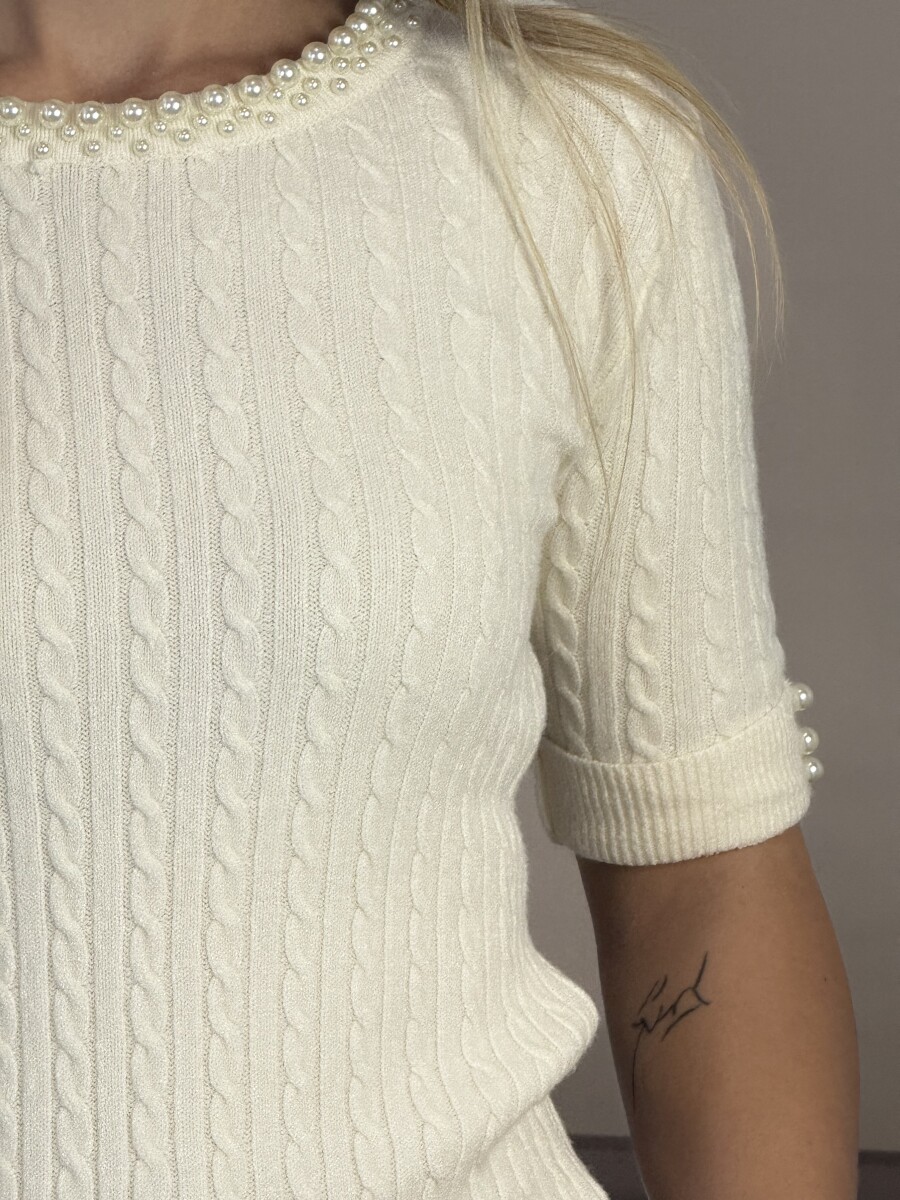 Testvonalat követő, ujj és derék résznél passzés , rövid ujjú, ujj végen és nyak részen gyöngyökkel kirakott, kerek nyakú csavart mintás pulóver .