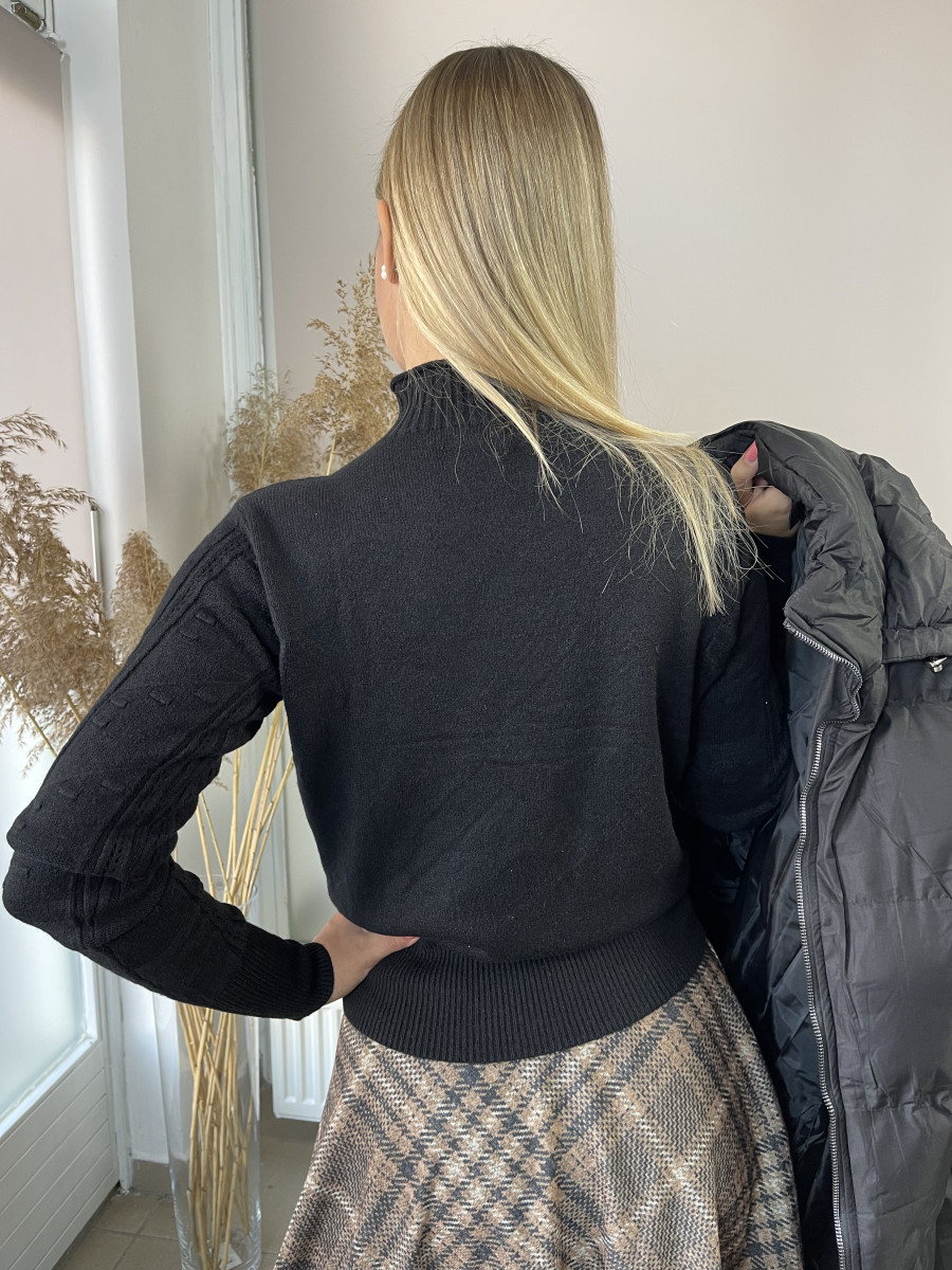 T ujjas lezser fazonú, vastag puha tapintású, anyagában mintás kötésű, álló nyakú pulóver .
