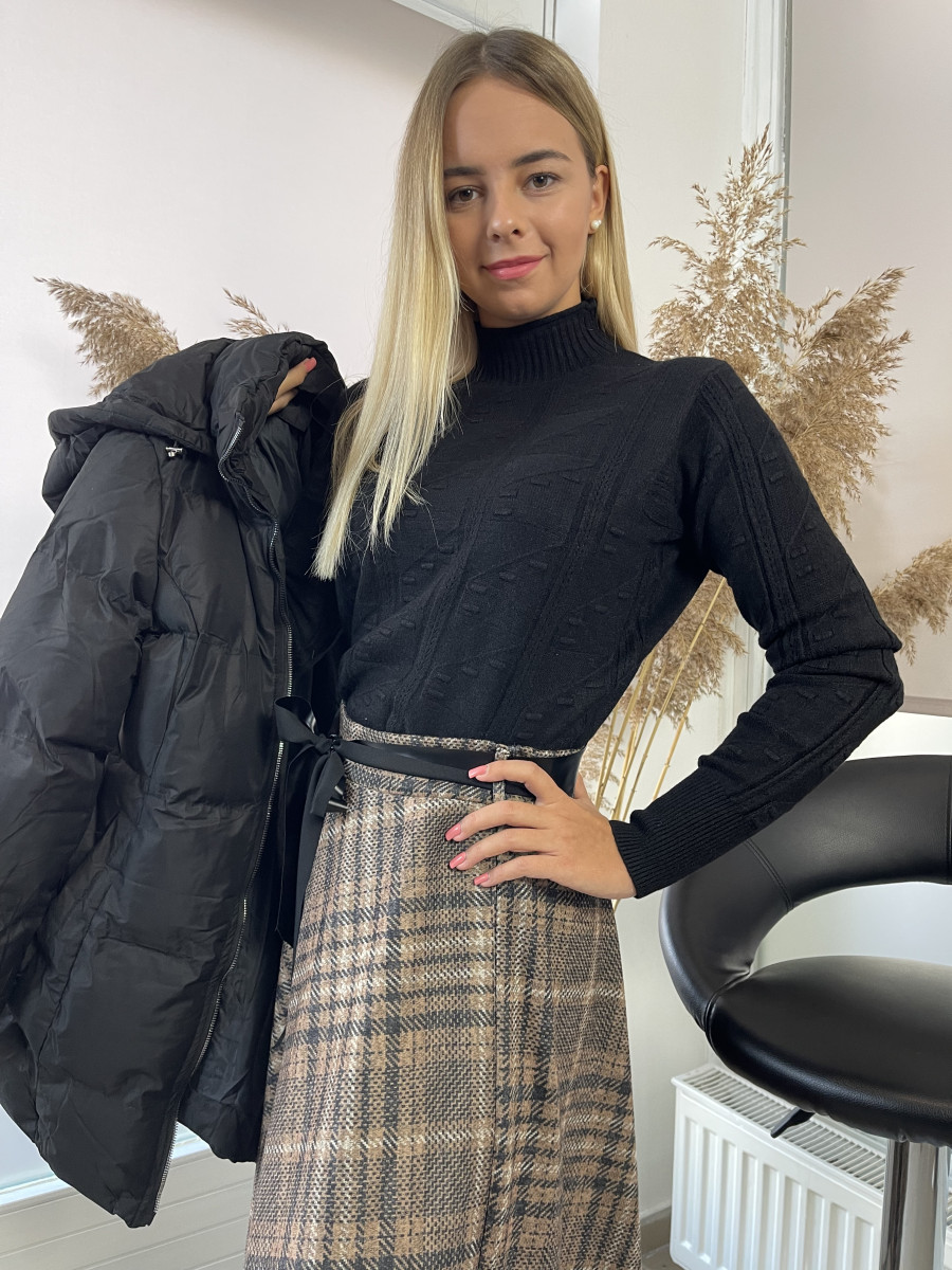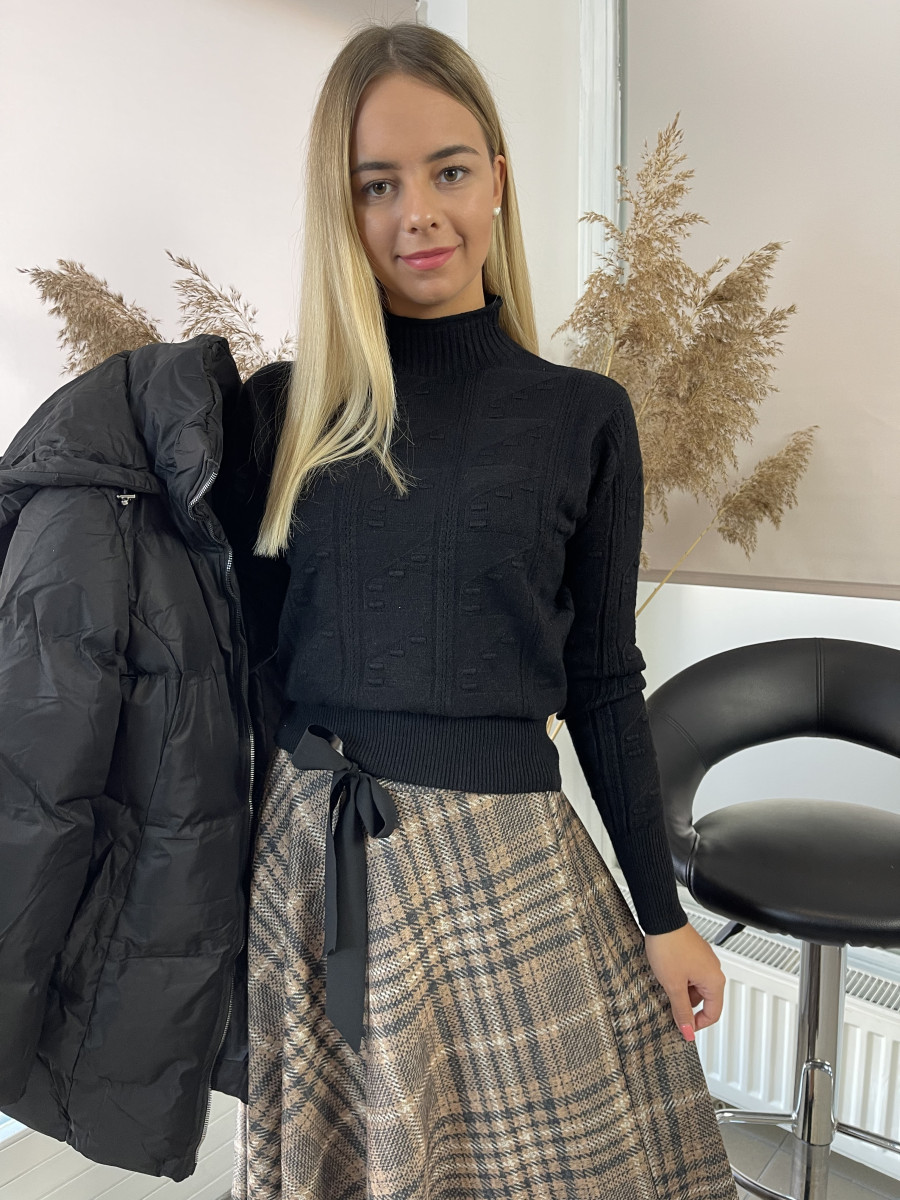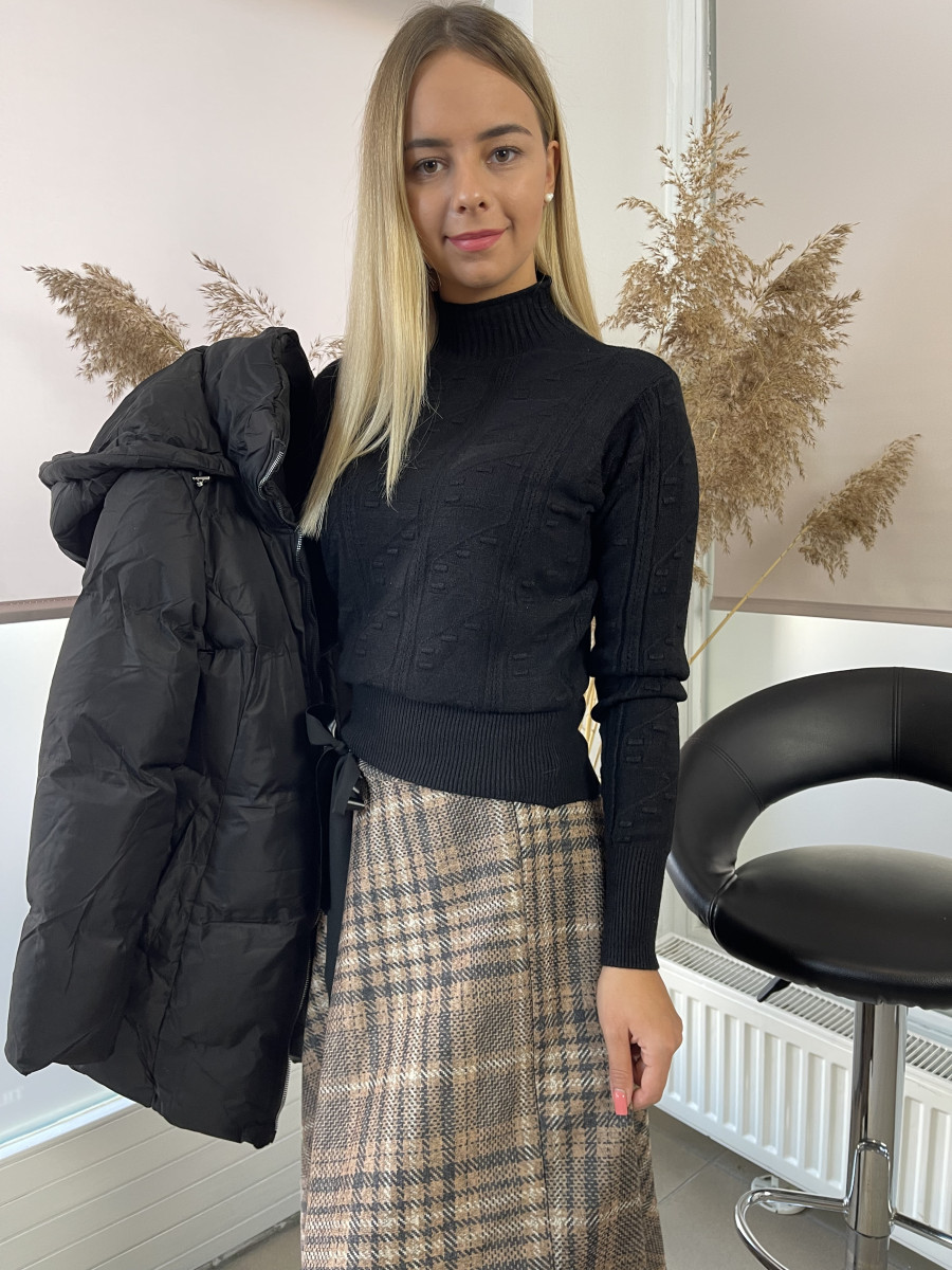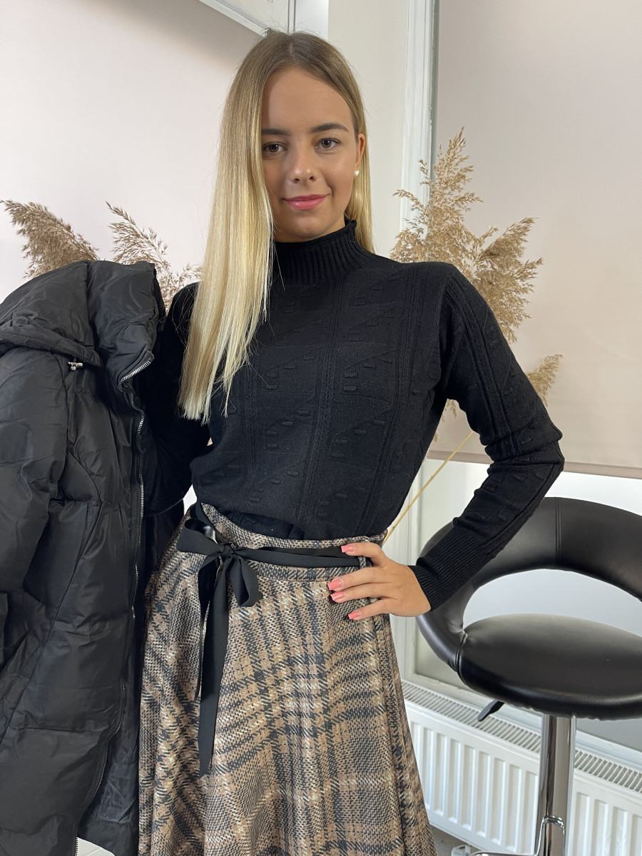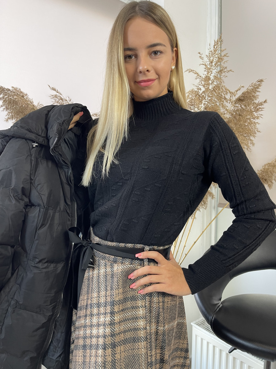 T ujjas lezser fazonú, vastag puha tapintású, anyagában mintás kötésű, álló nyakú pulóver .