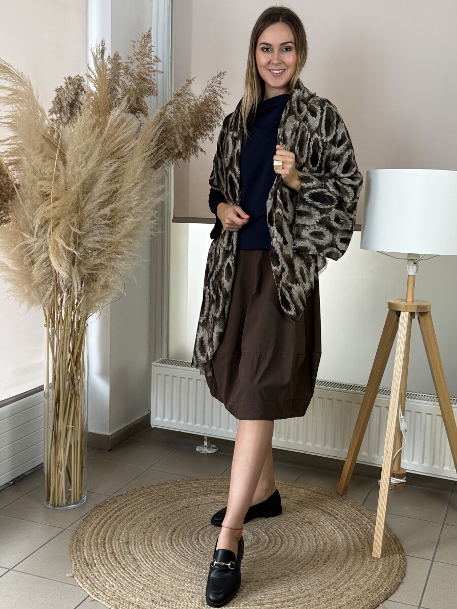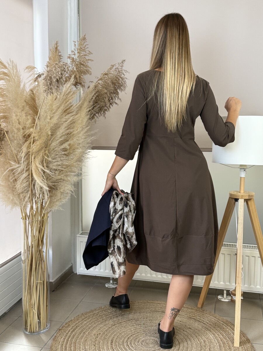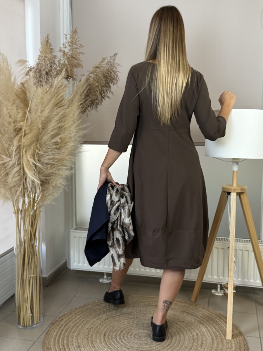 Lezser fazonú, A vonalas, kereknyakú, ¾ ujjú, alján kiszélesedő egyberészes hagyma ruha.
