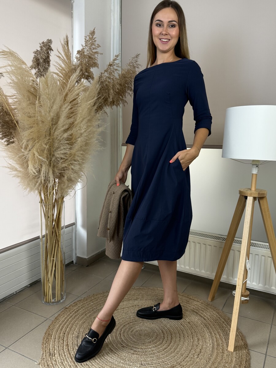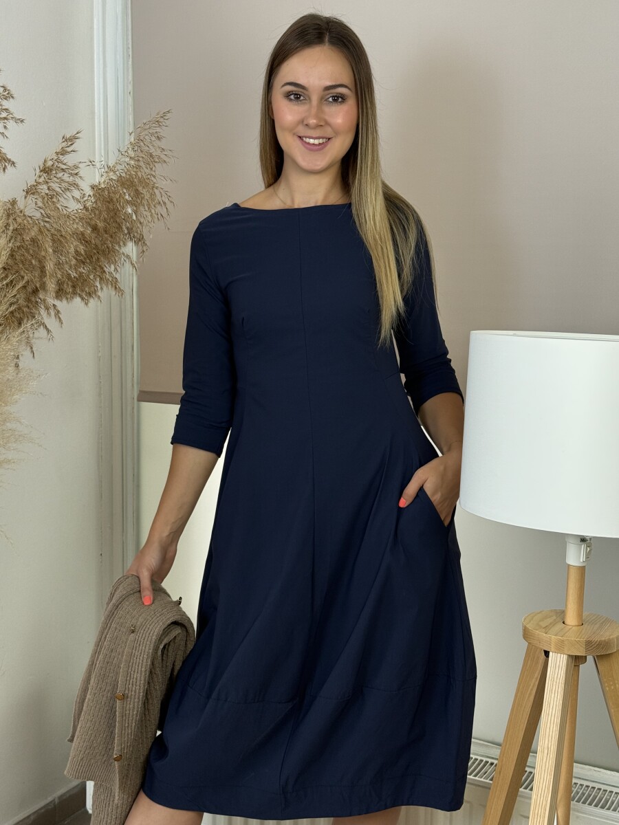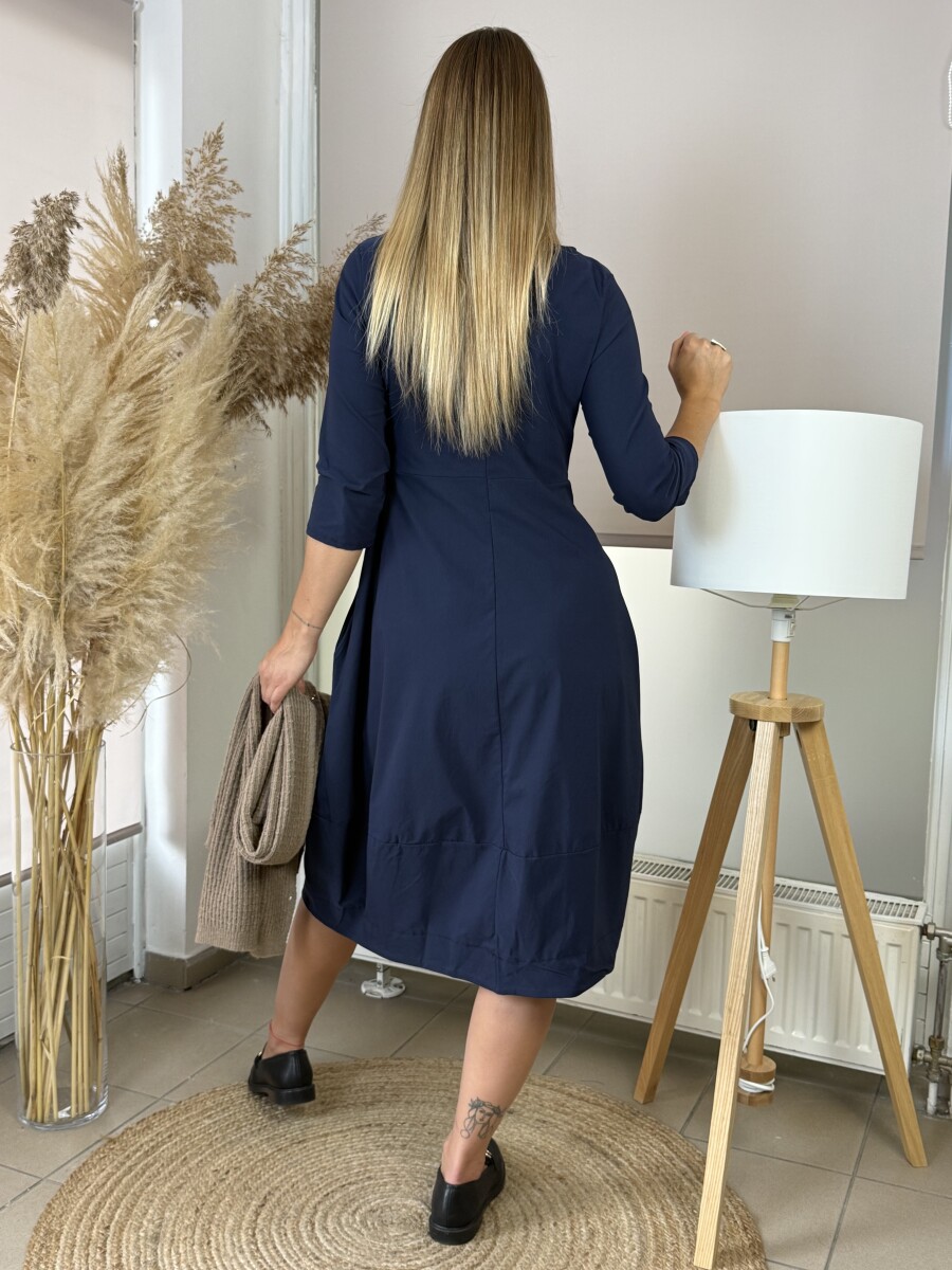 Lezser fazonú, A vonalas, kereknyakú, ¾ ujjú, alján kiszélesedő egyberészes hagyma ruha.