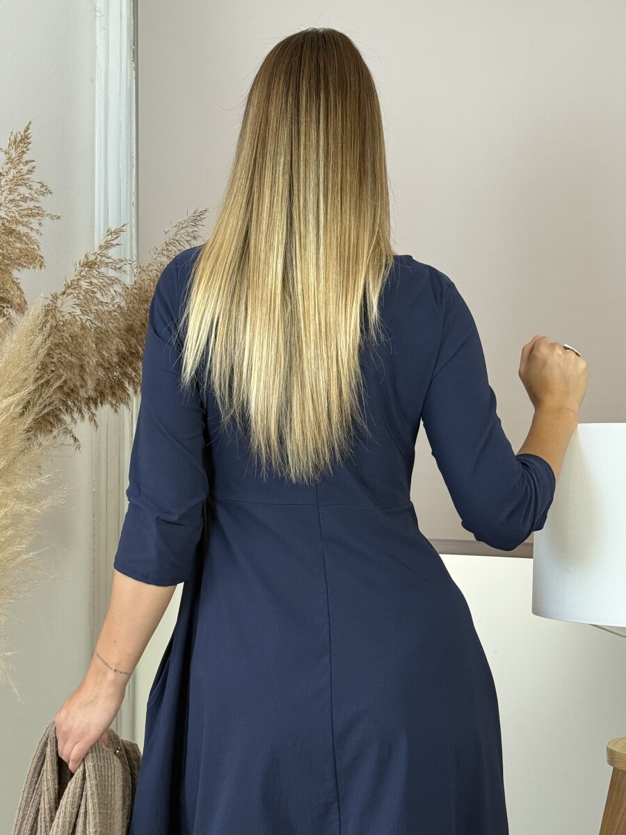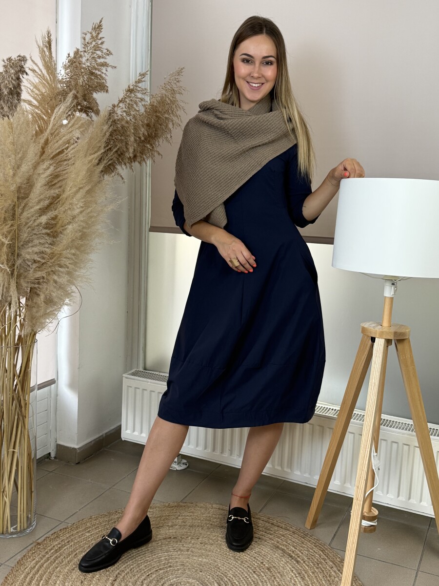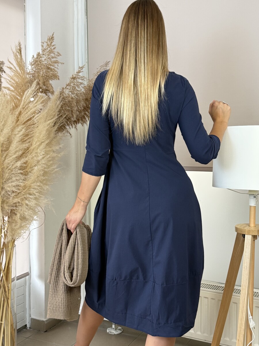 Lezser fazonú, A vonalas, kereknyakú, ¾ ujjú, alján kiszélesedő egyberészes hagyma ruha.