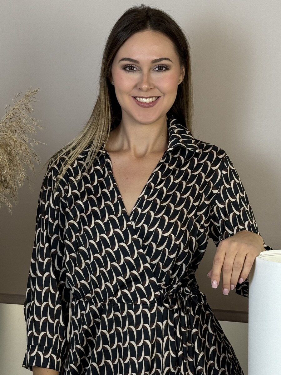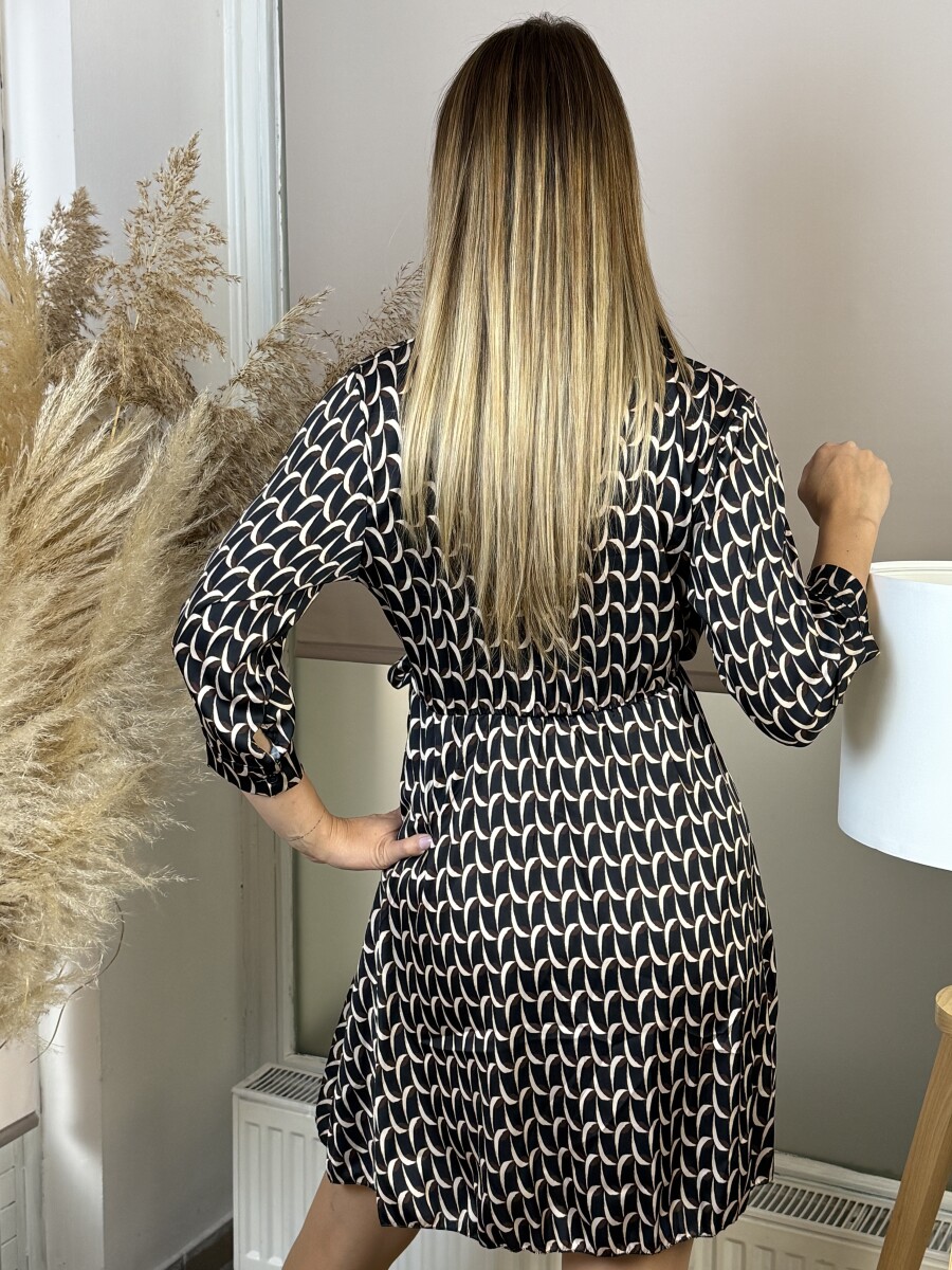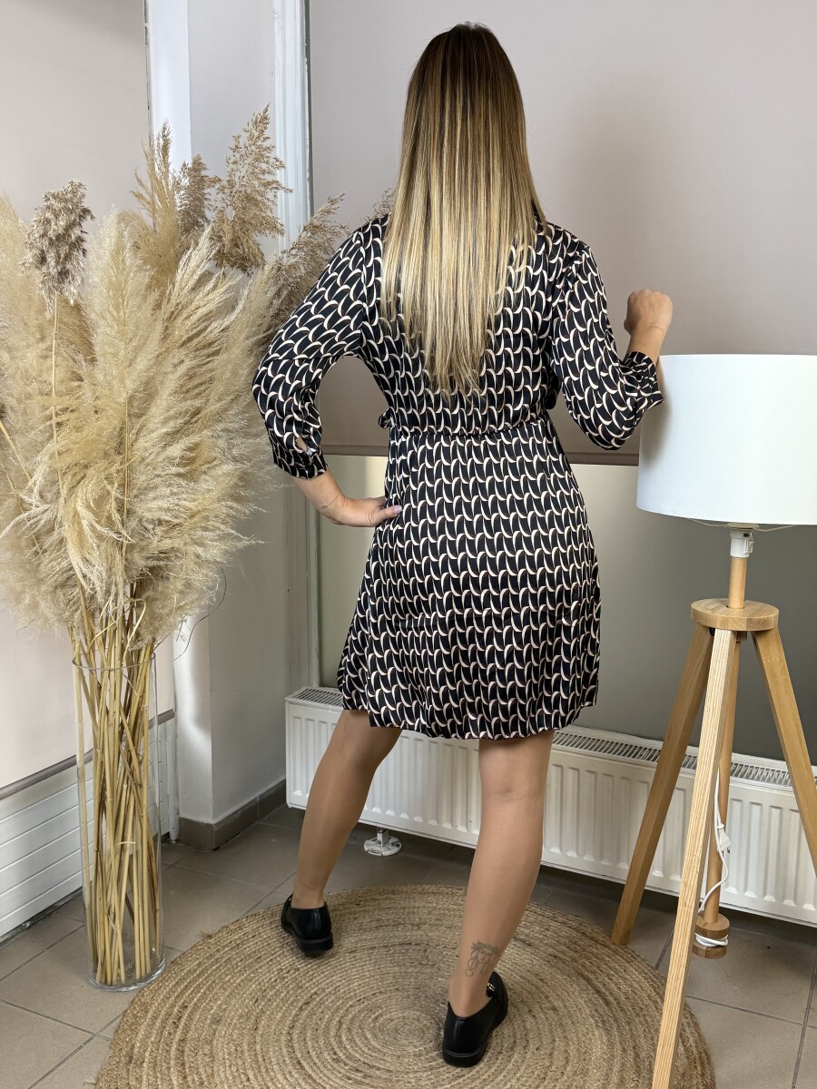 Inggalléros, mell részen átlapolt, mellbevarrásos, ¾ ujjú, gumis derekú, derekán saját anyagából kötős, Á vonalú szatén hatású ruha.