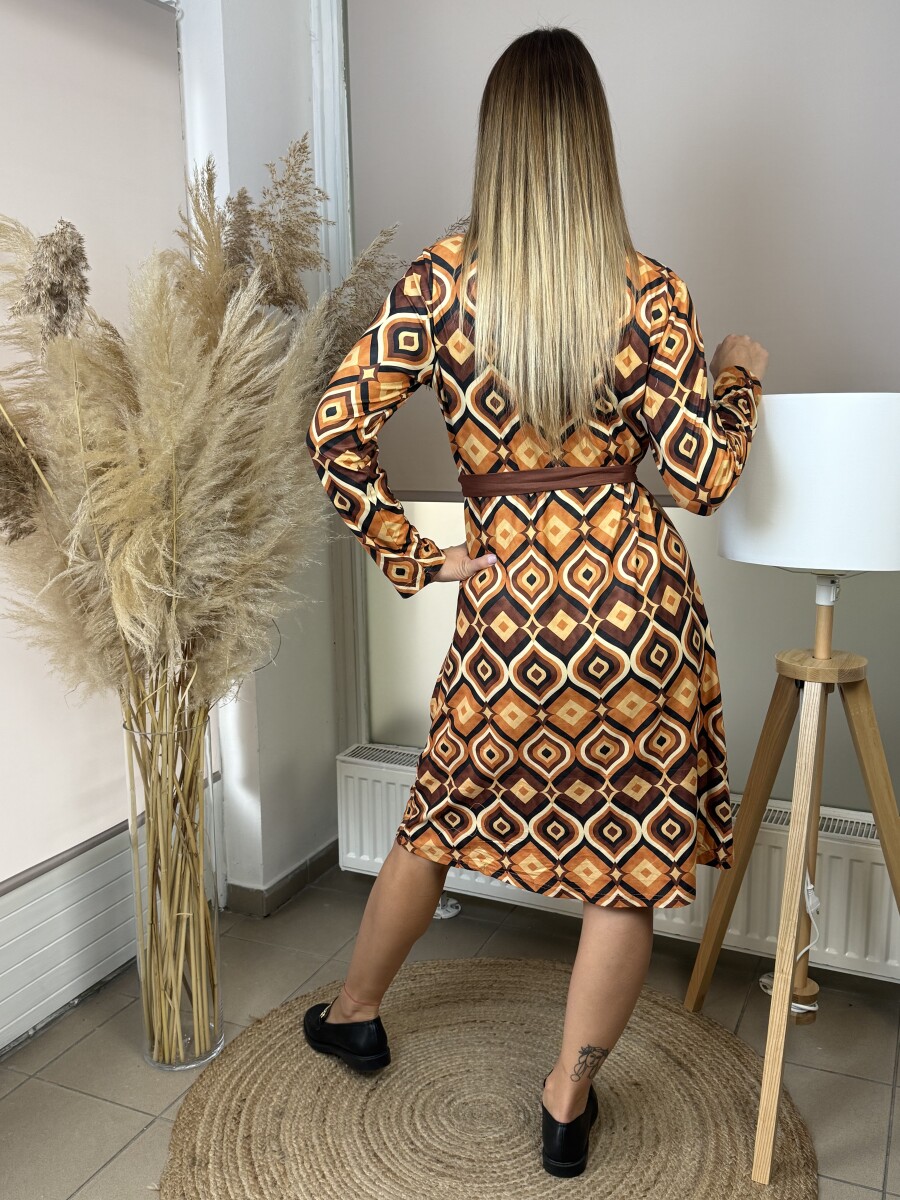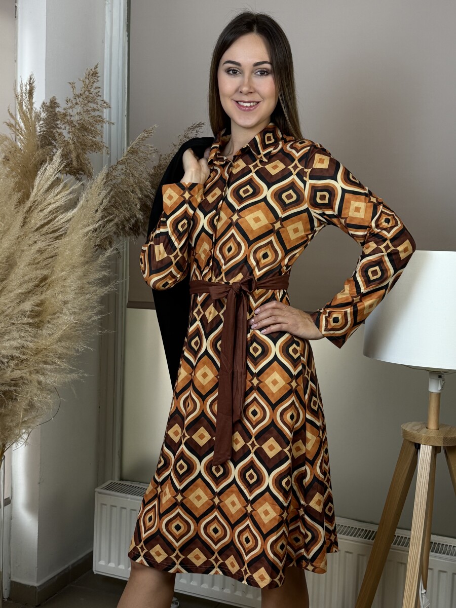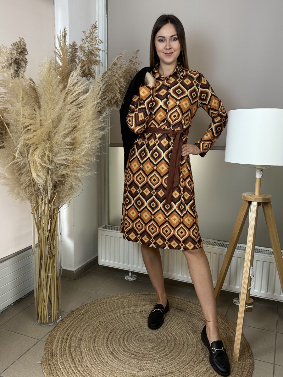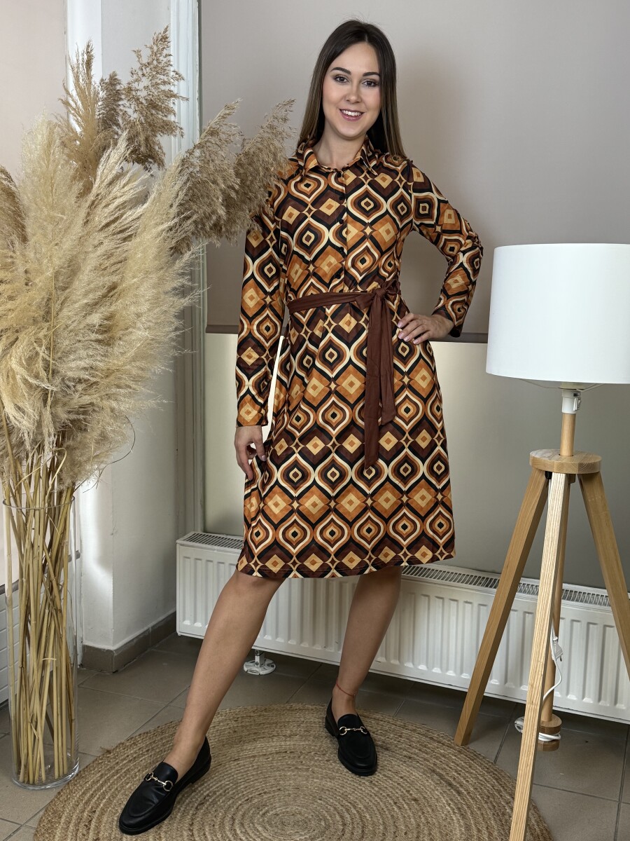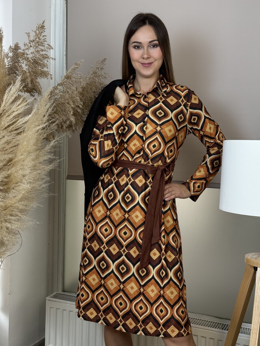 Hosszú ujjú, ing galléros, mell részen gombos, Á vonalú, derekán saját anyagában kötős , (amivel tovább karcsúsítható), kényelmes puha rugalmas anyagú ingruha .
