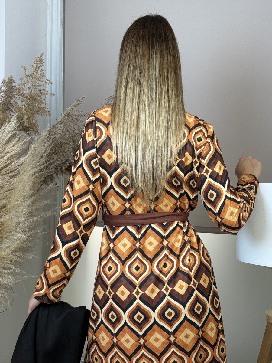 Hosszú ujjú, ing galléros, mell részen gombos, Á vonalú, derekán saját anyagában kötős , (amivel tovább karcsúsítható), kényelmes puha rugalmas anyagú ingruha .