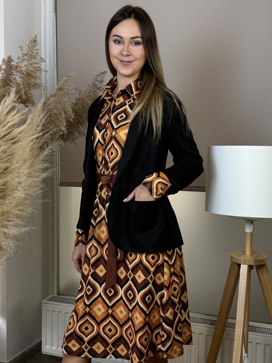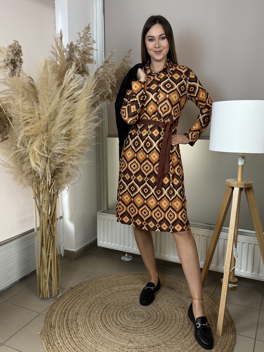 Hosszú ujjú, ing galléros, mell részen gombos, Á vonalú, derekán saját anyagában kötős , (amivel tovább karcsúsítható), kényelmes puha rugalmas anyagú ingruha .