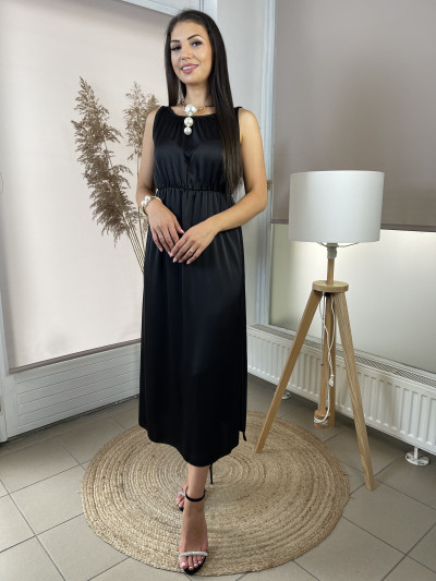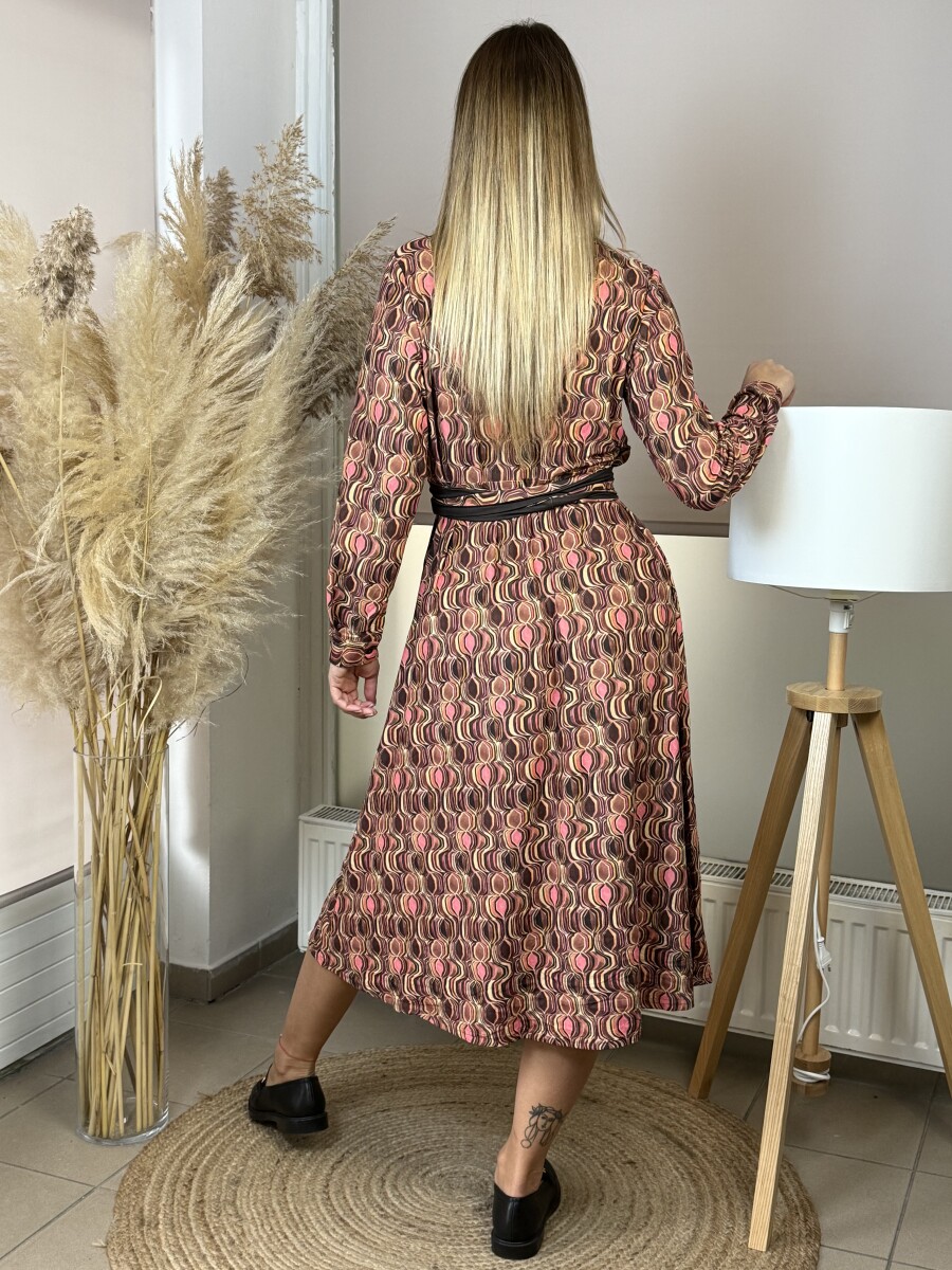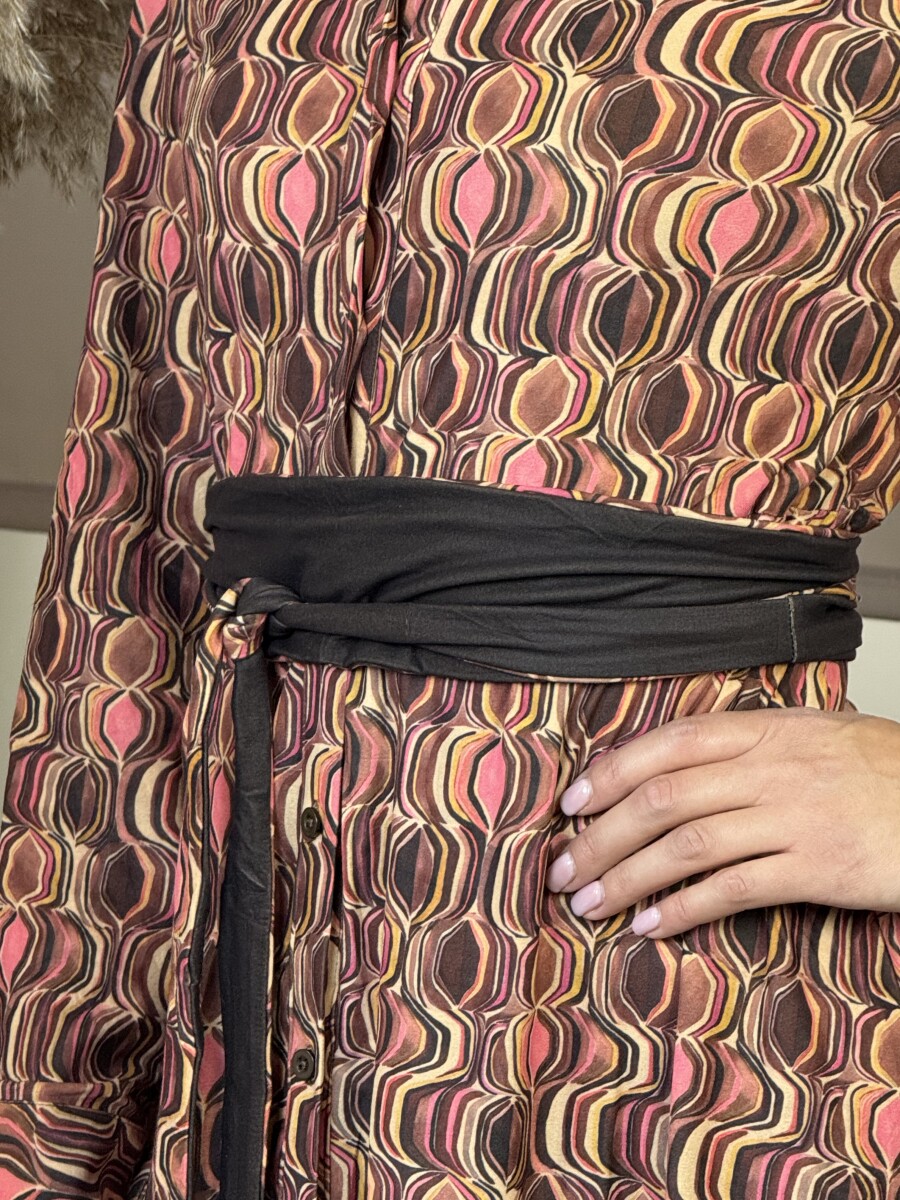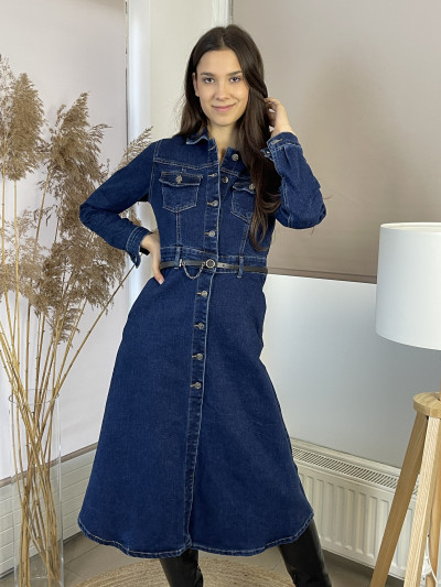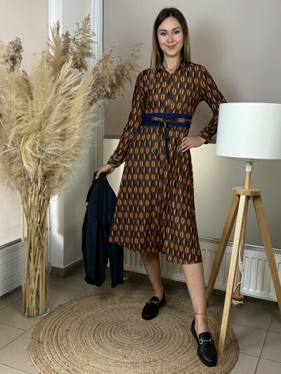 Hosszú ujjú, ujj végen passzés és gombos, ing galléros, elején végig gombos, Á vonalú, derekán saját anyagában kötős , (amivel tovább karcsúsítható), kényelmes puha rugalmas anyagú ingruha .