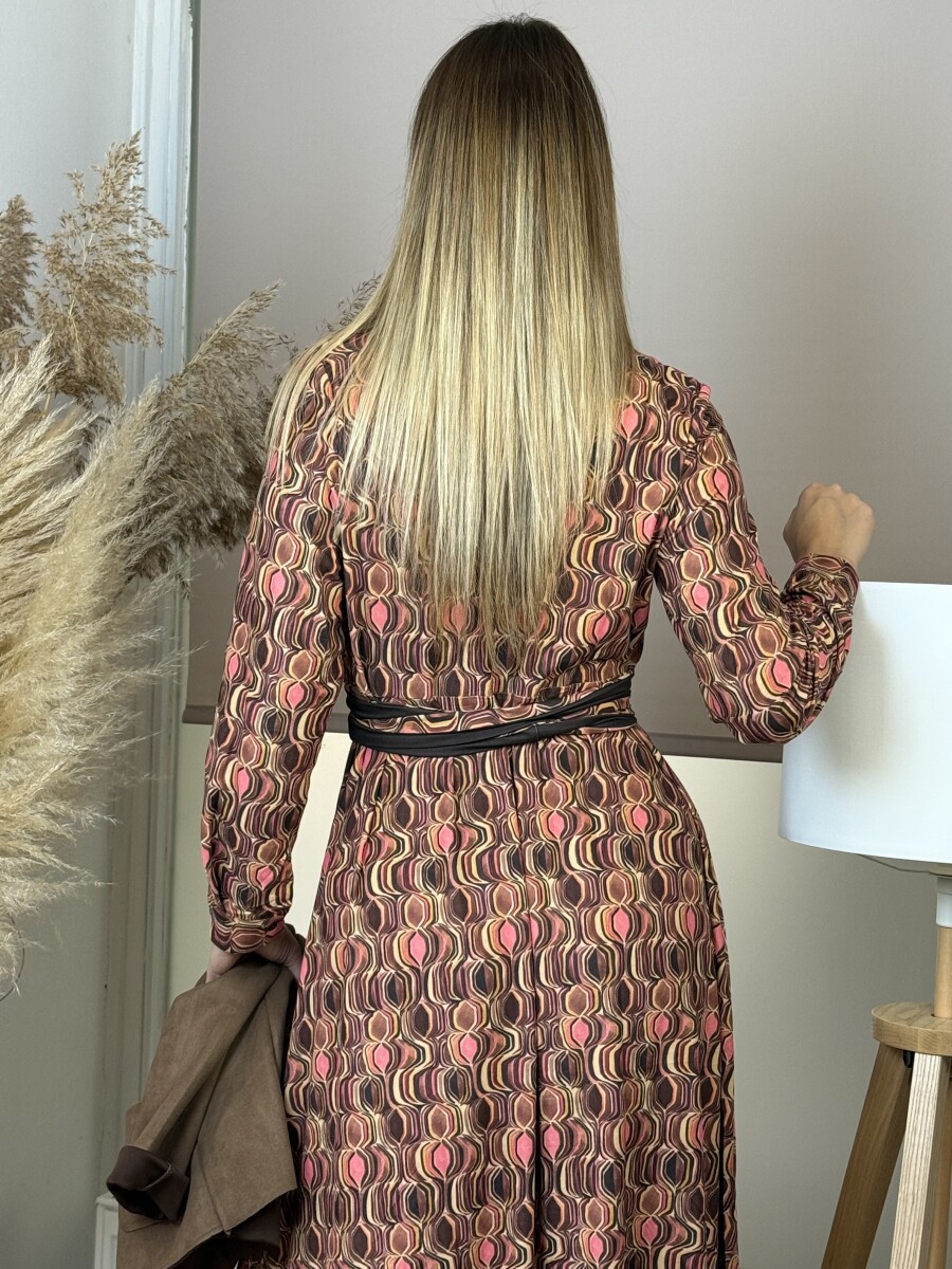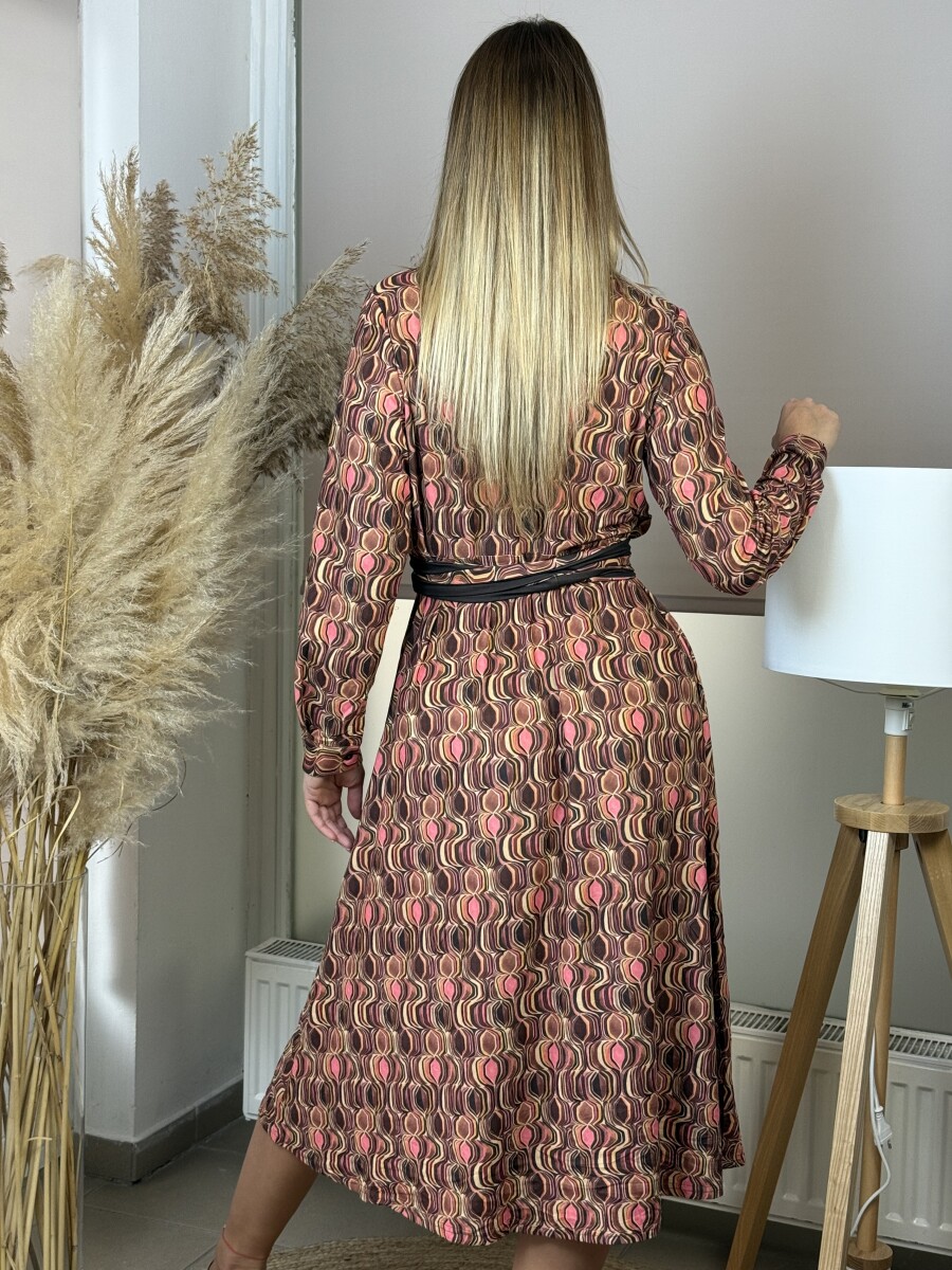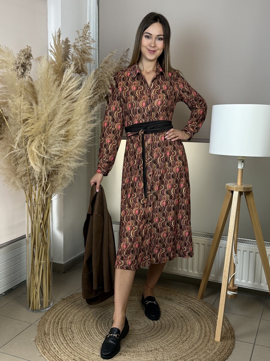 Hosszú ujjú, ujj végen passzés és gombos, ing galléros, elején végig gombos, Á vonalú, derekán saját anyagában kötős , (amivel tovább karcsúsítható), kényelmes puha rugalmas anyagú ingruha .