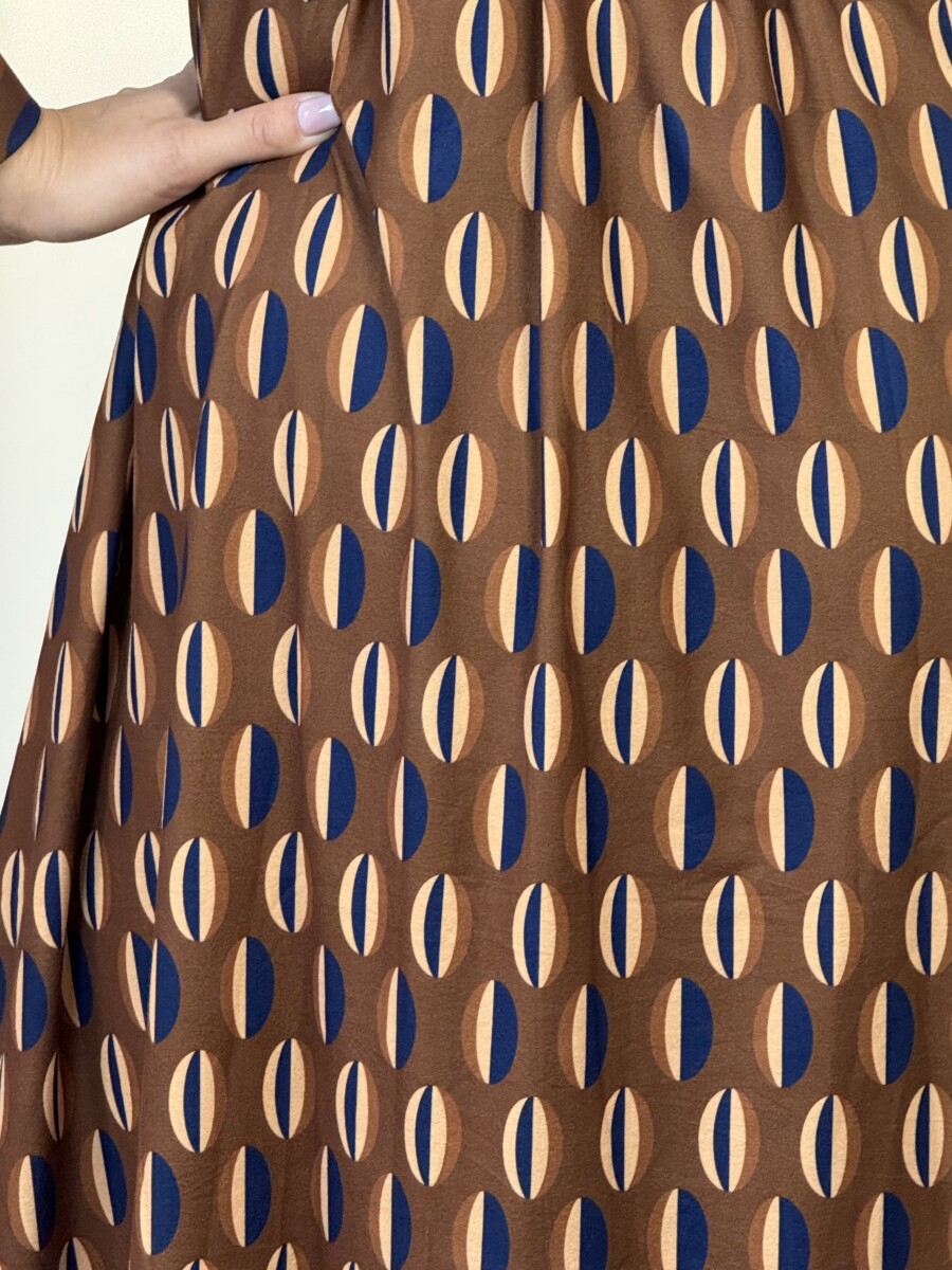 Hosszú ujjú, ujj végen passzés és gombos, ing galléros, elején végig gombos, Á vonalú, derekán saját anyagában kötős , (amivel tovább karcsúsítható), kényelmes puha rugalmas anyagú ingruha .