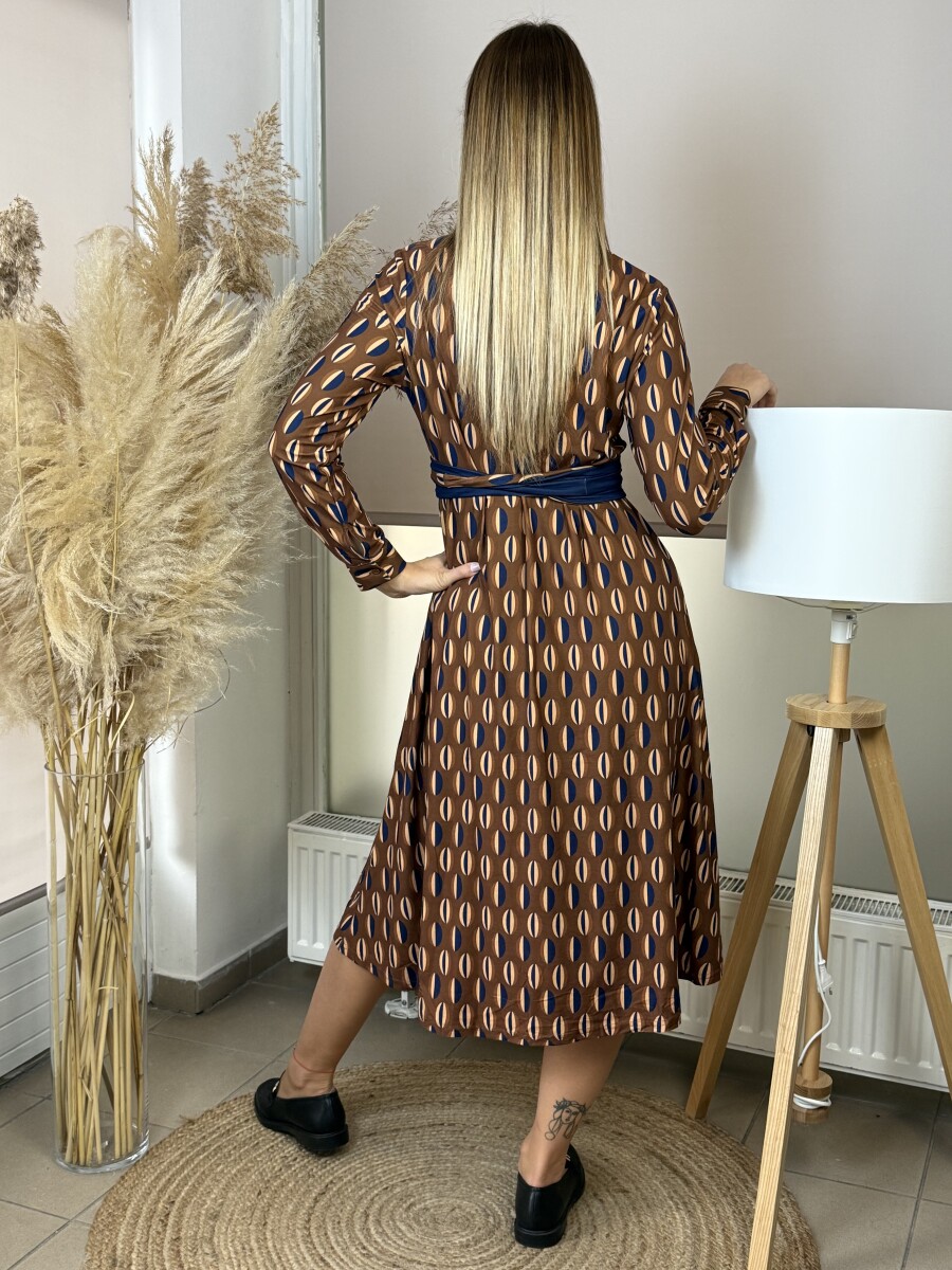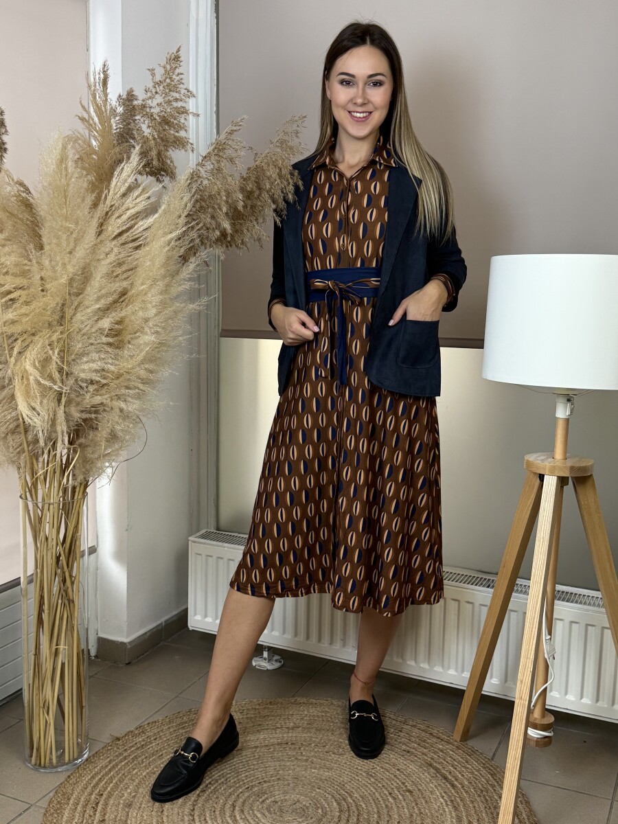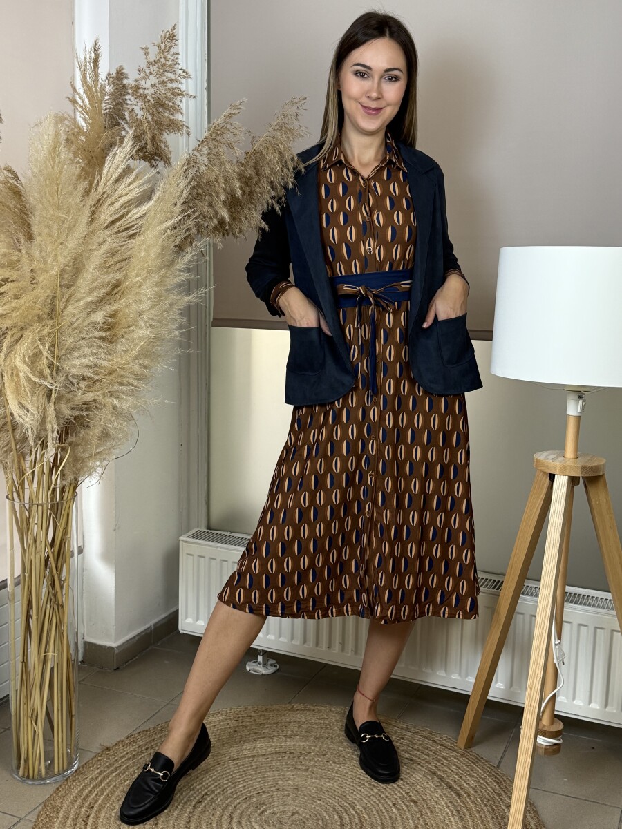 Hosszú ujjú, ujj végen passzés és gombos, ing galléros, elején végig gombos, Á vonalú, derekán saját anyagában kötős , (amivel tovább karcsúsítható), kényelmes puha rugalmas anyagú ingruha .