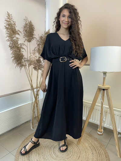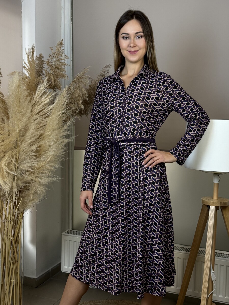 Hosszú ujjú, ing galléros, mell részen gombos, Á vonalú, derekán saját anyagában kötős , (amivel tovább karcsúsítható), kényelmes puha rugalmas anyagú ingruha .