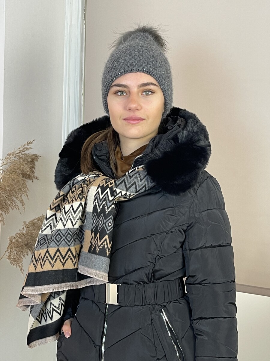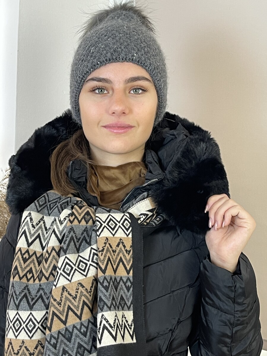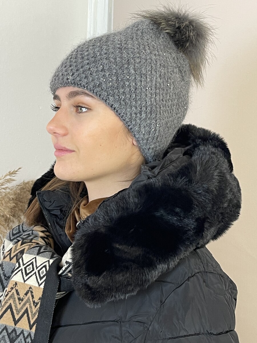 Apró mintás kötésű, kötött béléses vastag téli bojtos sapka szolid apró flitterekkel , a bojt lekapcsolható .