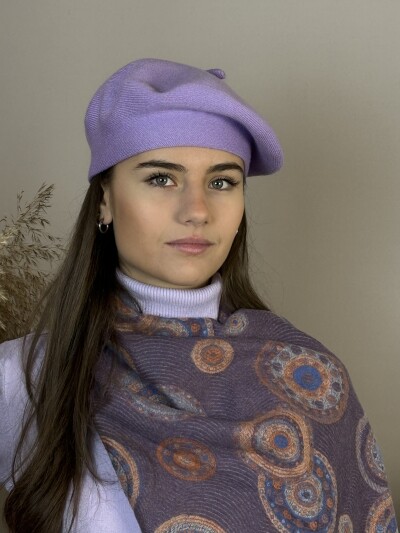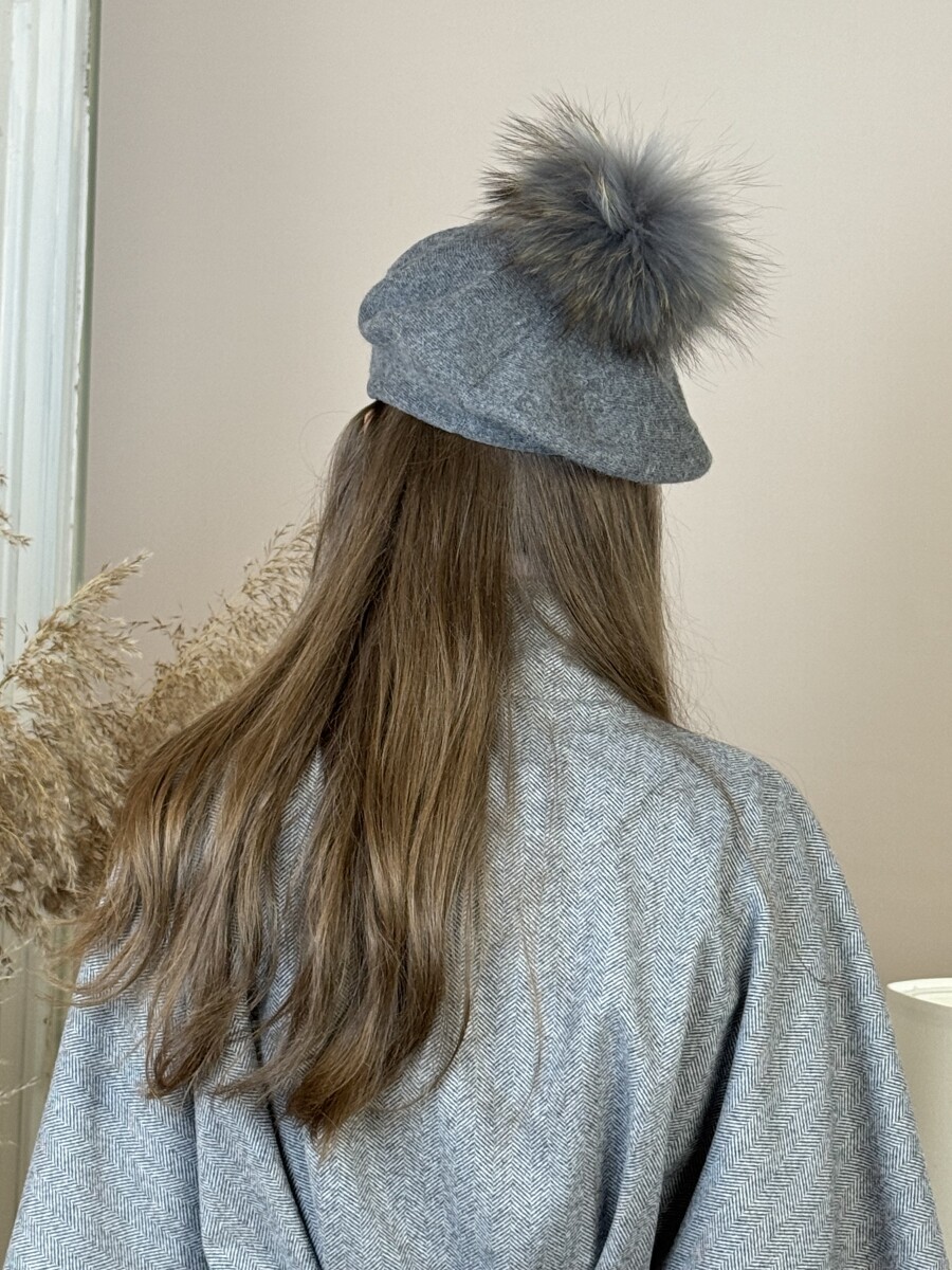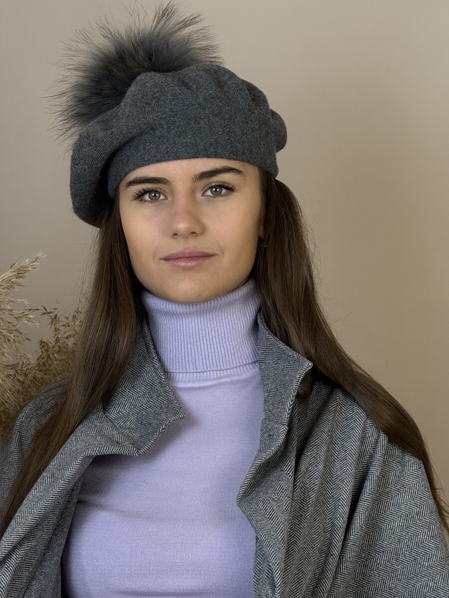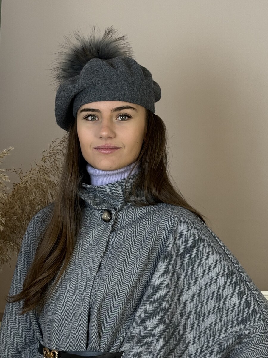 Bojtos barett sapka, nőies fazon, anyaga kasmír puhaságú, rugalmas, kényelmes .