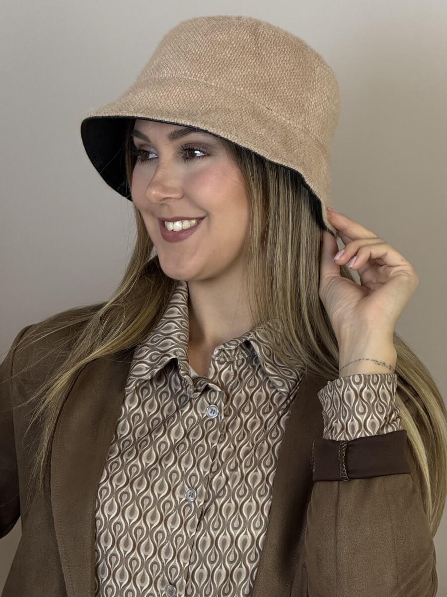 Keskeny karimájú kifordítható kalap. Egyik oldala cirmos, a másik oldalán fekete műbőr, mindkét oldalán hordható .