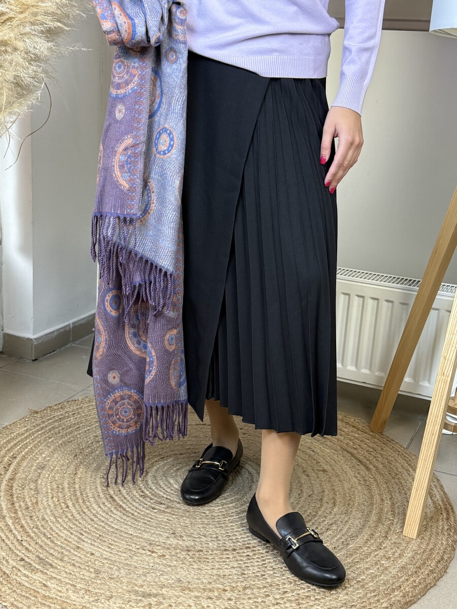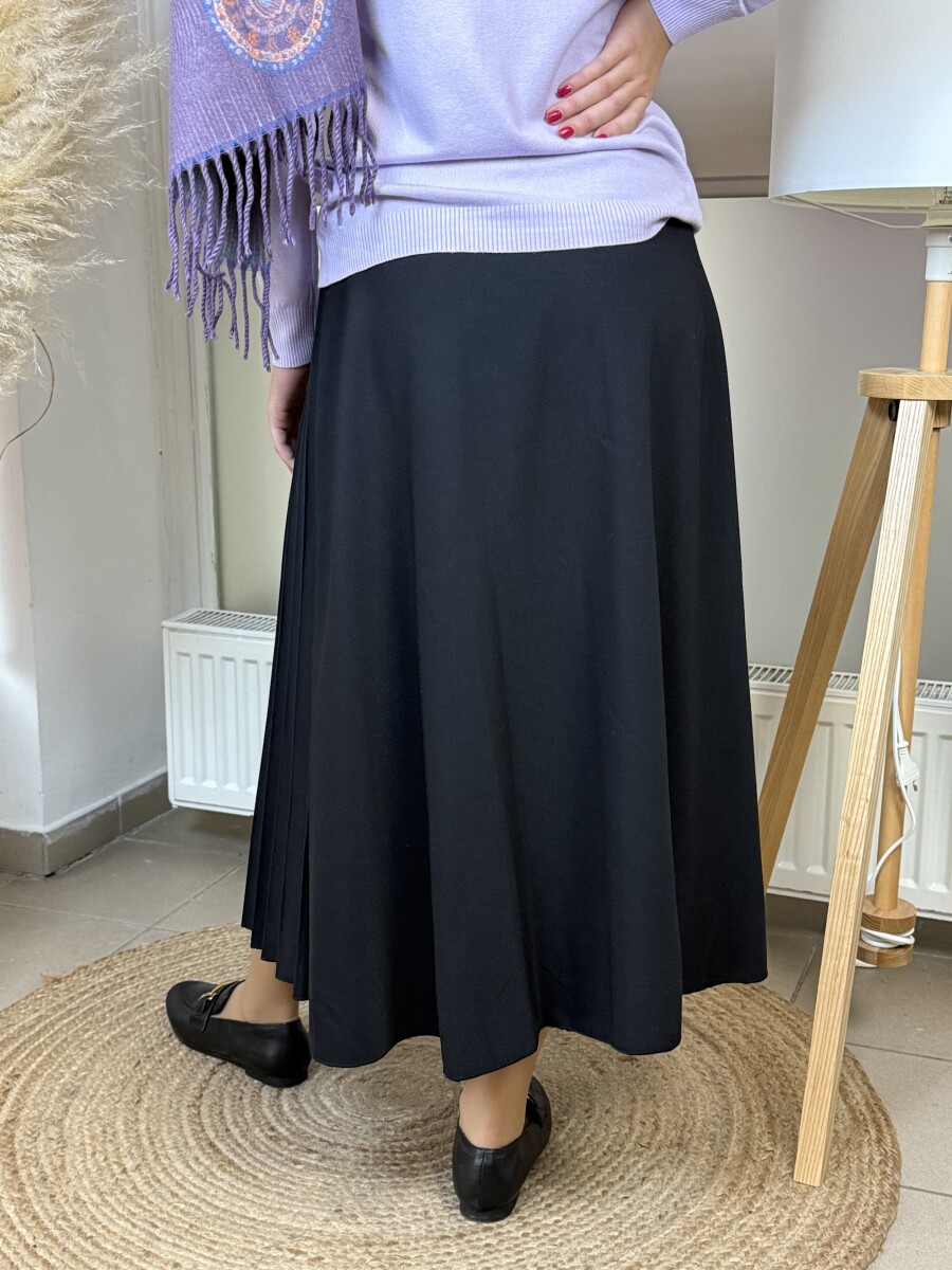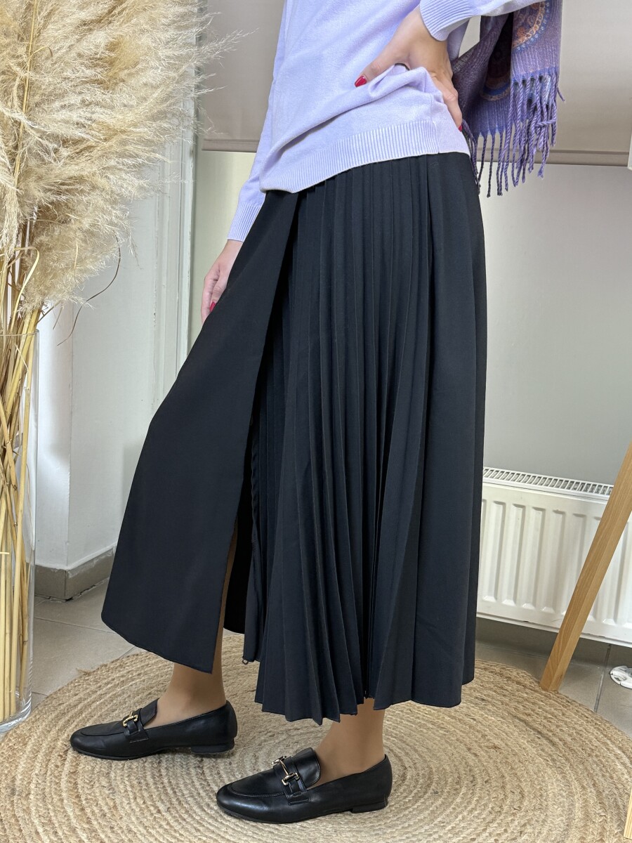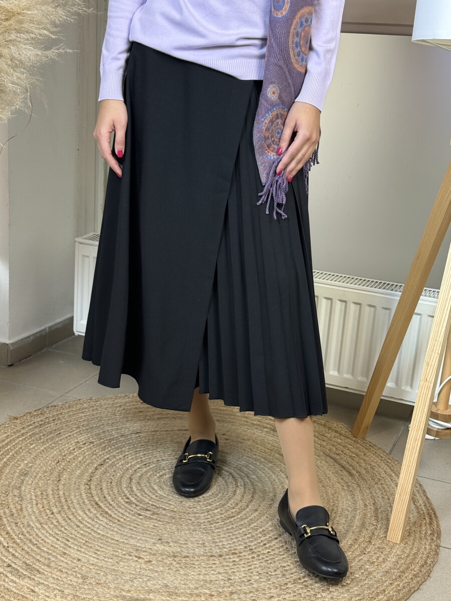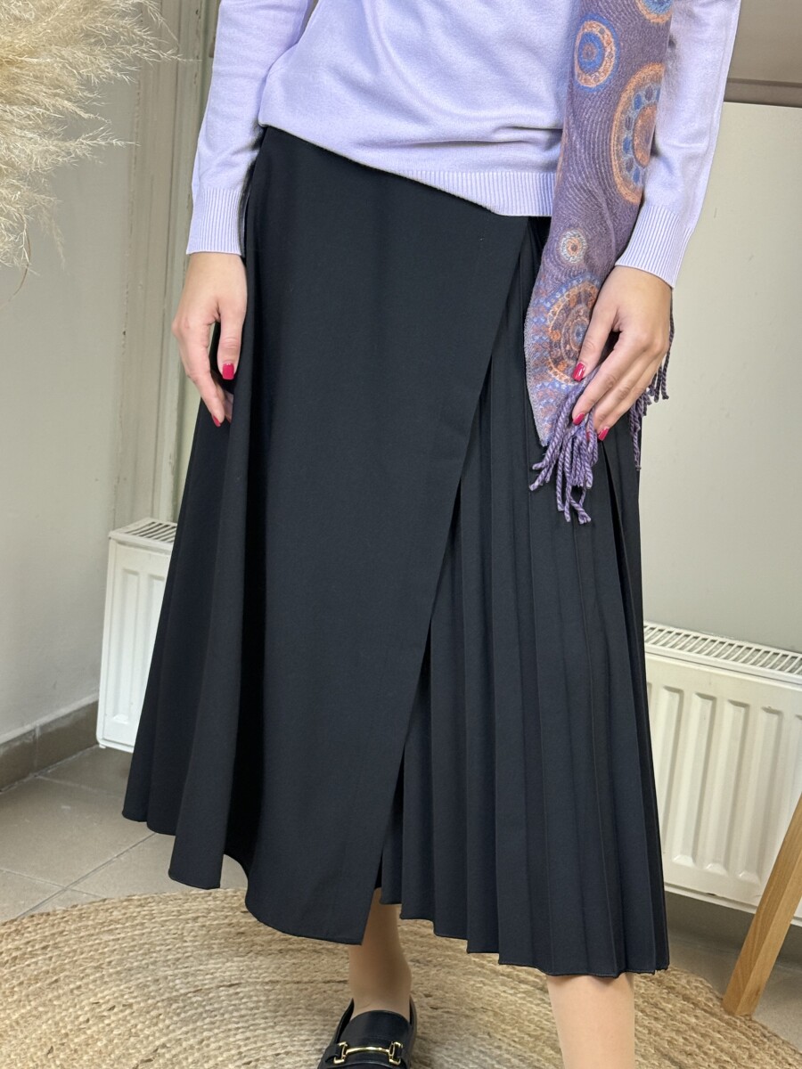 Átlapolós, derekán gombos, egy oldalon pliszírozott maxi vászon szoknya .