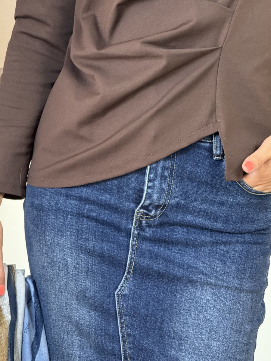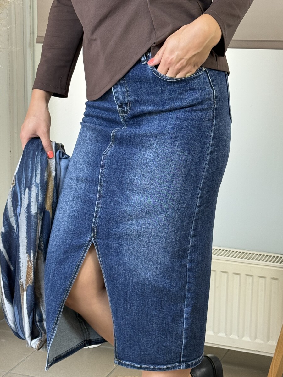 Rugalmas anyagú mérsékelten koptatott, elöl felsliccelt, 4 farmer zsebes, elöl cipzáras midi farmerszoknya .