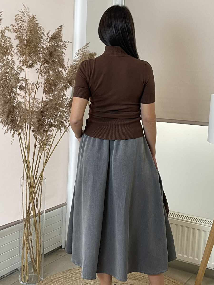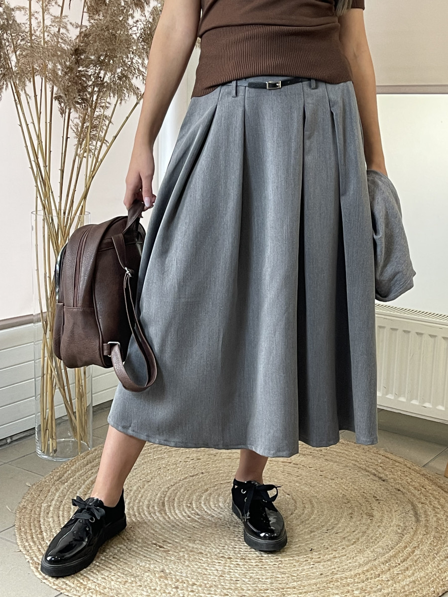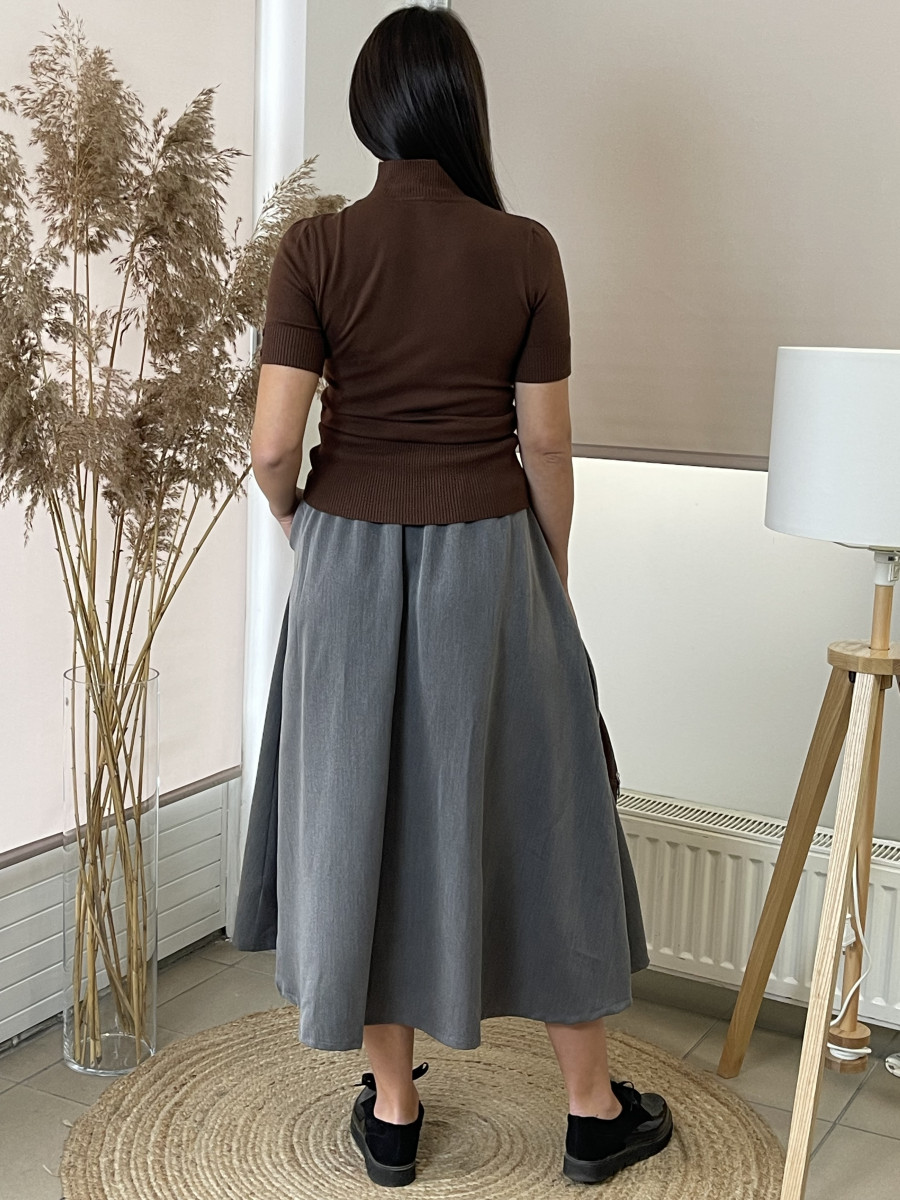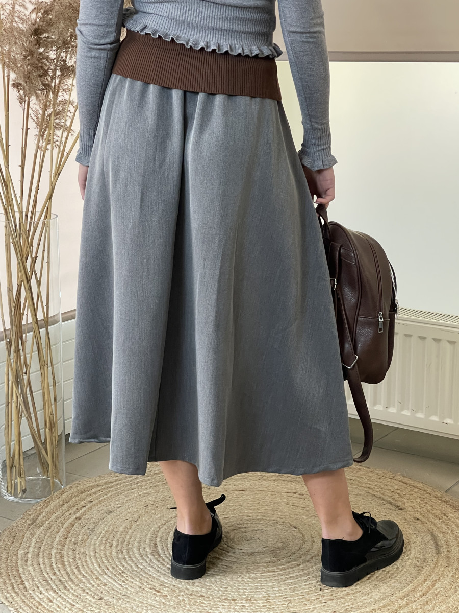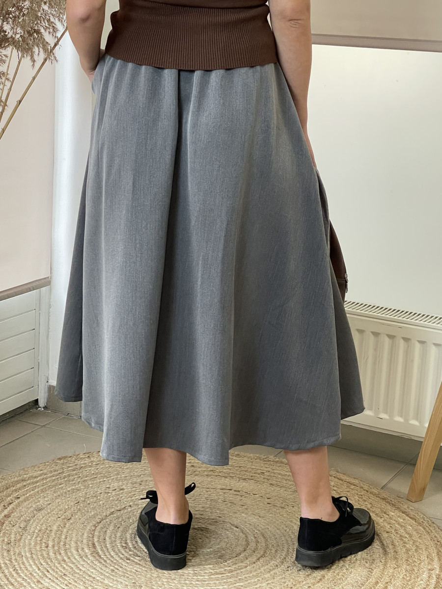 Gumis derekú, oldalán 2 rejtett zsebes, elöl csípő részen csípett, laza esésű, lenge anyagú szoknya .