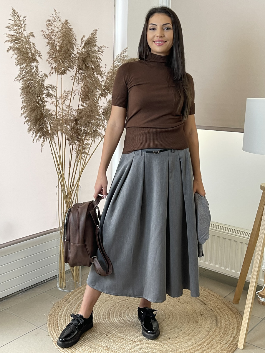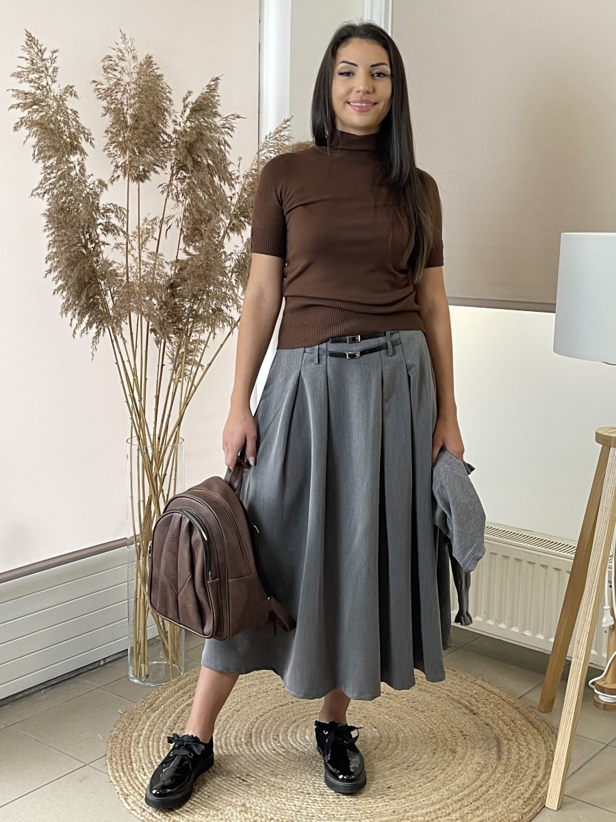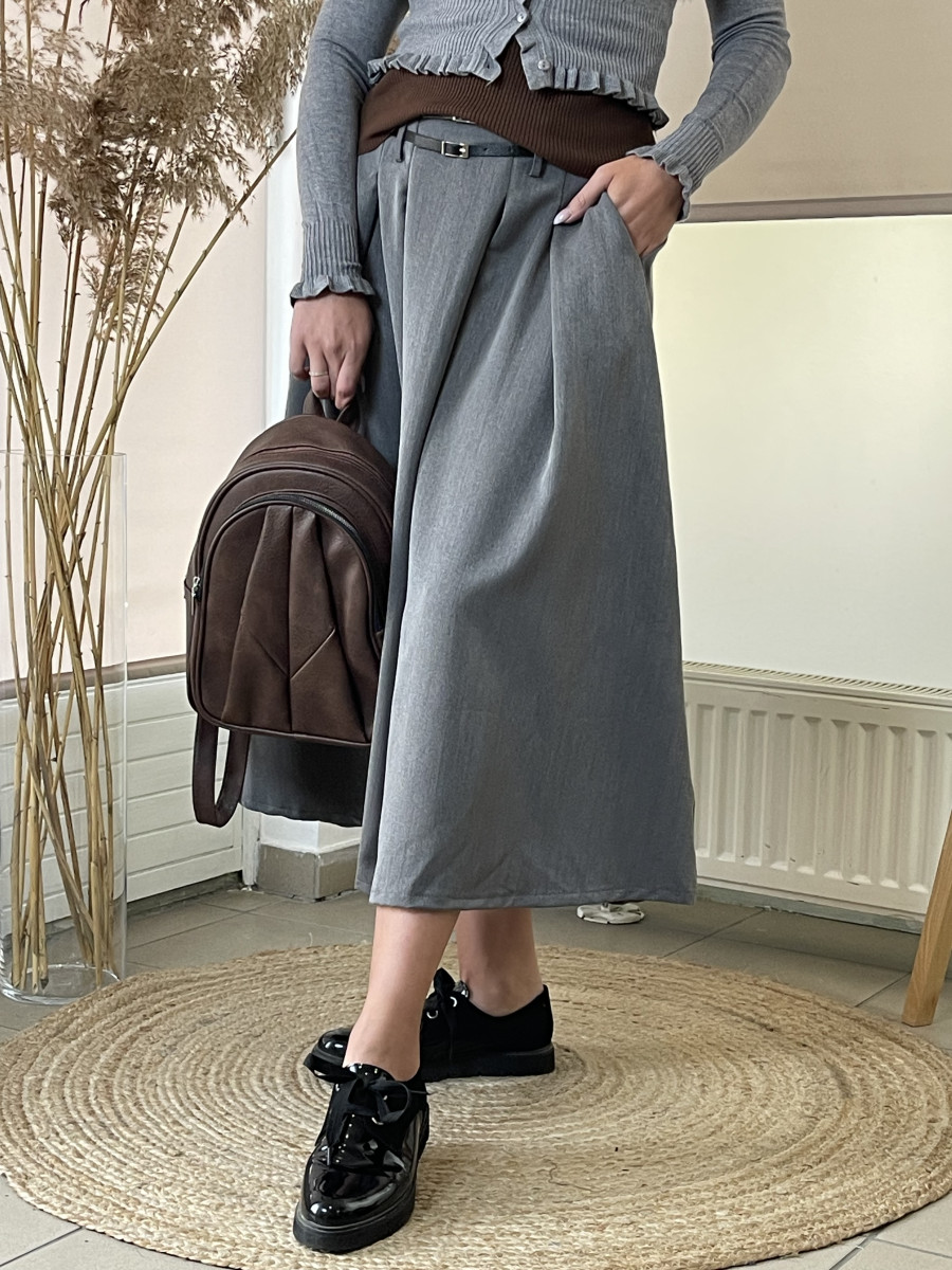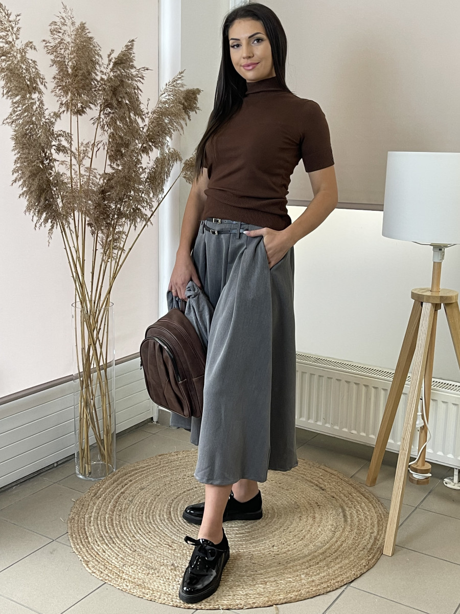 Gumis derekú, oldalán 2 rejtett zsebes, elöl csípő részen csípett, laza esésű, lenge anyagú szoknya .