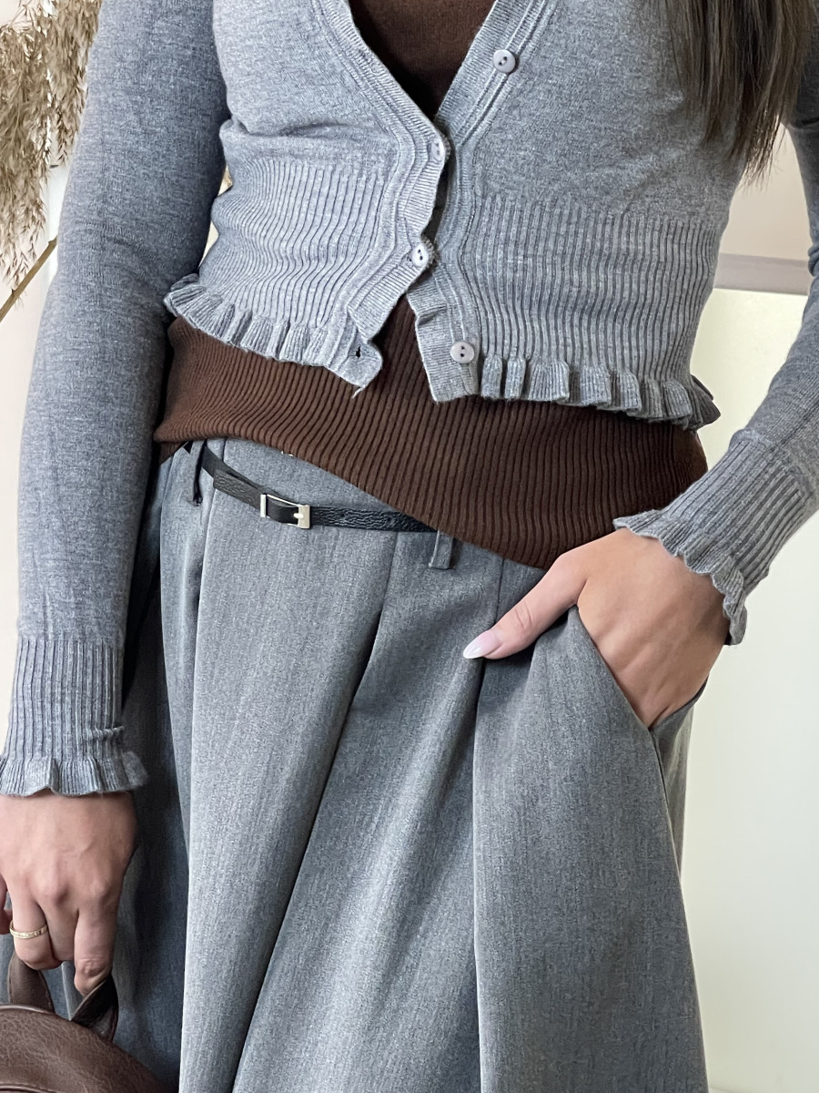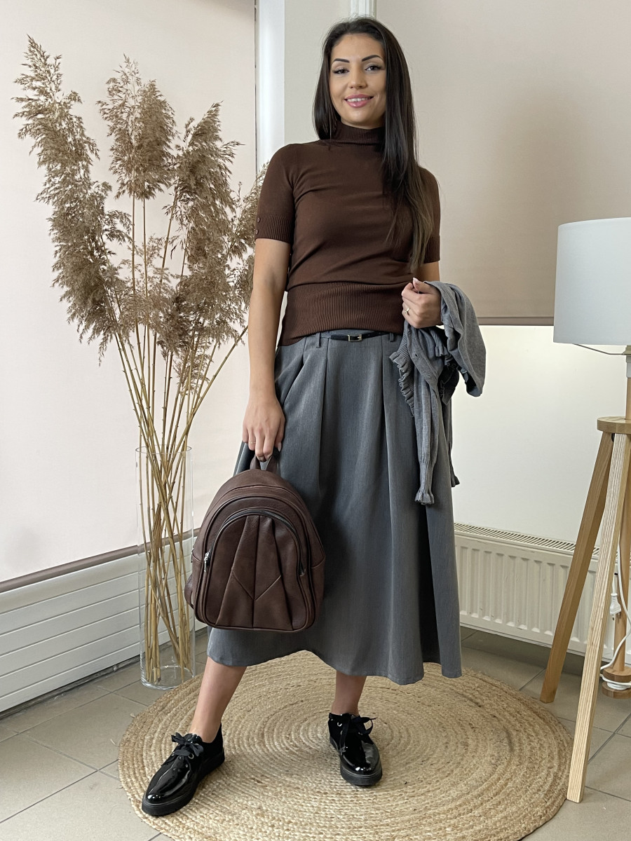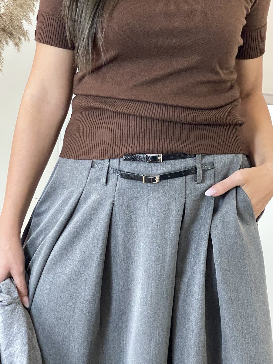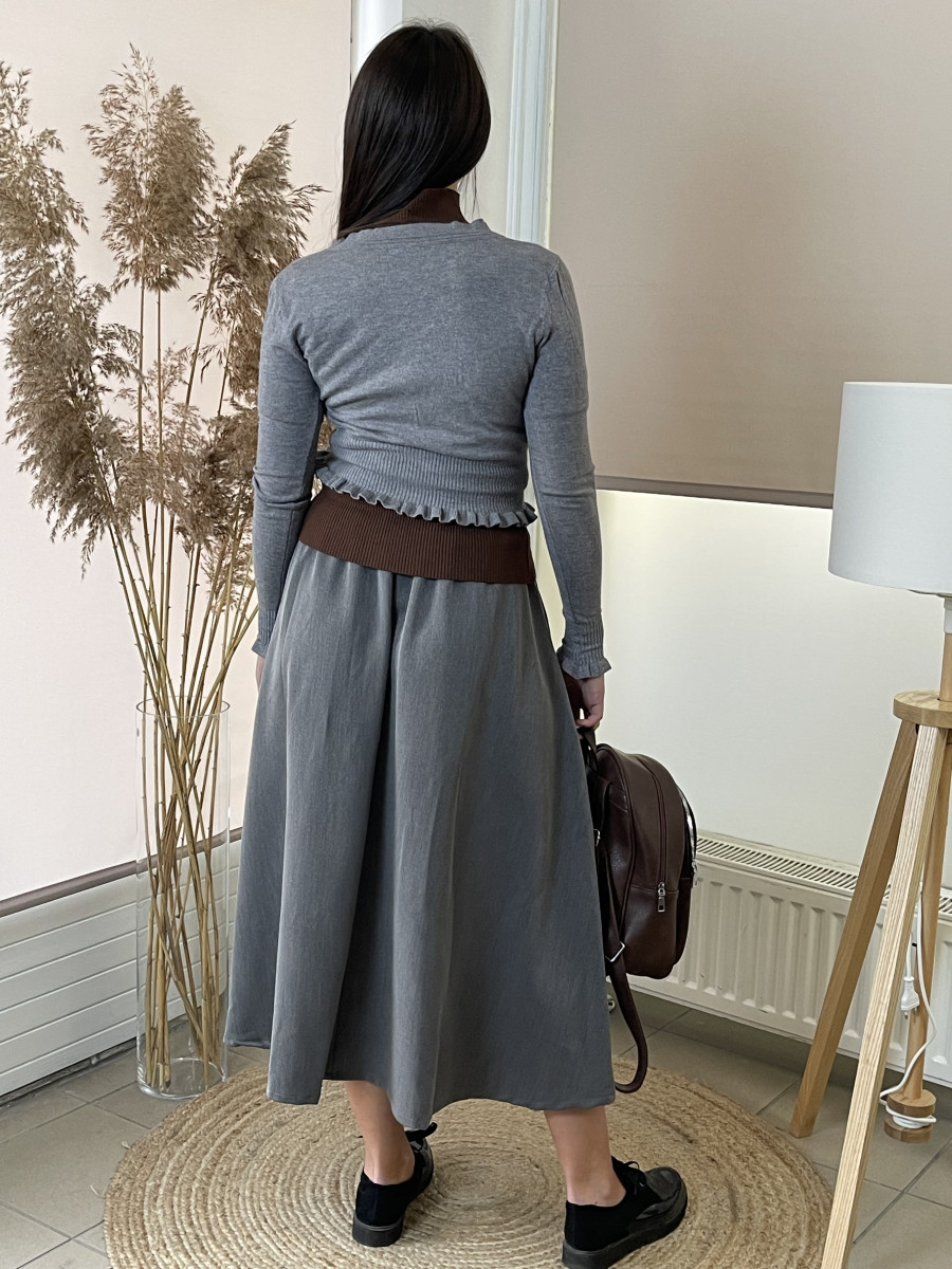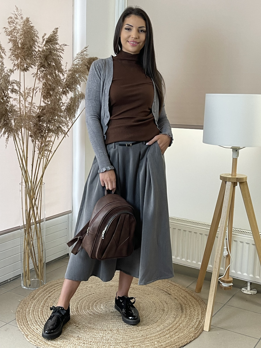 Gumis derekú, oldalán 2 rejtett zsebes, elöl csípő részen csípett, laza esésű, lenge anyagú szoknya .