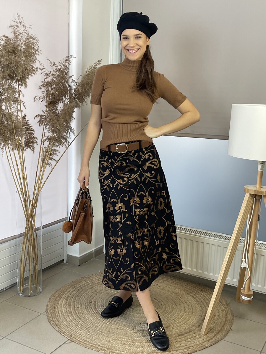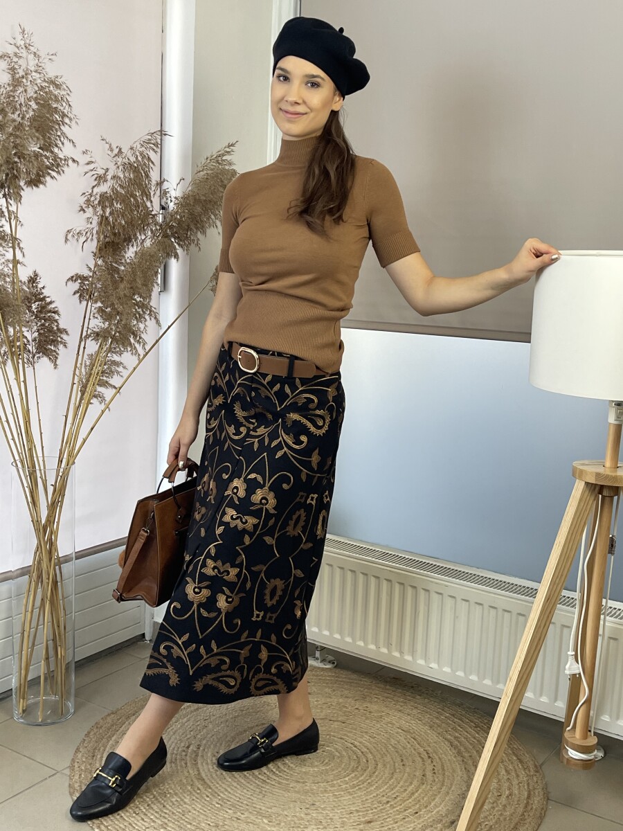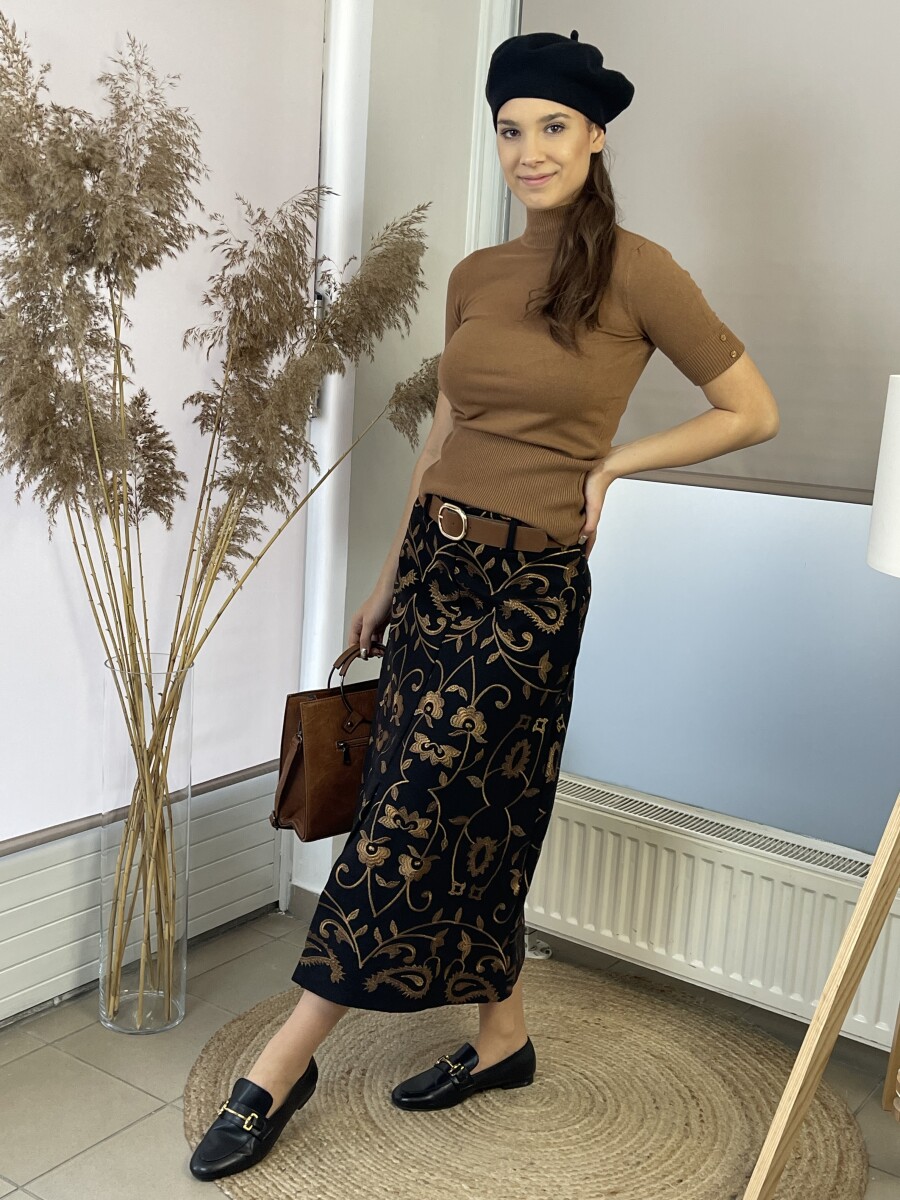 Vastag szövet anyagú, camel cérnával hímzett, elöl felsliccelt, derekán oldalt cipzáras, öves midi szövetszoknya .