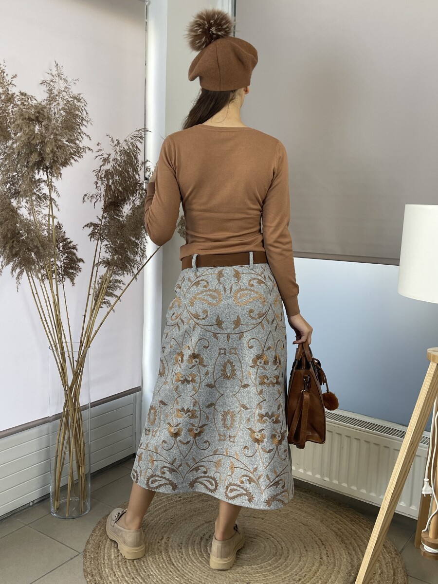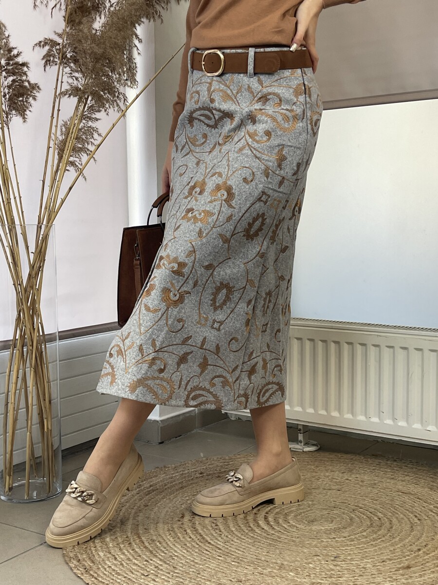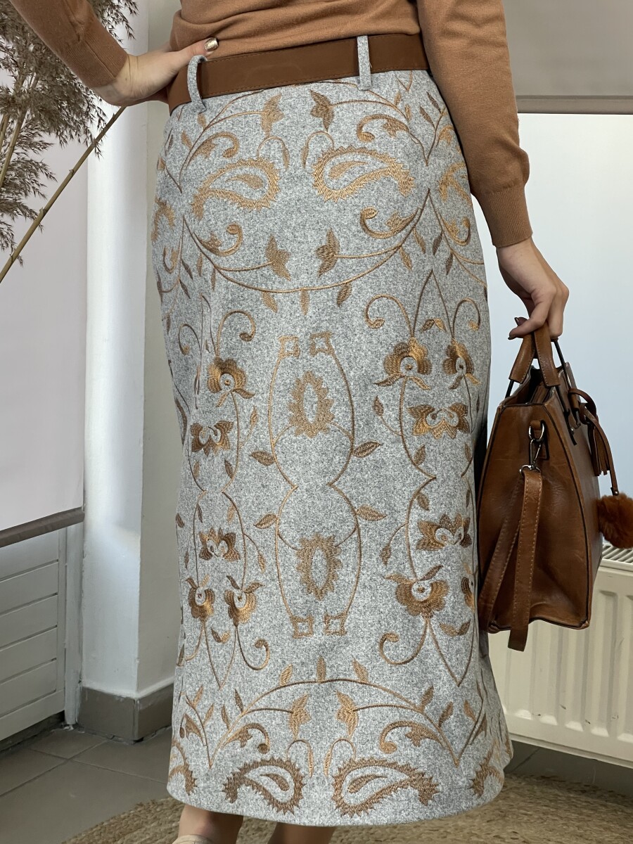 Vastag szövet anyagú, camel cérnával hímzett, elöl felsliccelt, derekán oldalt cipzáras, öves midi szövetszoknya .