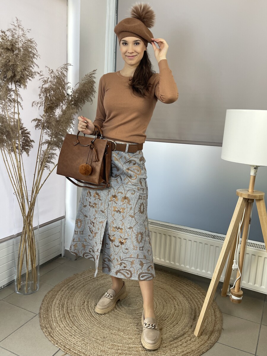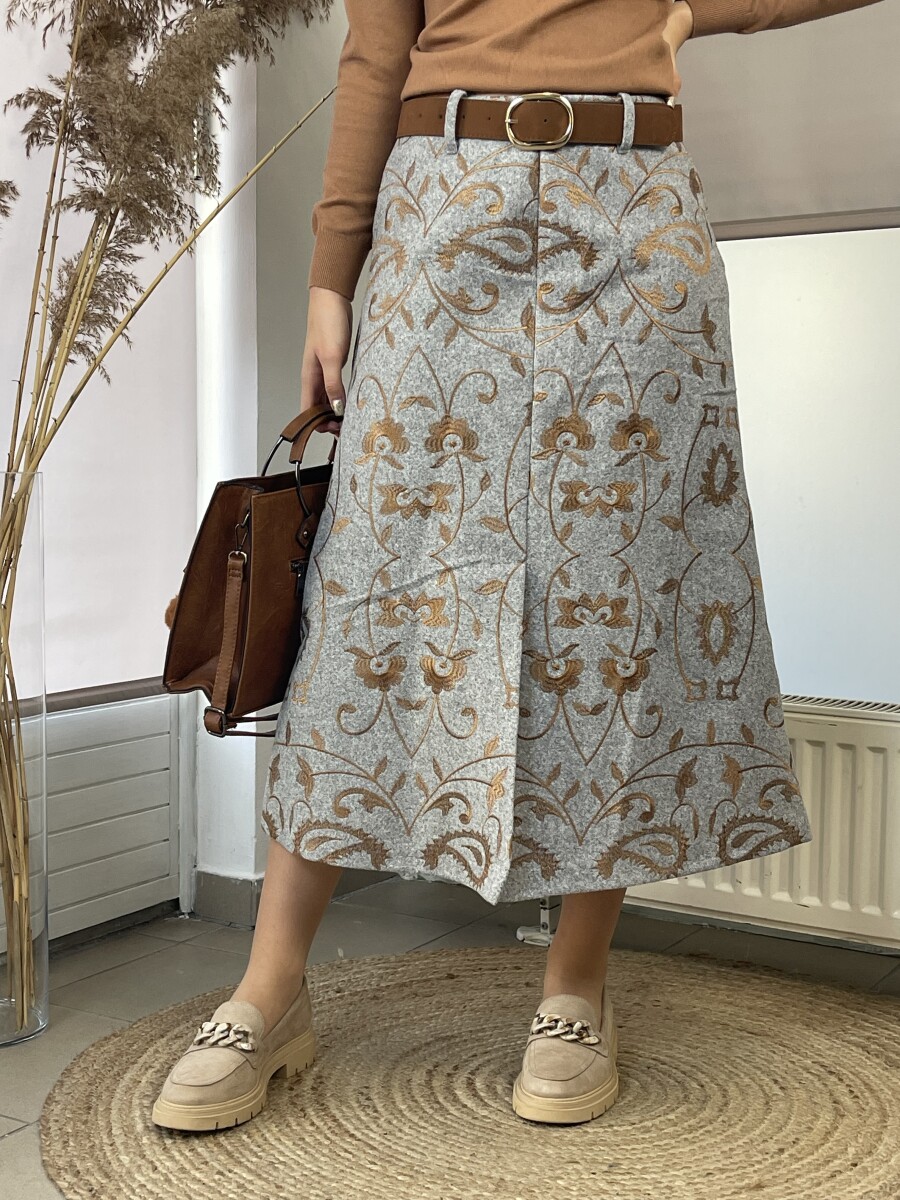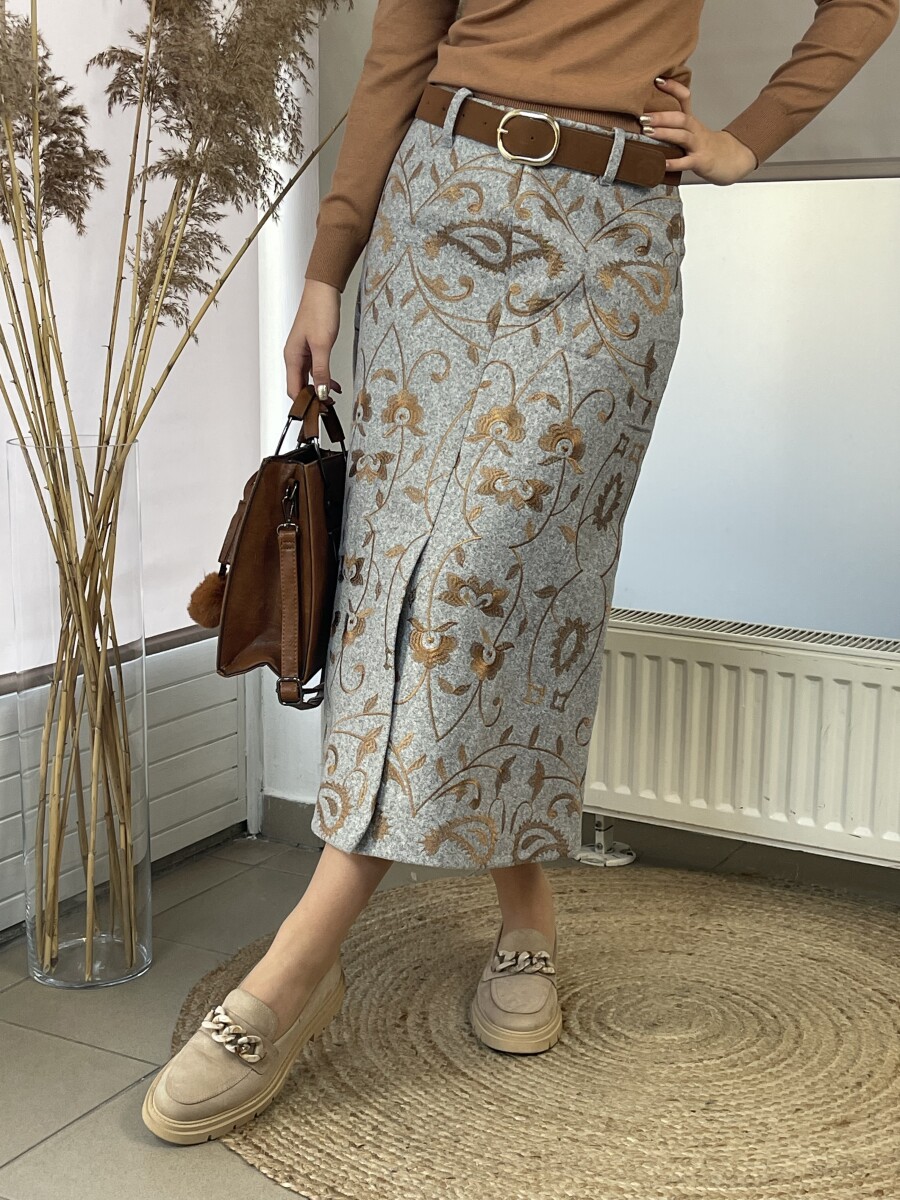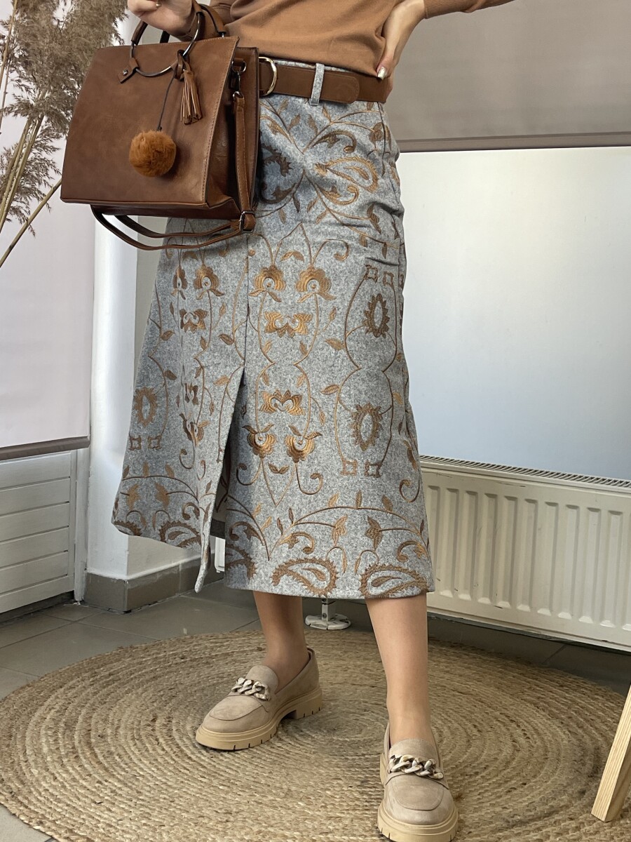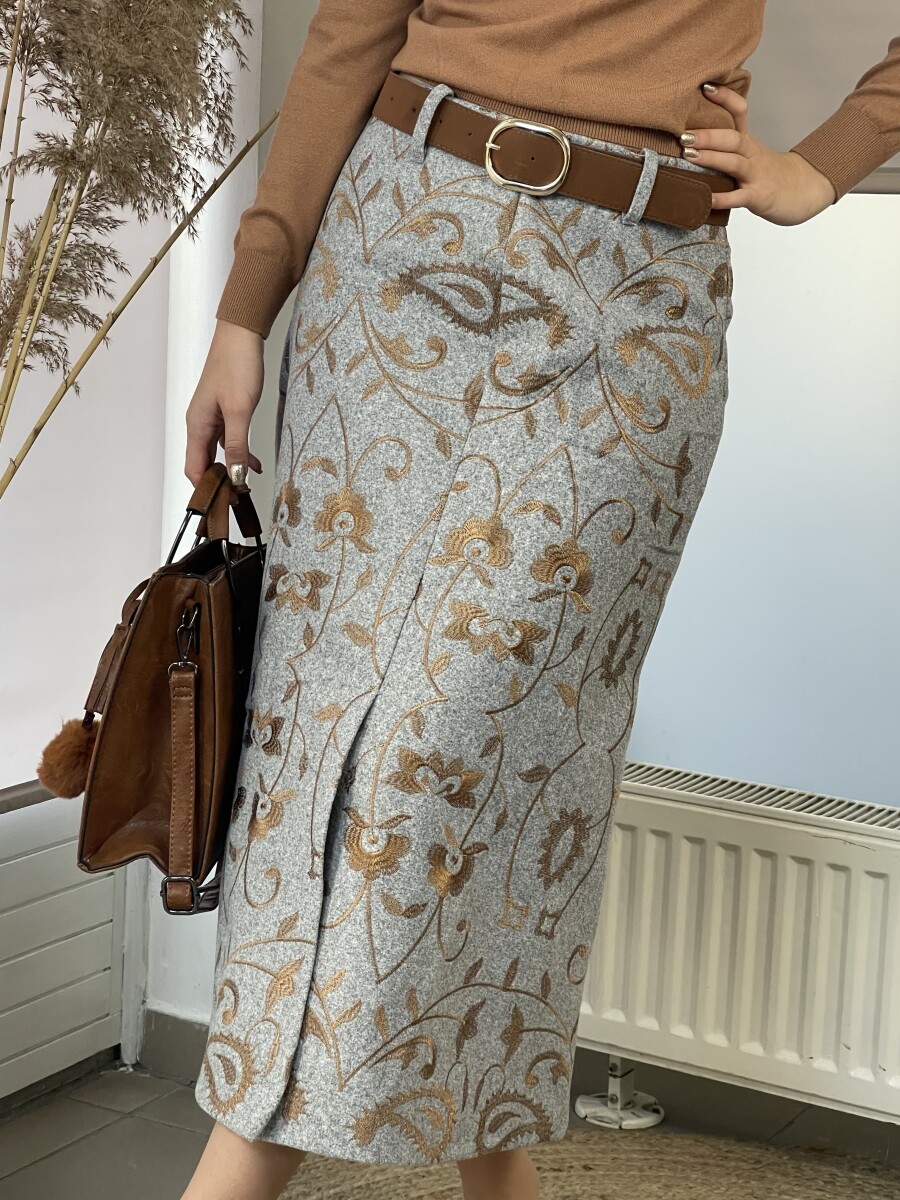 Vastag szövet anyagú, camel cérnával hímzett, elöl felsliccelt, derekán oldalt cipzáras, öves midi szövetszoknya .