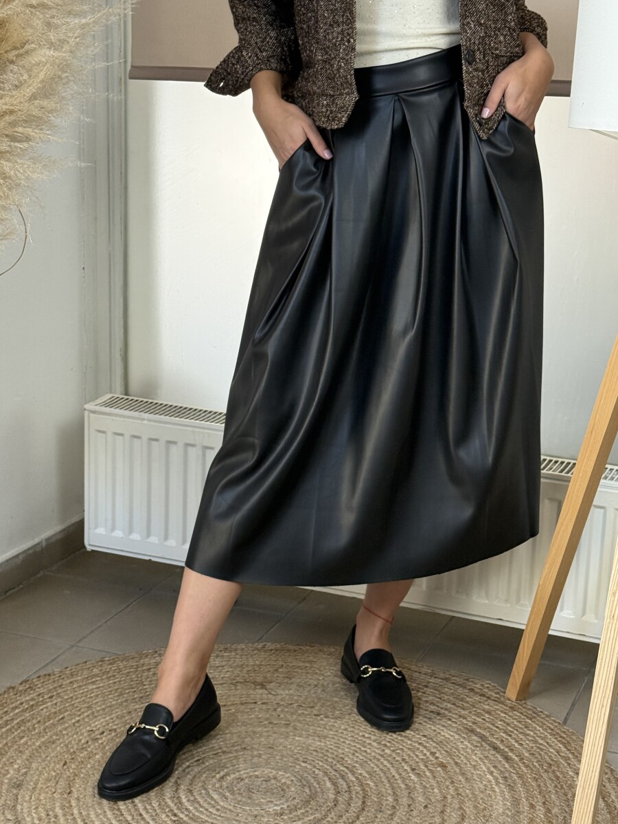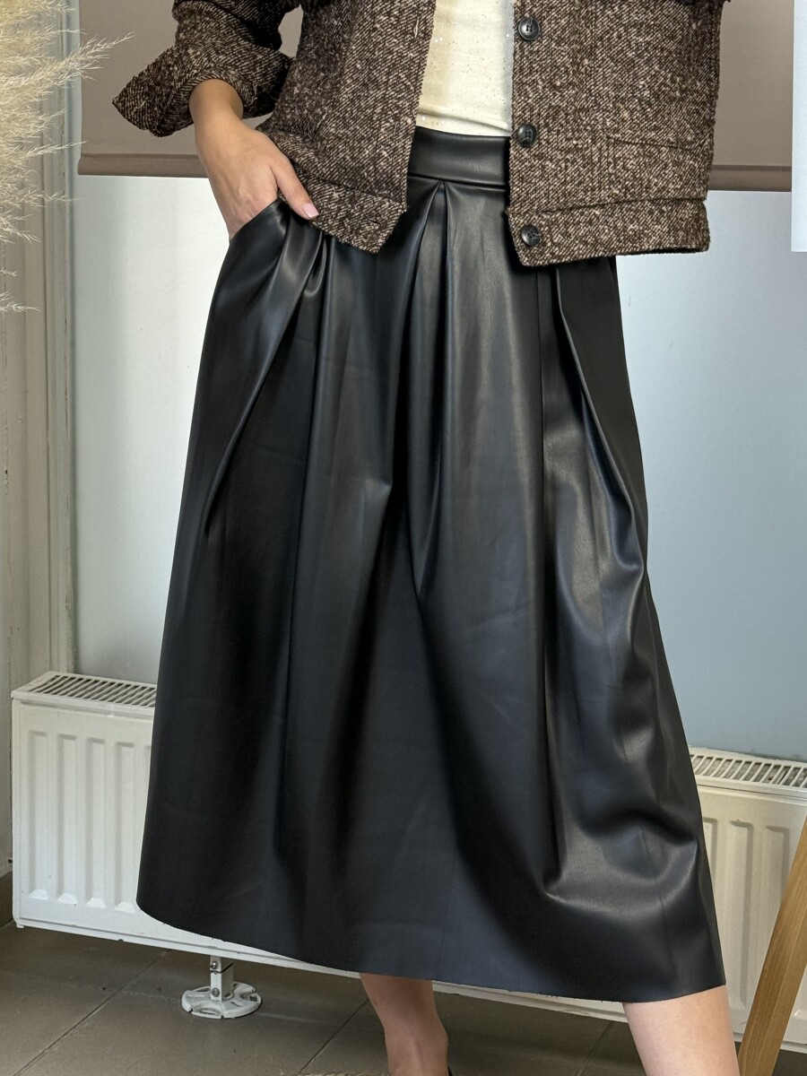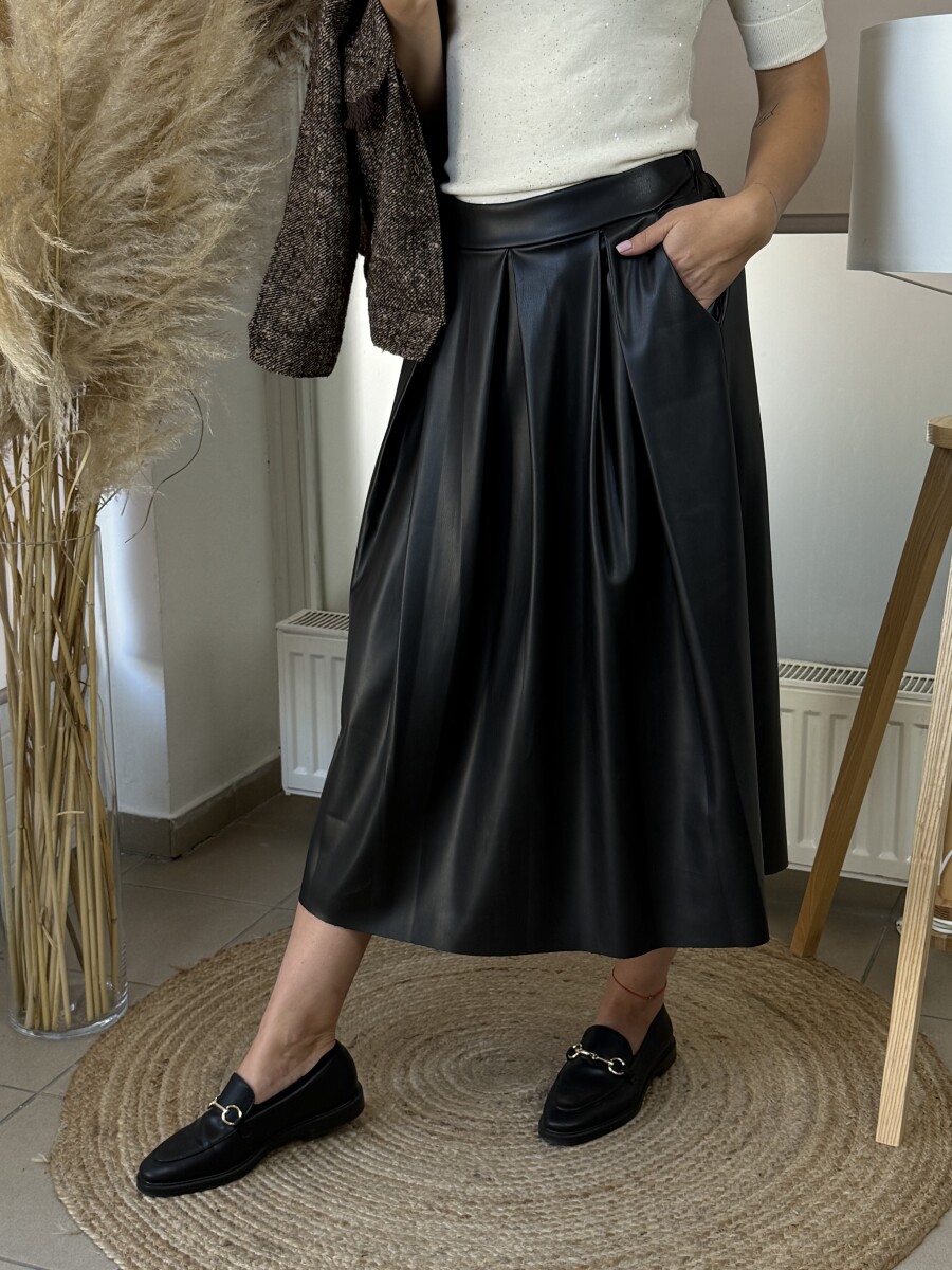 Gumis derekú, oldalán 2 vágott zsebes, elöl csípő részen csípett, laza esésű, alján lézervágott, műbőr anyagú midi szoknya .