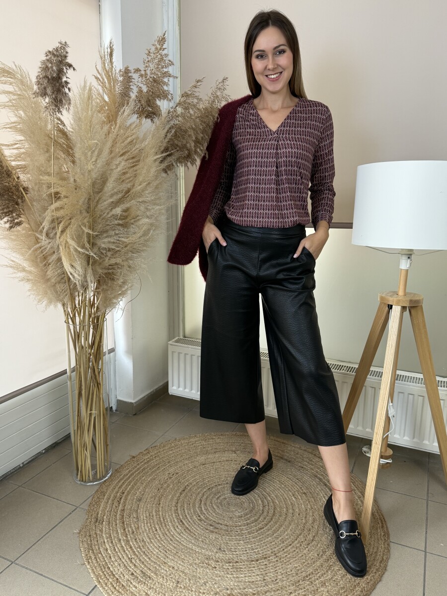 Magasderekú, ¾-es hosszúságú, lefelé bővülő szárú, derék részen egy oldalt cipzáros, svédzsebes, műbőr nadrágszoknya .